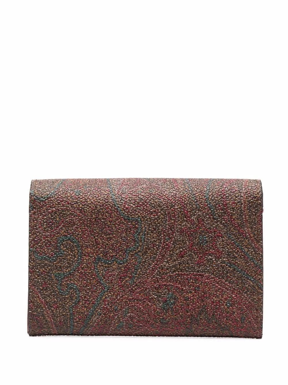 Motif cachemire, dessus à rabat avec bouton pression, fentes pour carte intérieures. Couleur : marron.