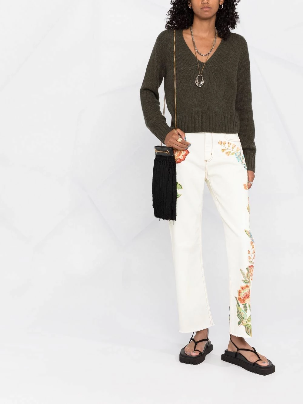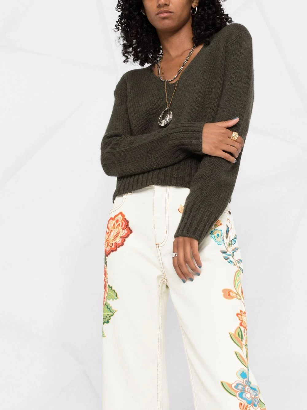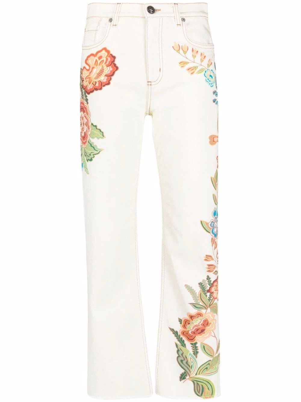 Motif de fleurs, coupe droite, poches latérales fendues, poches arrière plaquées.