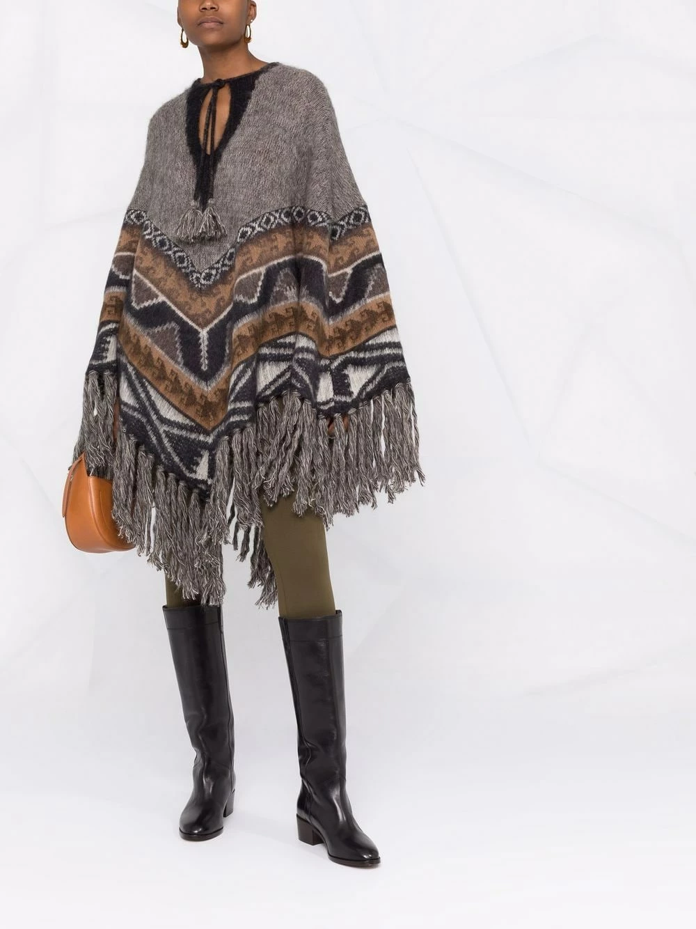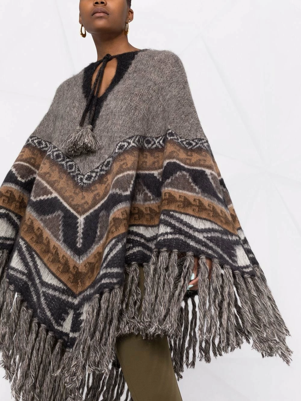 Motif jacquard, détail de pompon, finition à franges, col v, détails drapés.