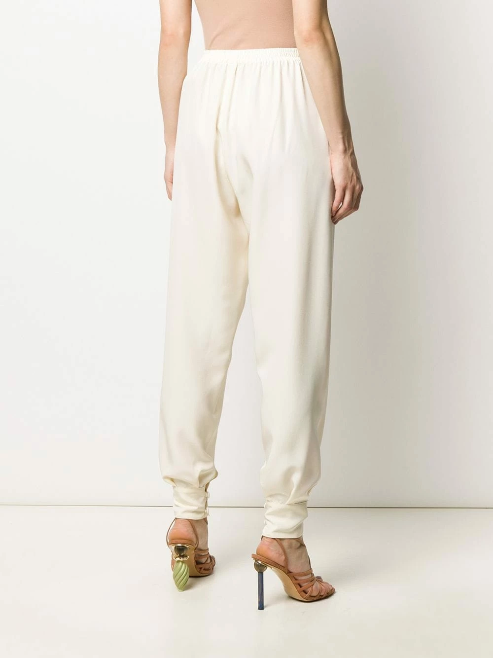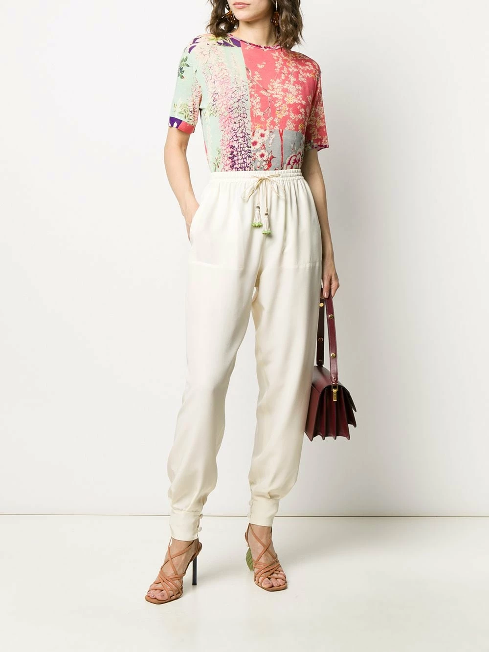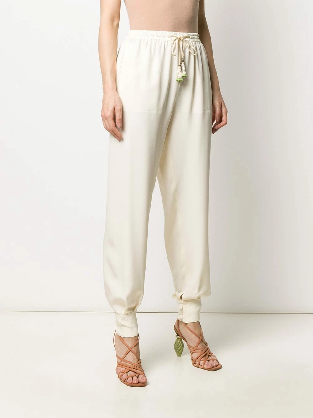 Pantalon à lien de resserrage en soie Etro avec pompons, taille élastiquée à lien de resserrage, poches latérales, poignets élastiqués et forme détendue.