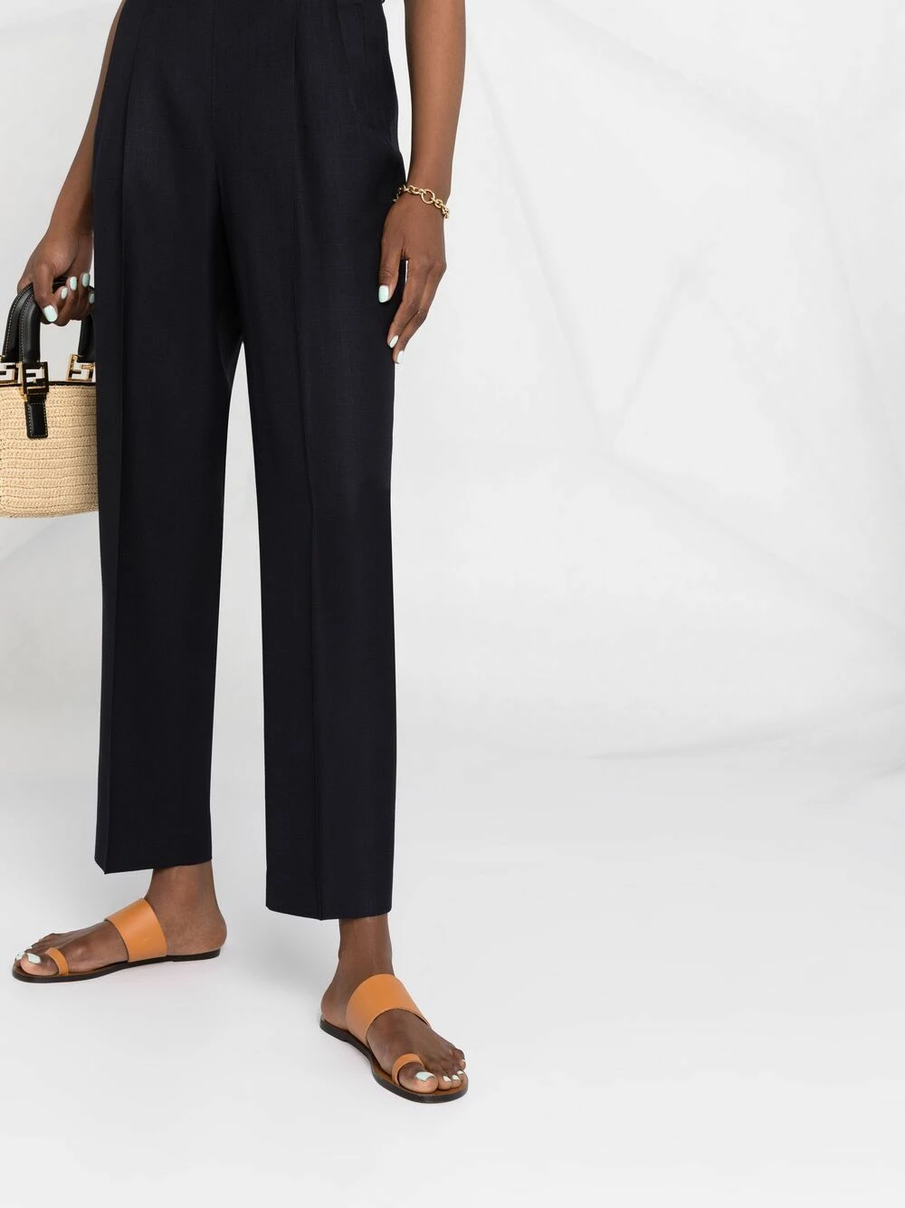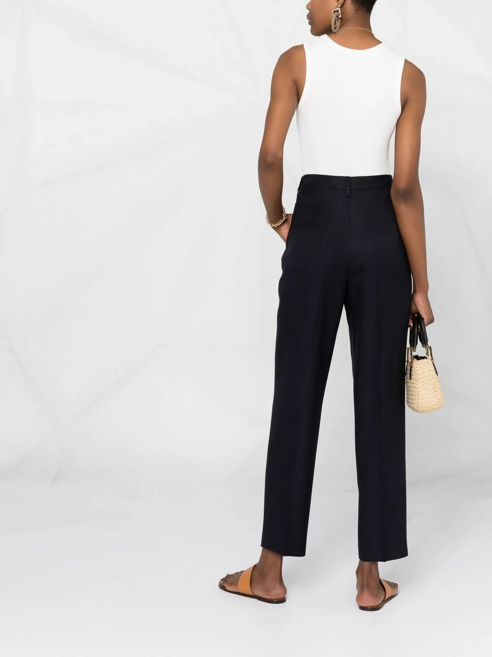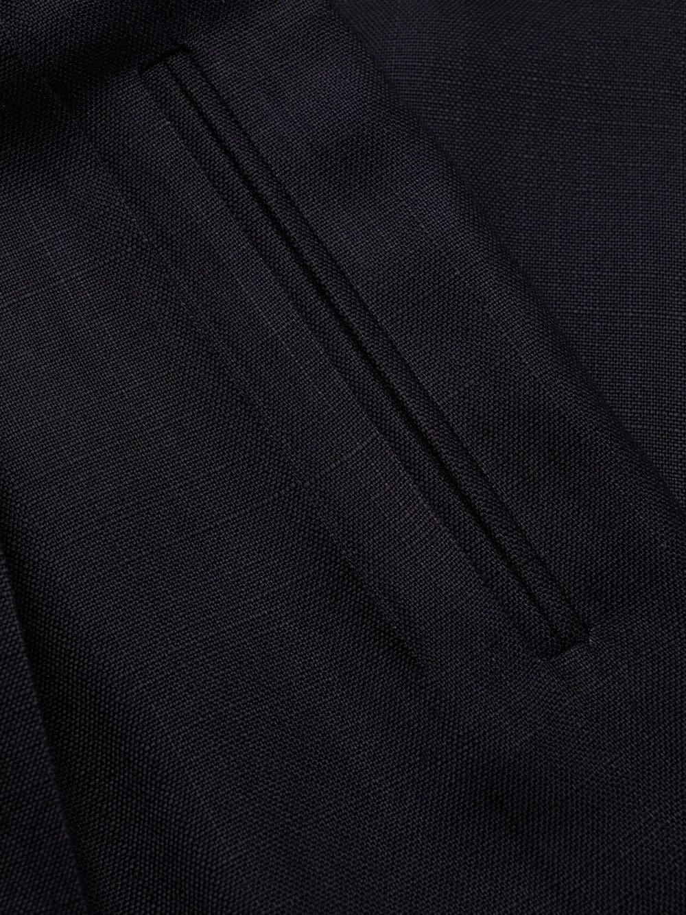 Passants de ceinture, deux poches latérales fendues, coupe fuselée. Couleur : bleu.