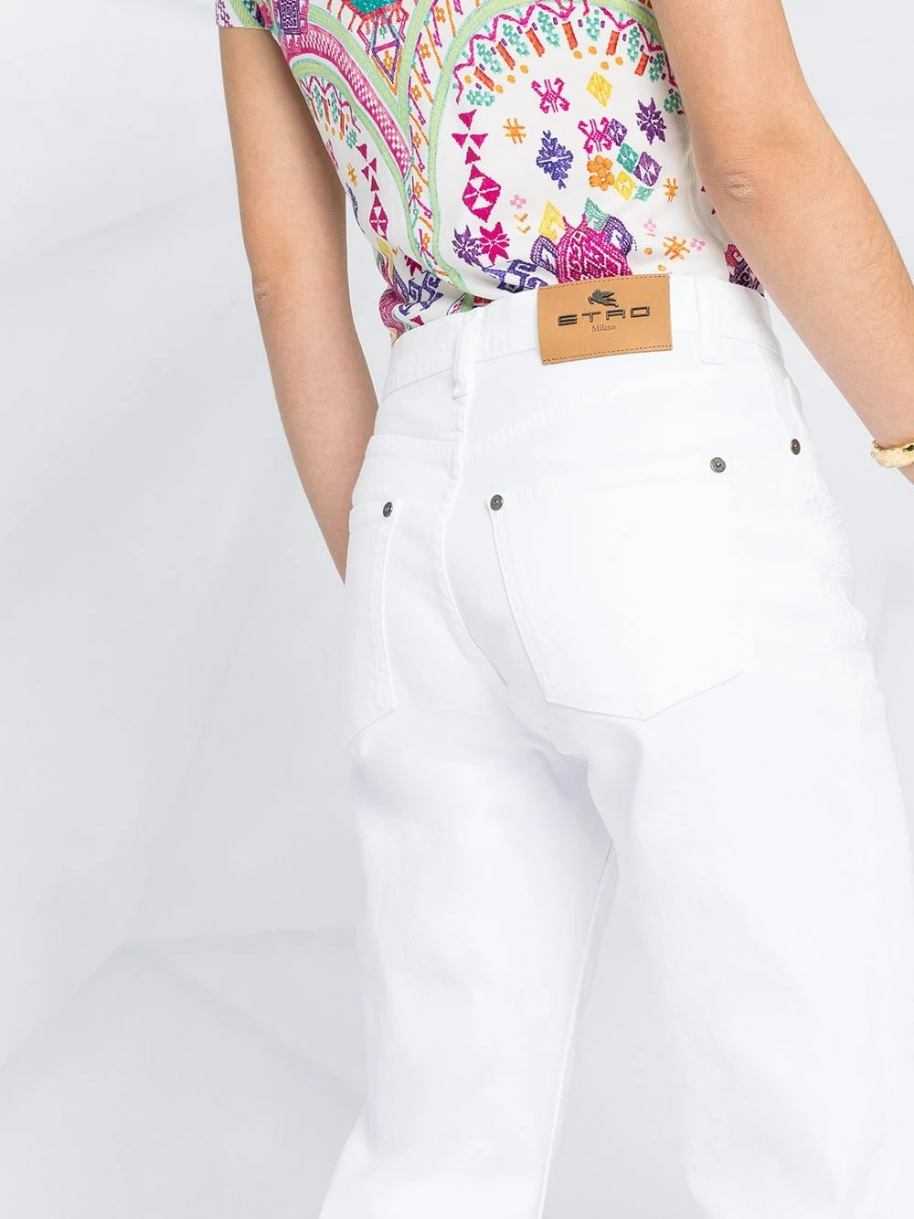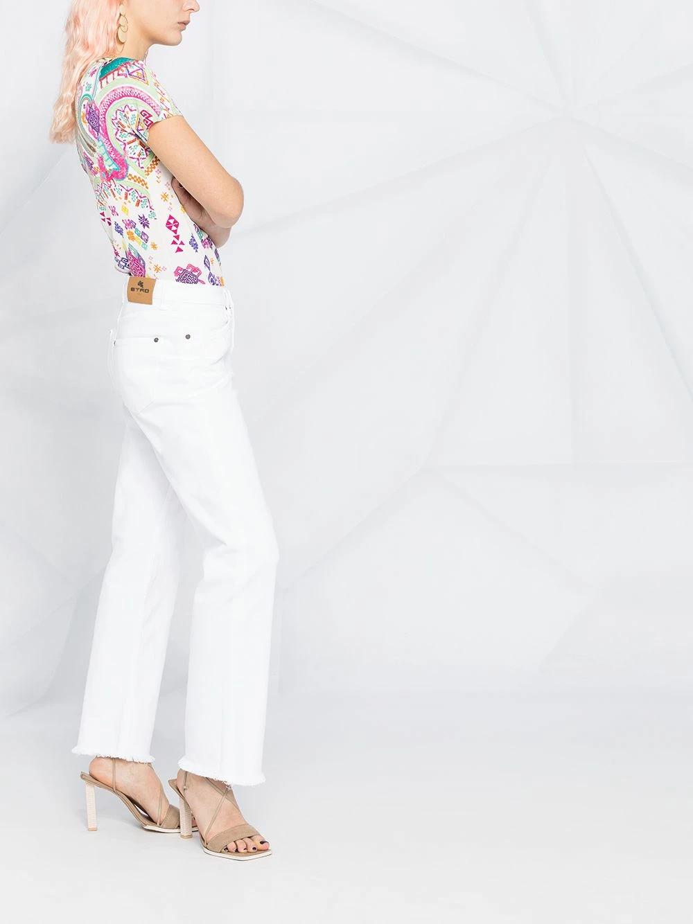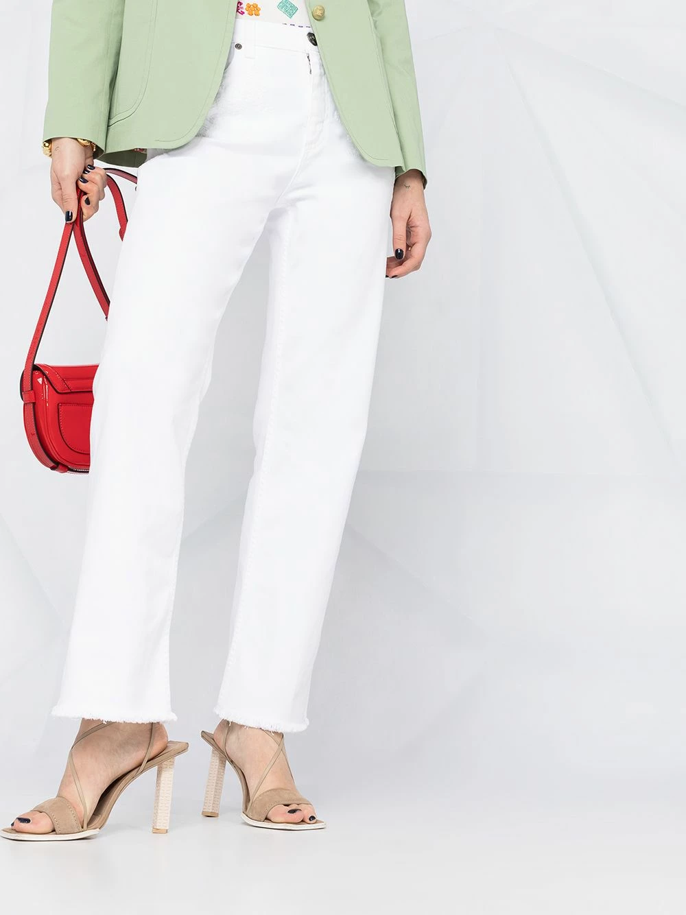 Taille mi-haute, coupe ample, bords frangés, 5 poches classiques, passants de ceinture, boutonnière sur le devant. Couleur : blanc.