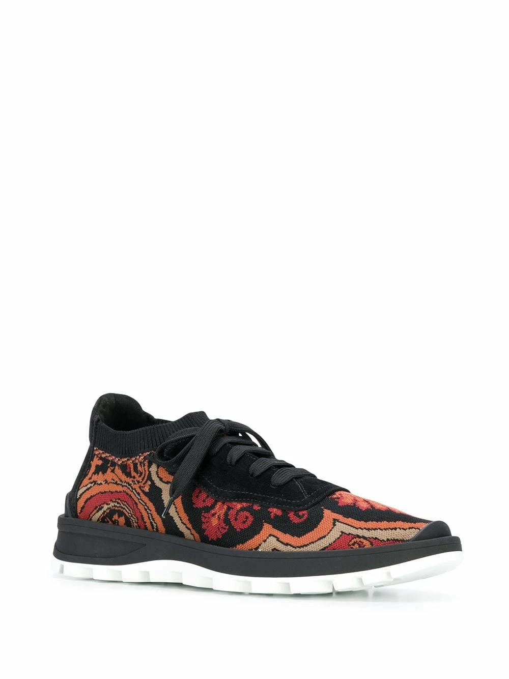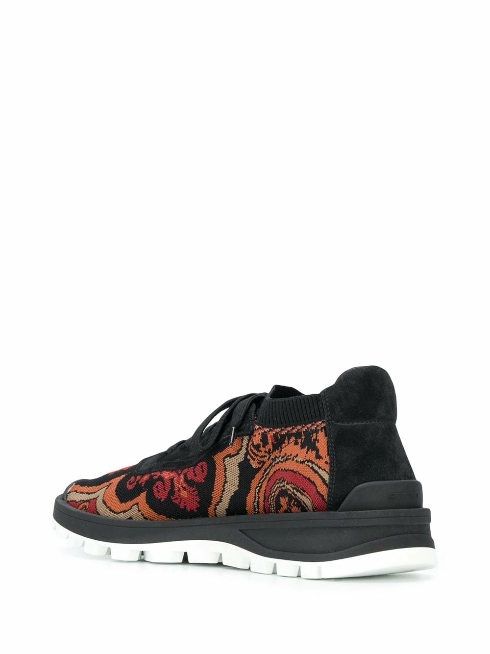Baskets à empiècements contrastants Etro avec semelle intérieure à logo, semelle en caoutchouc blanc, imprimé graphique, empiècements contrastants et laçage sur le devant. Couleur : noir.