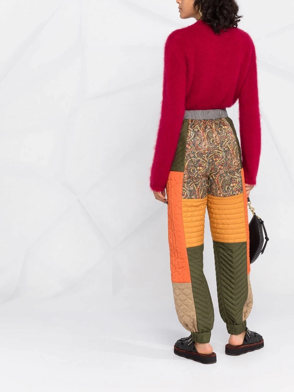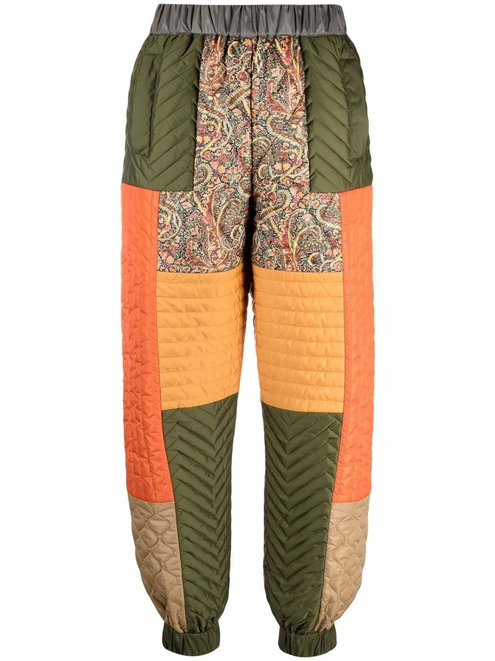 Design patchwork, ceinture élastique, deux poches latérales fendues, coupe slim, chevilles élastiques.