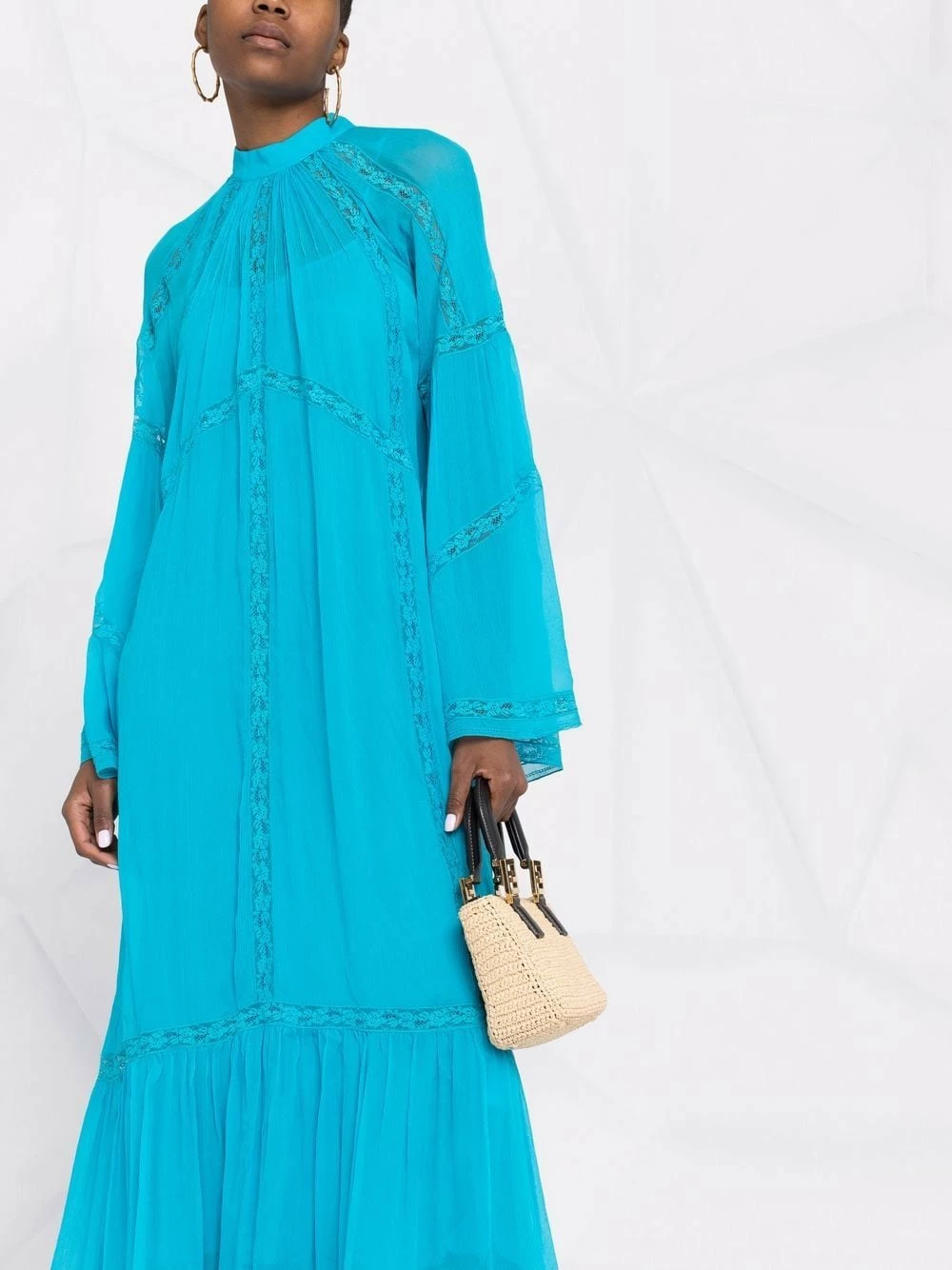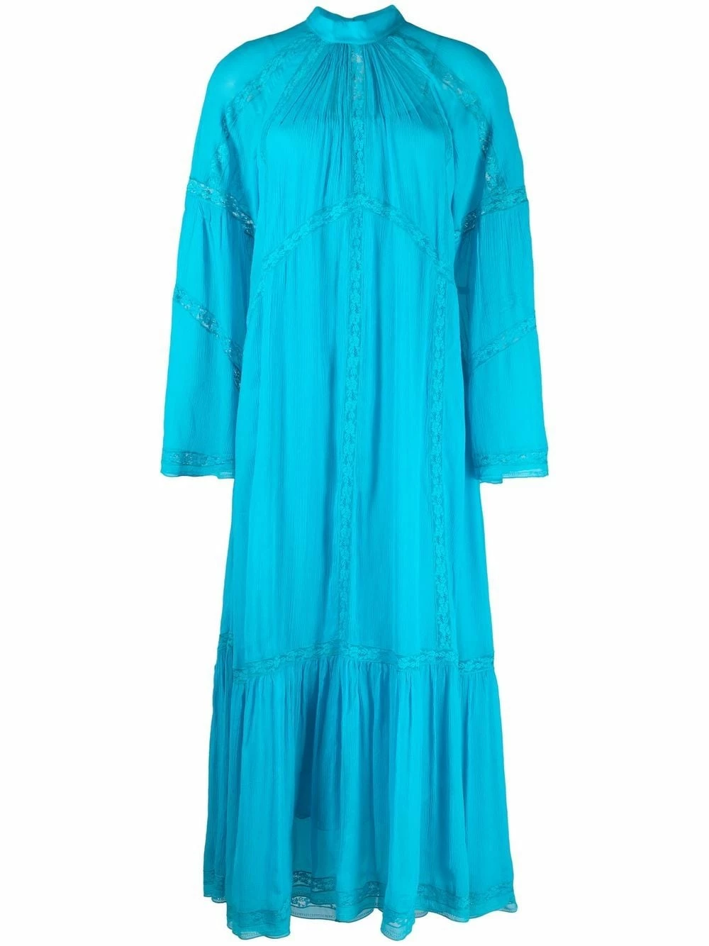 Design ton sur ton, encolure ronde, manches longues, empiècements en dentelle, détails de fronces, ourlet volanté. Couleur : bleu. Matière : soie.