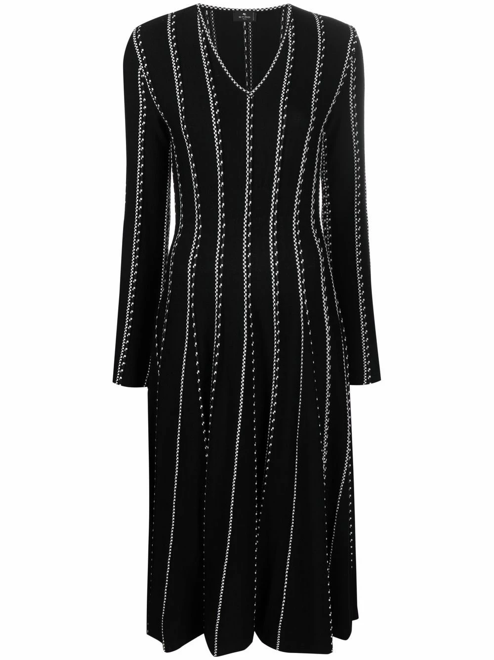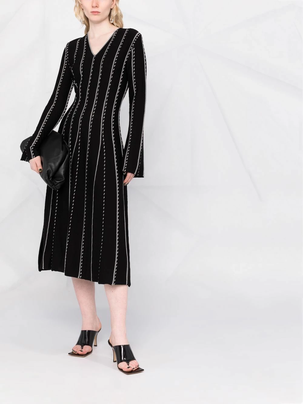 Maille fine, col v, manches longues amples, taille ajustée, coupe évasée, longueur midi.