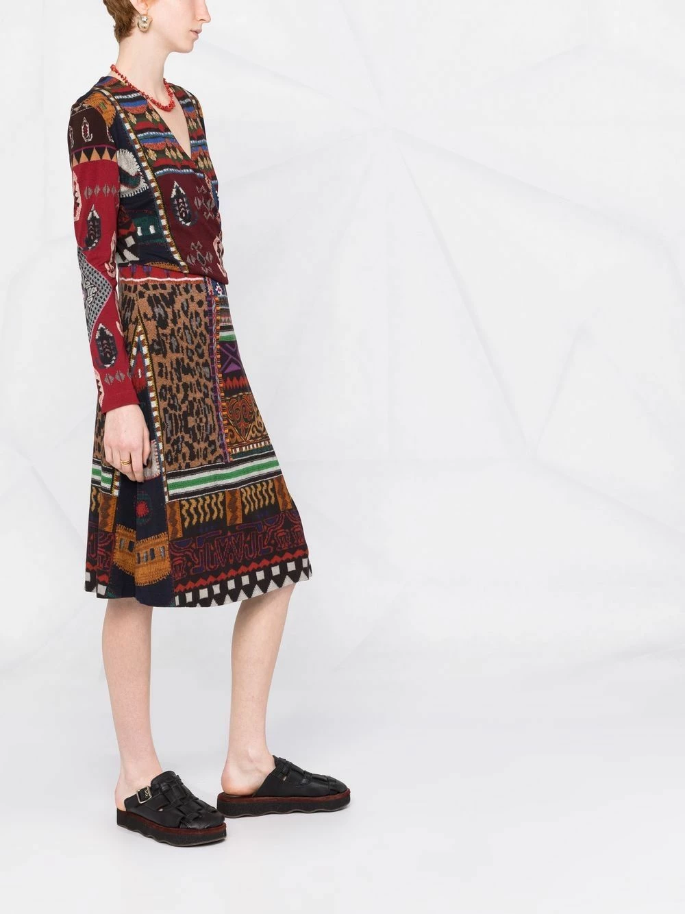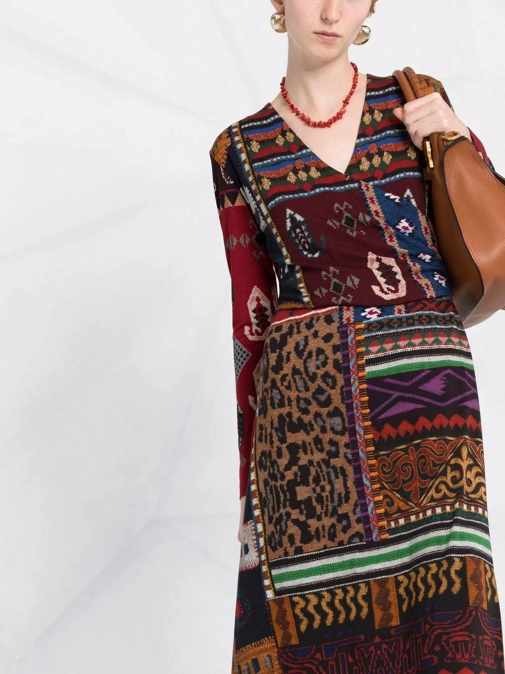 Design patchwork, jacquard à motifs, design en maille, construction stretch, col v, design portefeuille, manches longues, coupe trapèze, coupe mi-longue, fermeture arrière dissimulée. Couleur : multicolore.