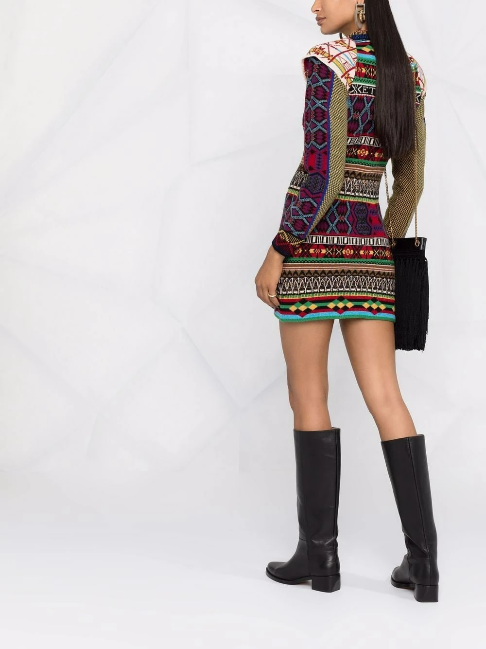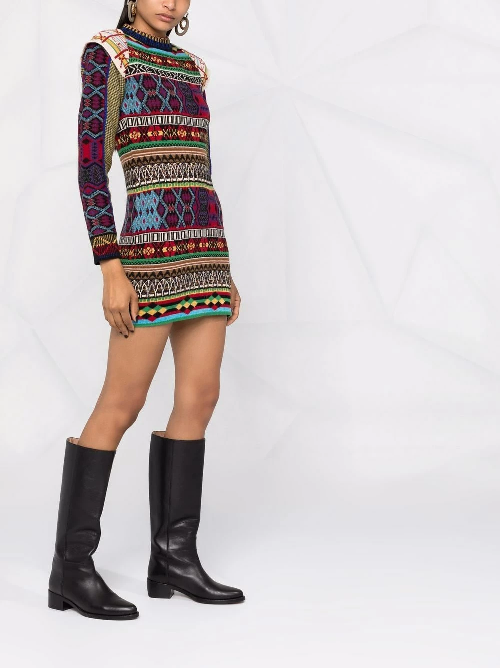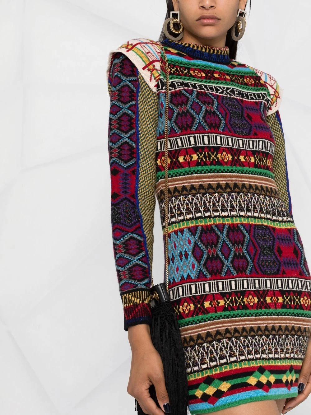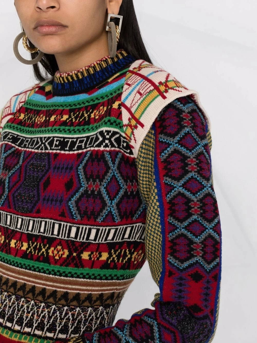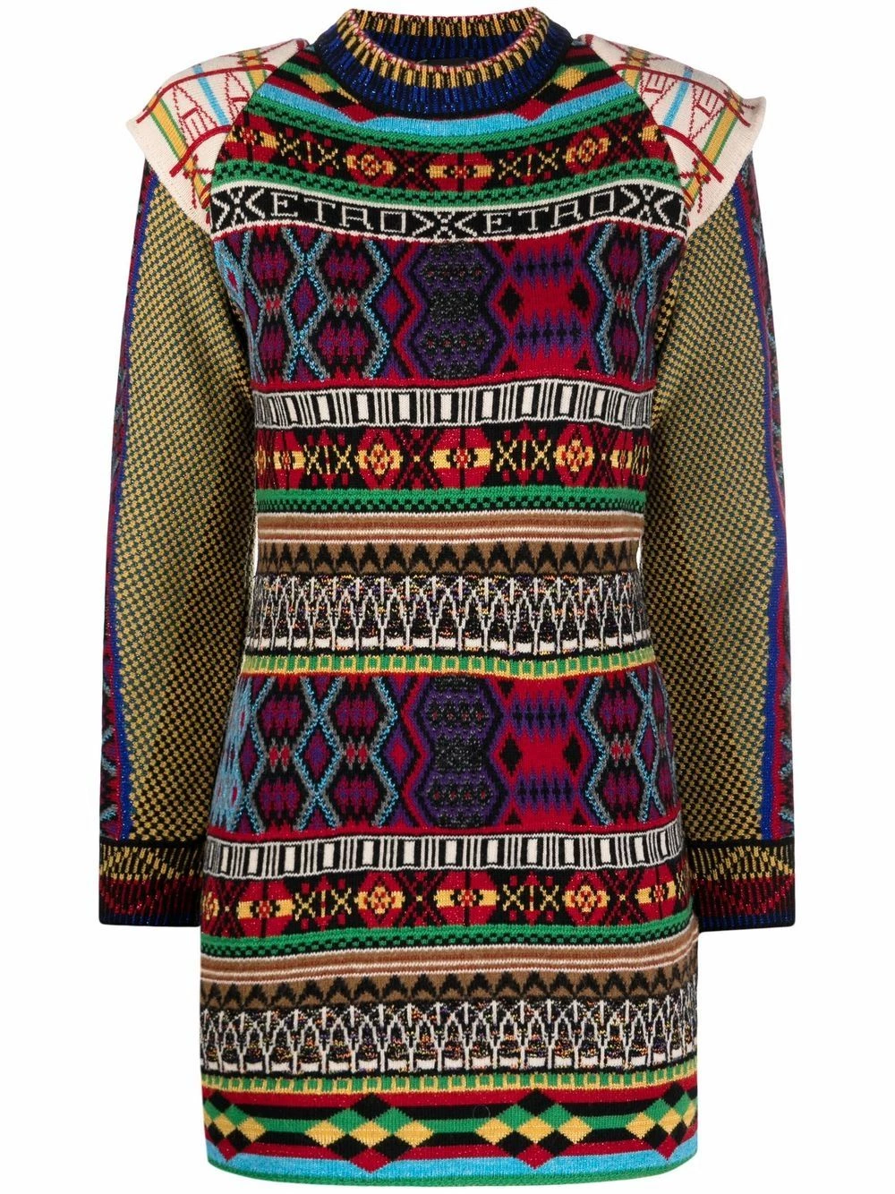 Mélange d’imprimés, motif intarsia, encolure ronde, manches longues, coupe évasée. Couleur : multicolore.