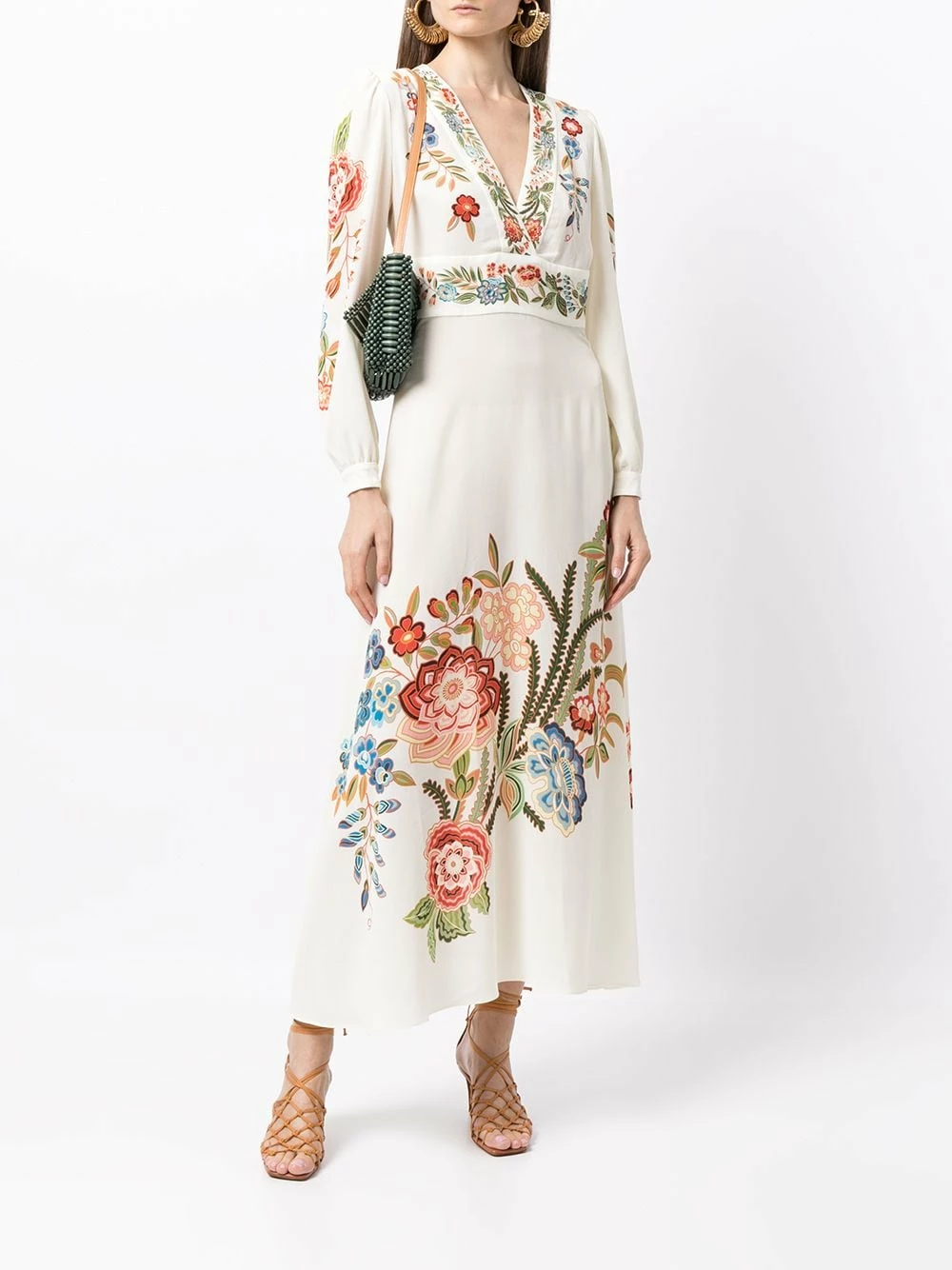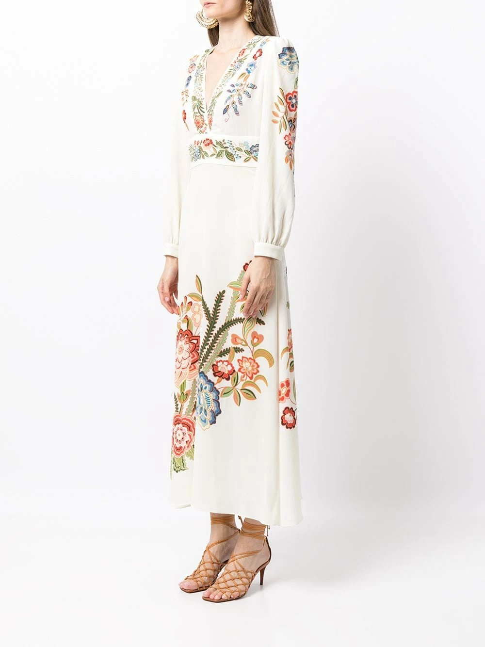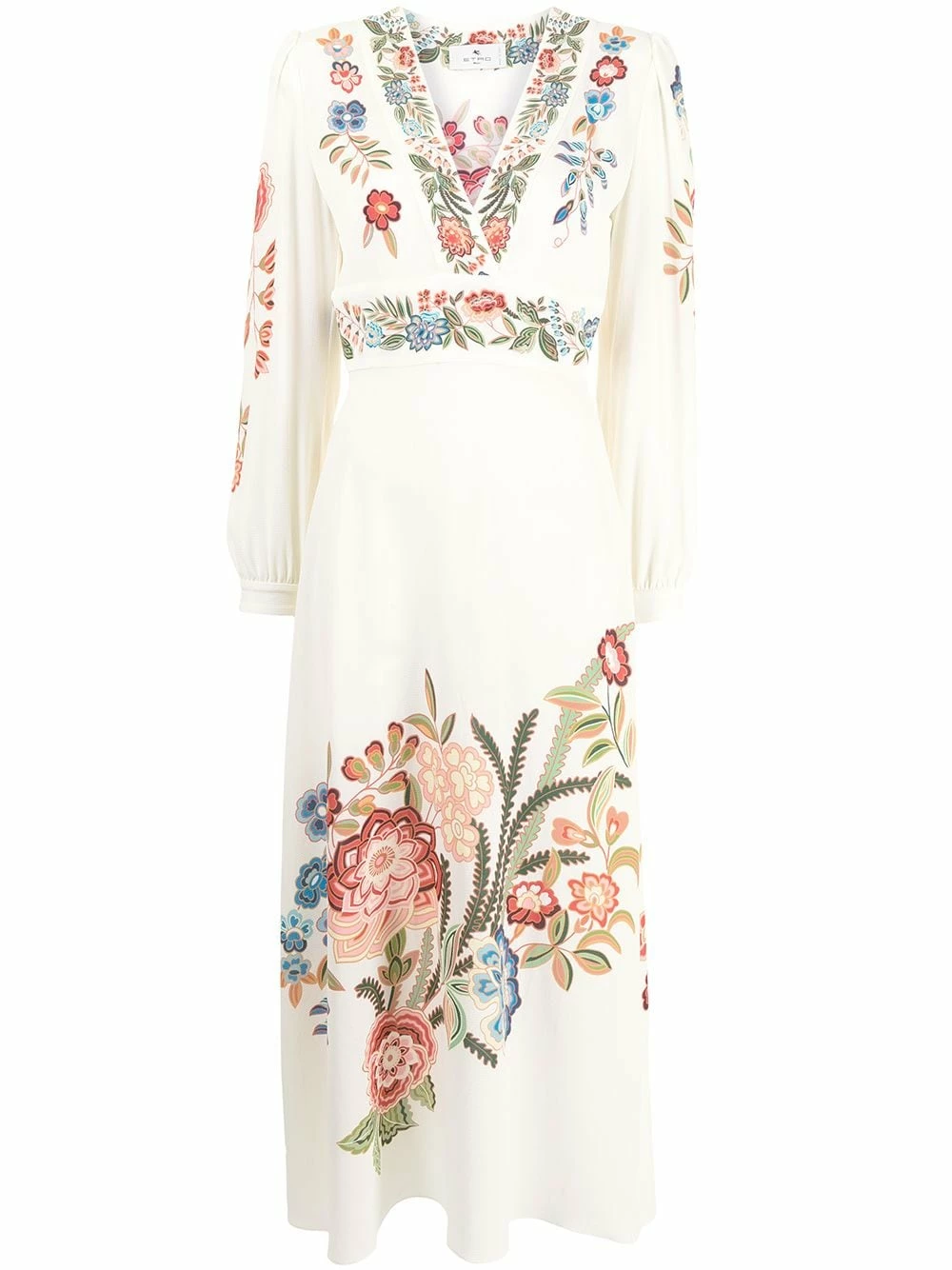 Motif de fleurs, col v, taille empire, manches longues, fermeture dissimulée sur le côté, ourlet droit.