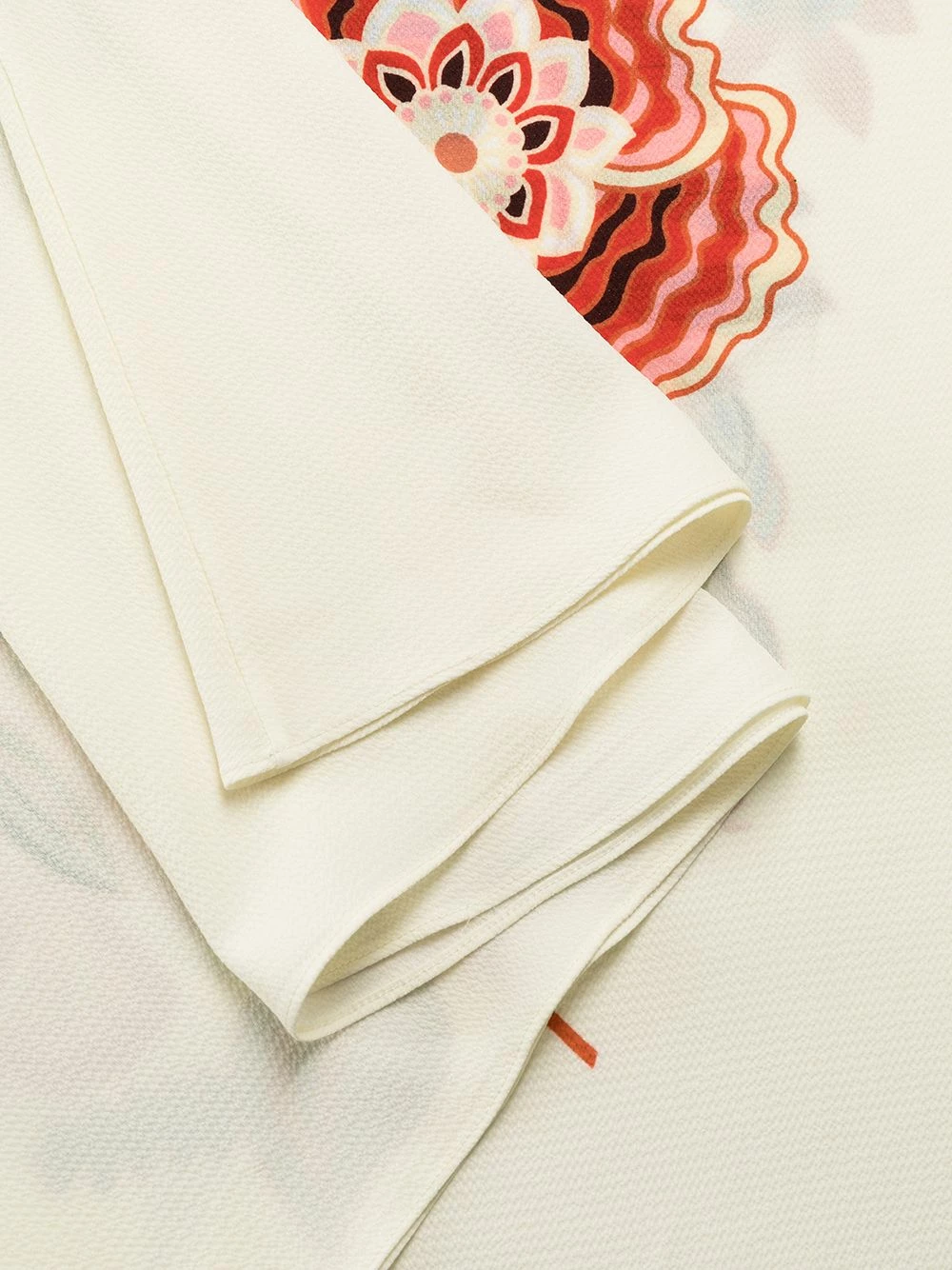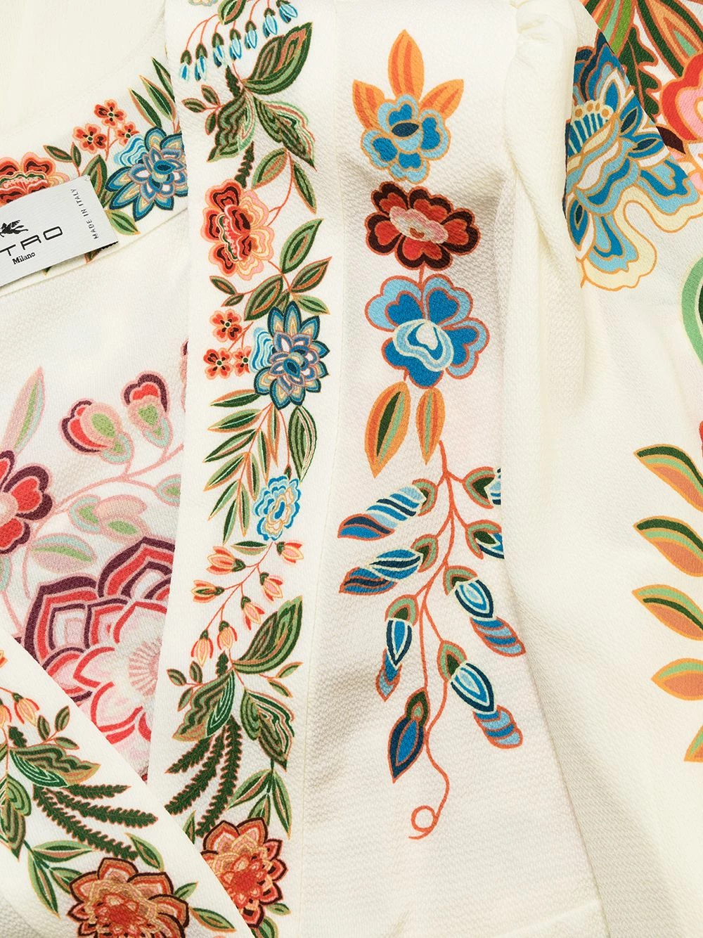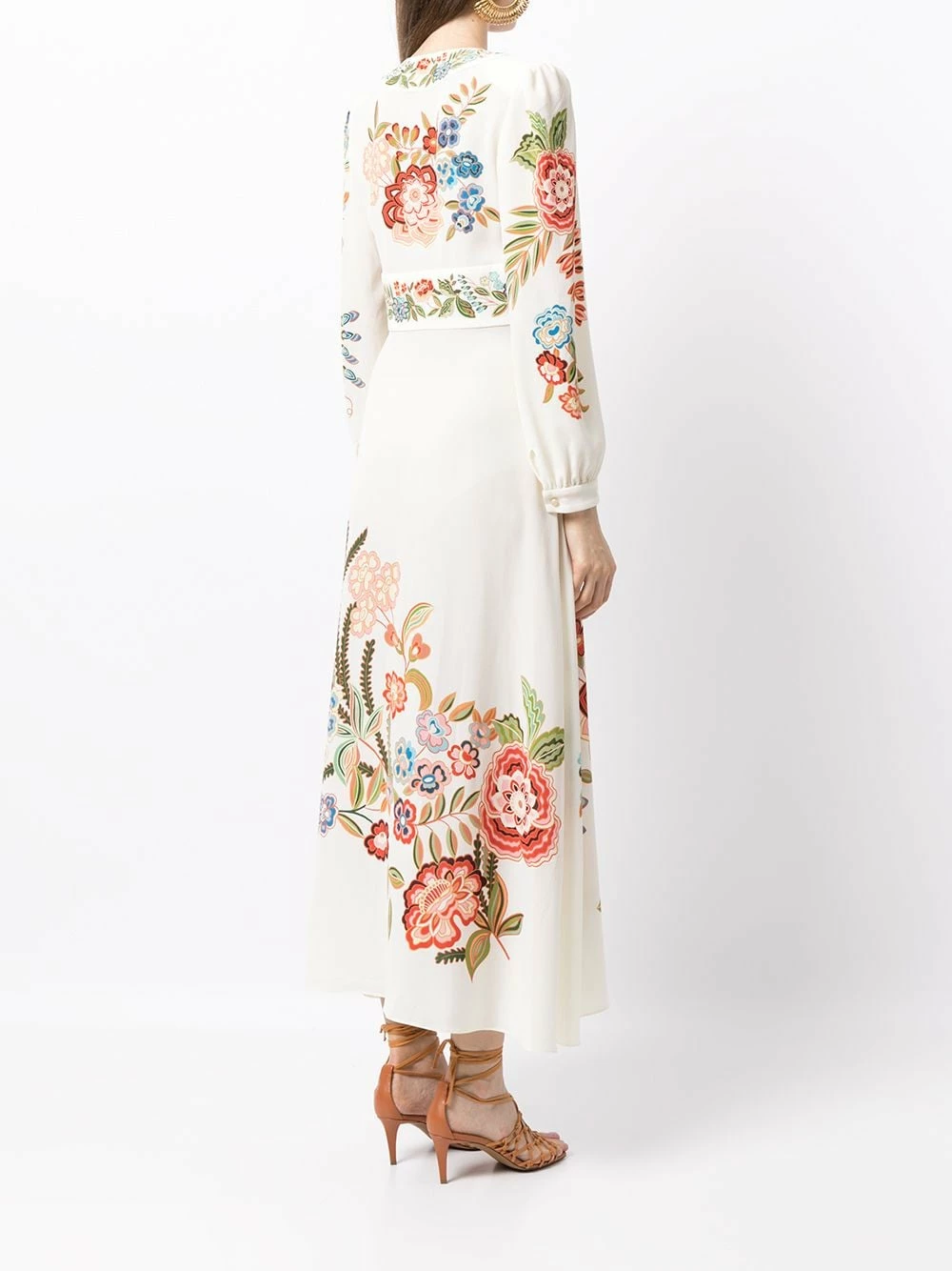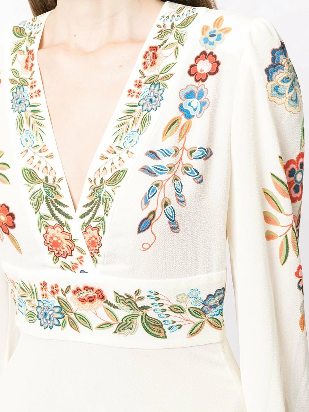Motif de fleurs, col v, taille empire, manches longues, fermeture dissimulée sur le côté, ourlet droit.