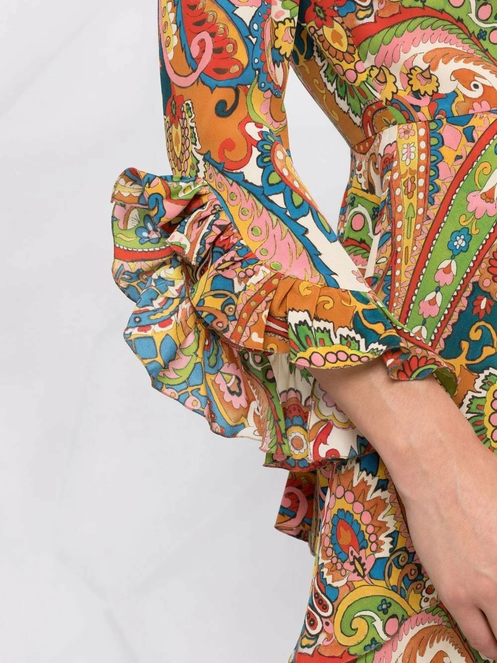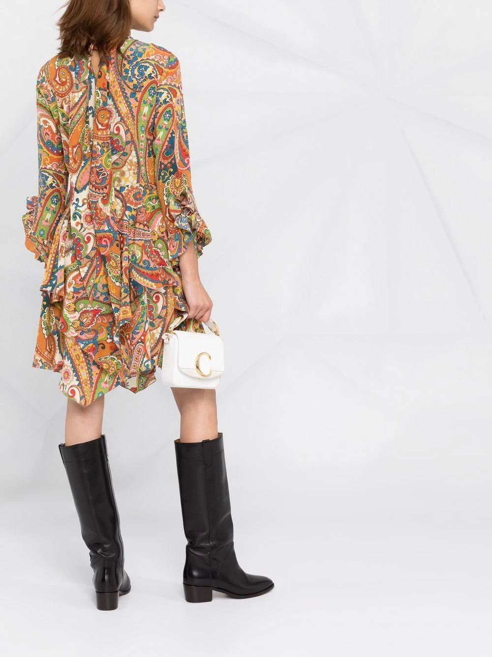 Détails de volants, bord volanté, effet superposé, col montant, taille ajustée, jupe évasée, manches trois-quarts, ourlet asymétrique, longueur au dessus du genou.