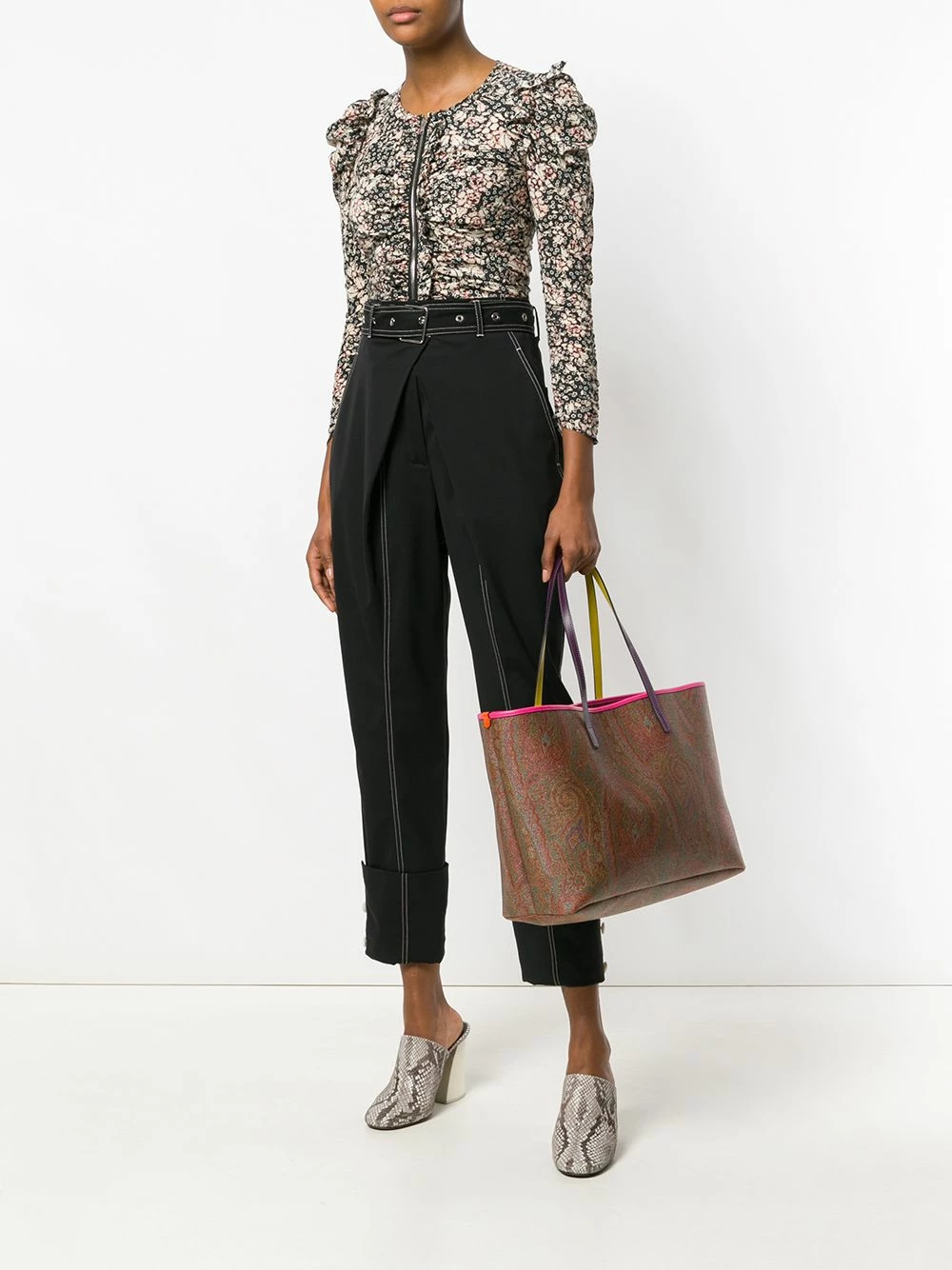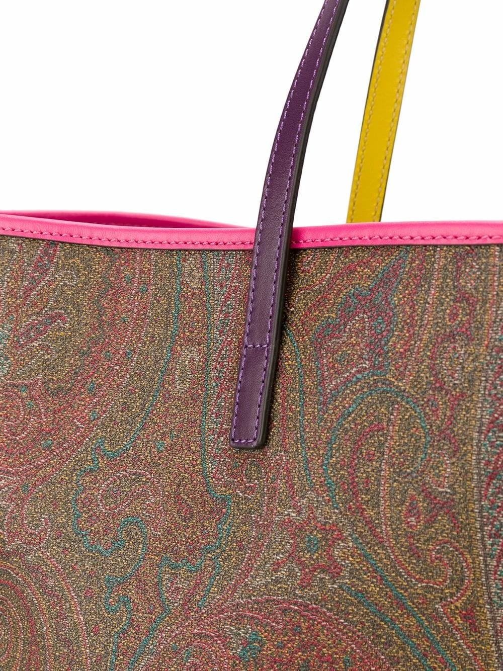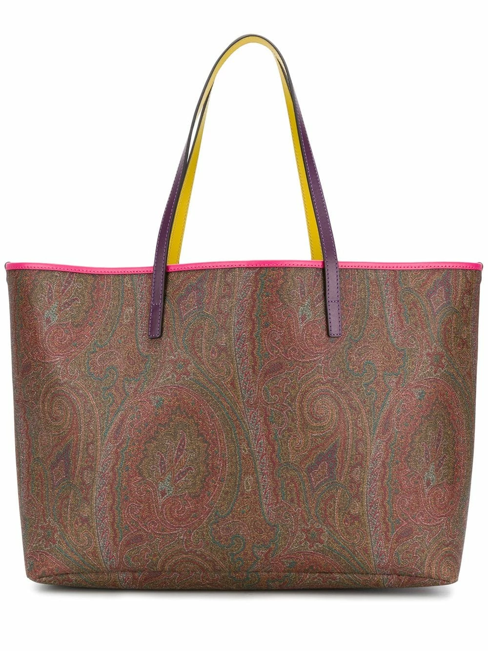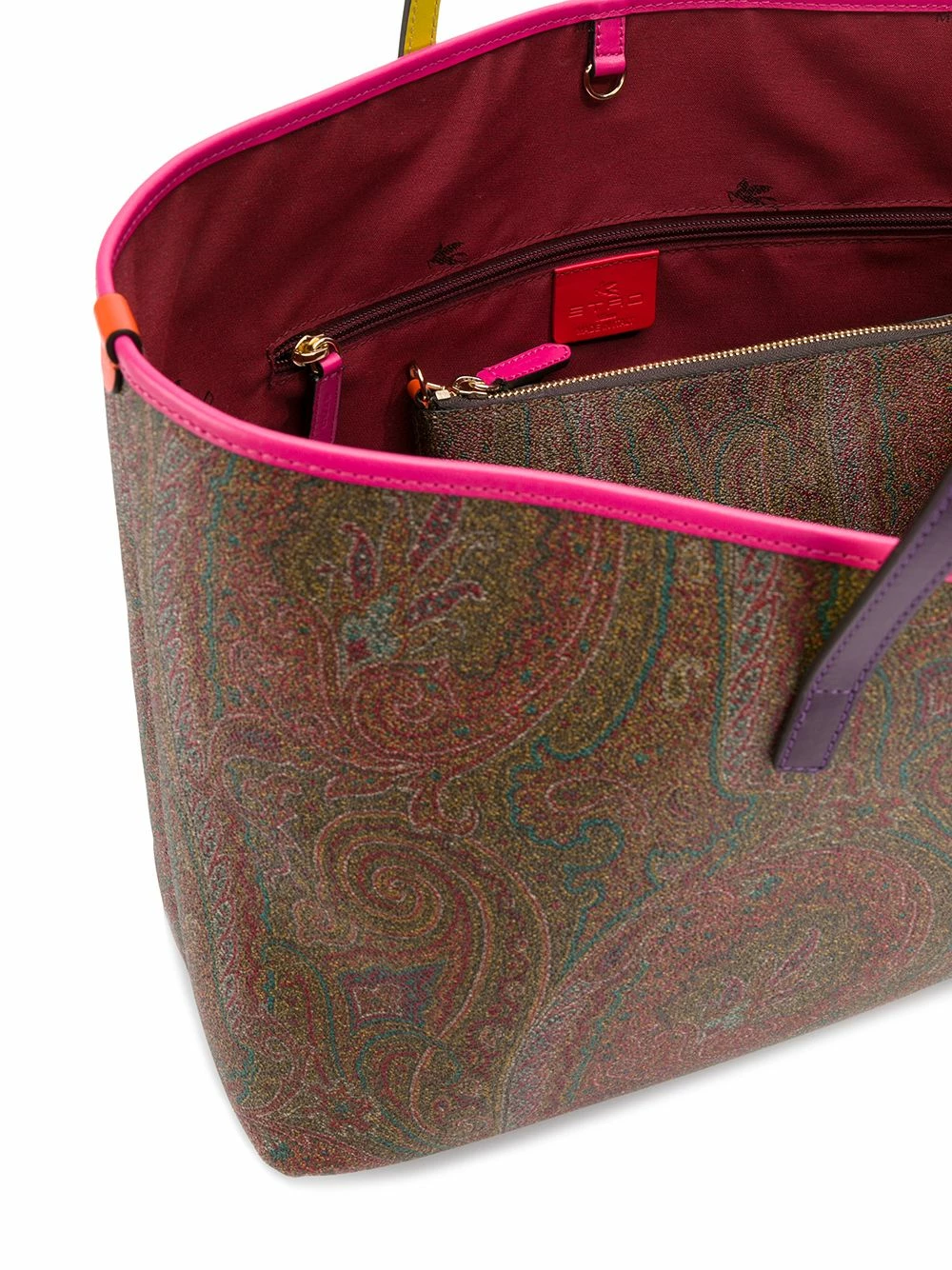 Sac à main à motif cachemire en coton mélangé et cuir marron Etro avec anses sur le dessus, fixation à clips, bordure en cuir, poche intérieure zippée, logo en relief à l’intérieur et pochette amovible.
