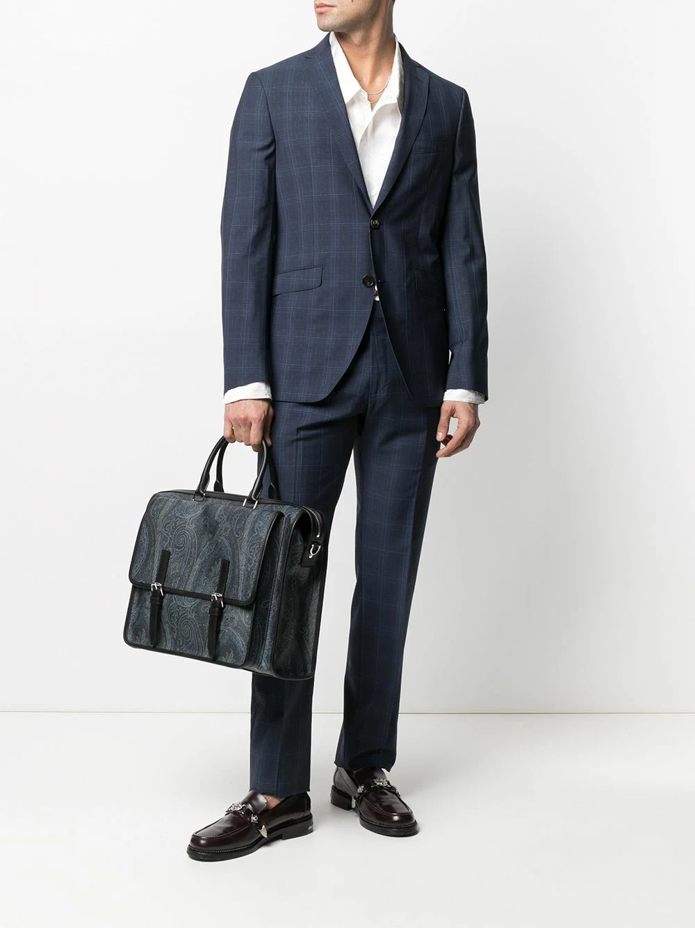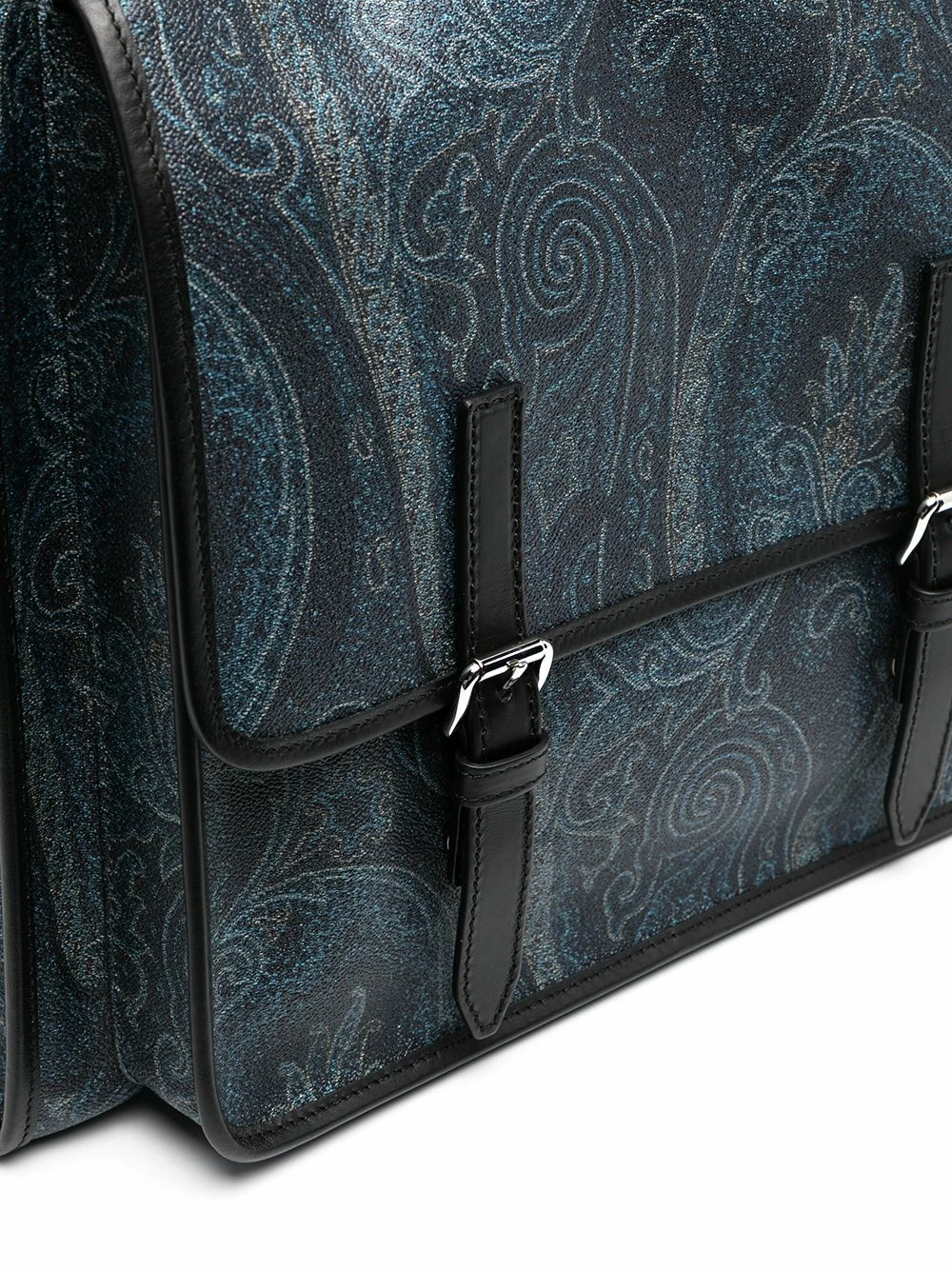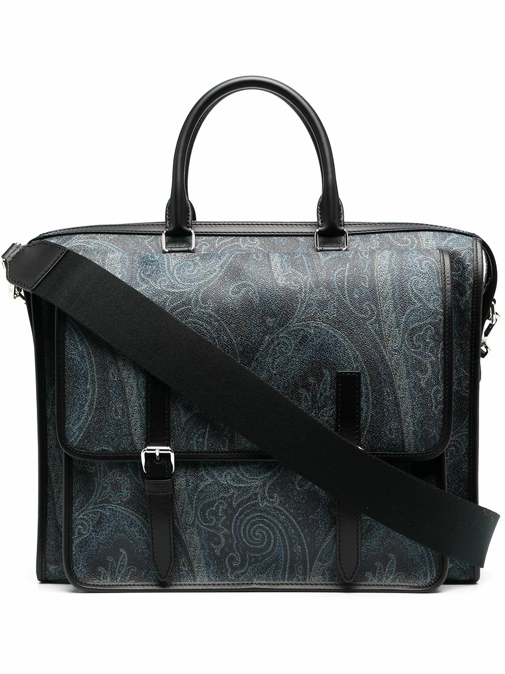 Motif cachemire, liseré en cuir, anses arrondies, bride portée épaule détachable, fermeture zippée sur le dessus, compartiment principal, poches intérieures zippées, poche devant à rabat.