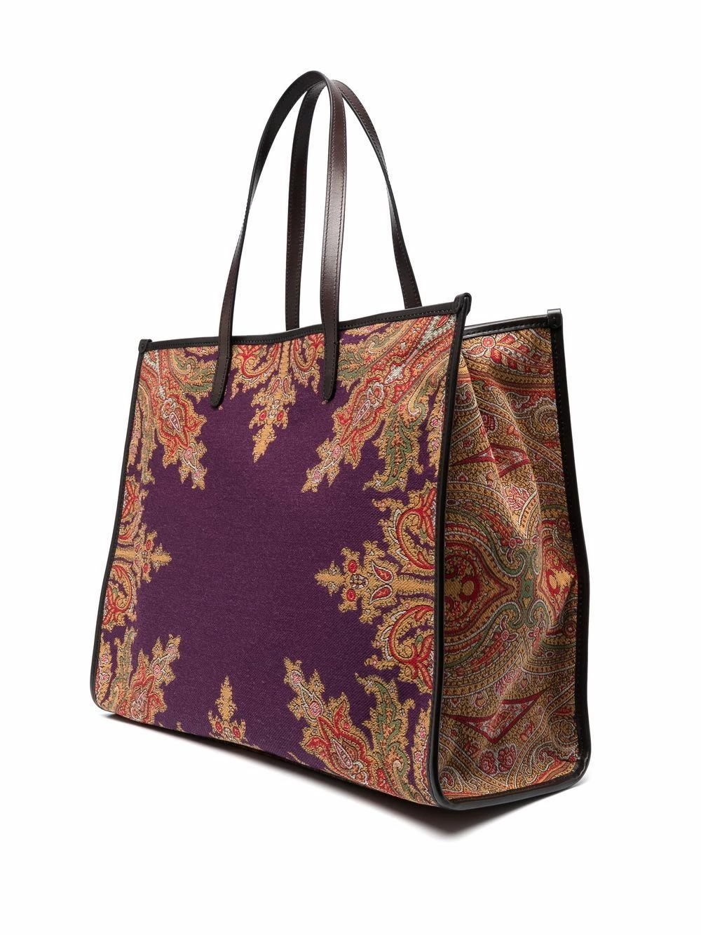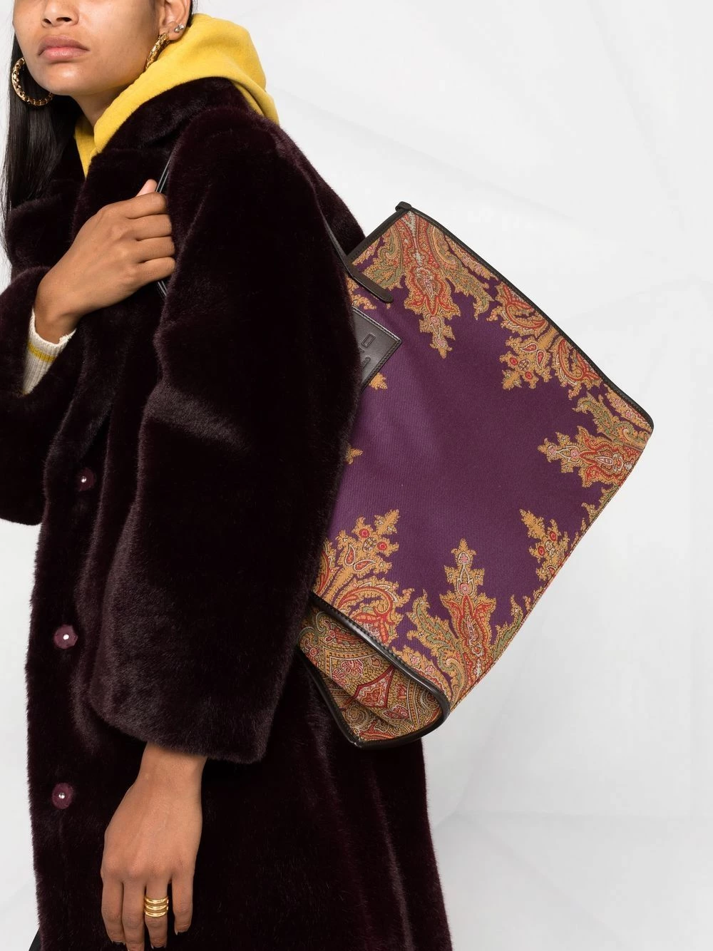 Deux longues anses sur le dessus, coutures ton sur ton, patch logo sur le devant, motif cachemire, ouverture sur le dessus, doublure rayée, poche intérieure zippée, patch logo intérieur.