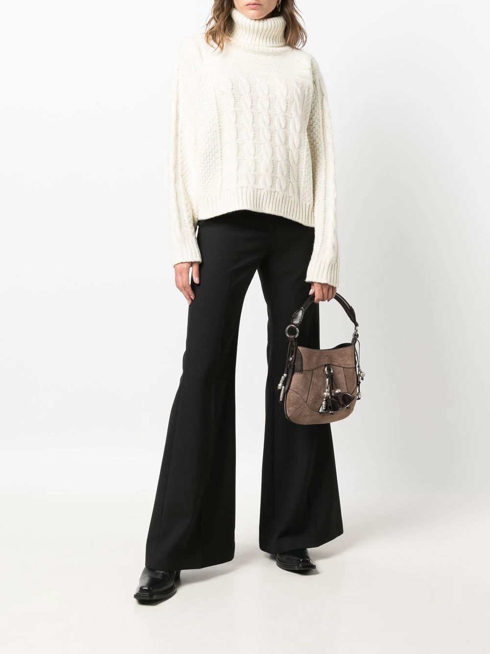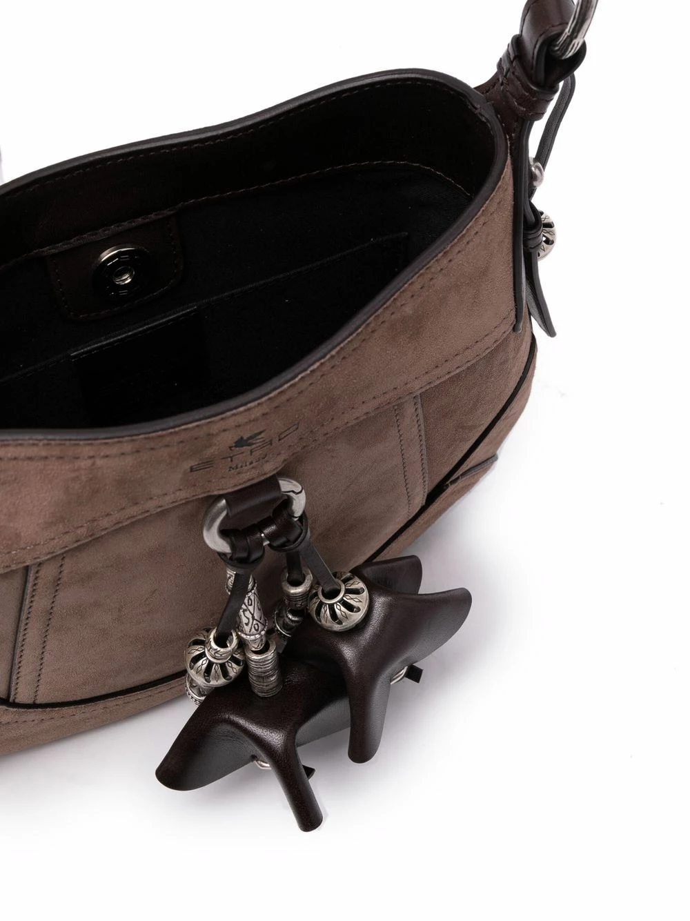 Logo embossé, détail de pompon, anse arrondie, bride porté épaule détachable et ajustable, fermeture magnétique, compartiment principal, poche intérieure plaquée.