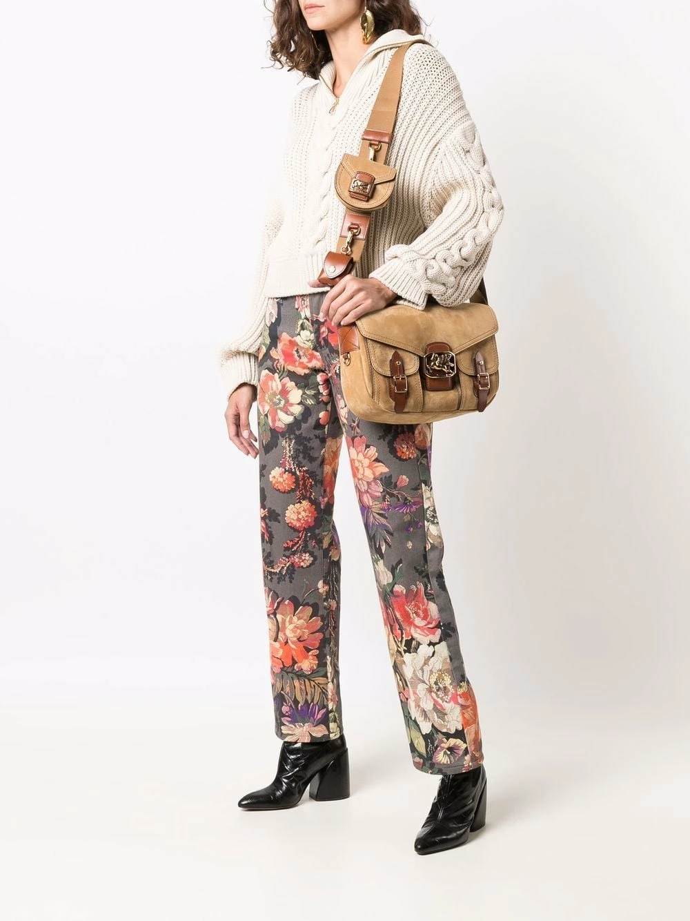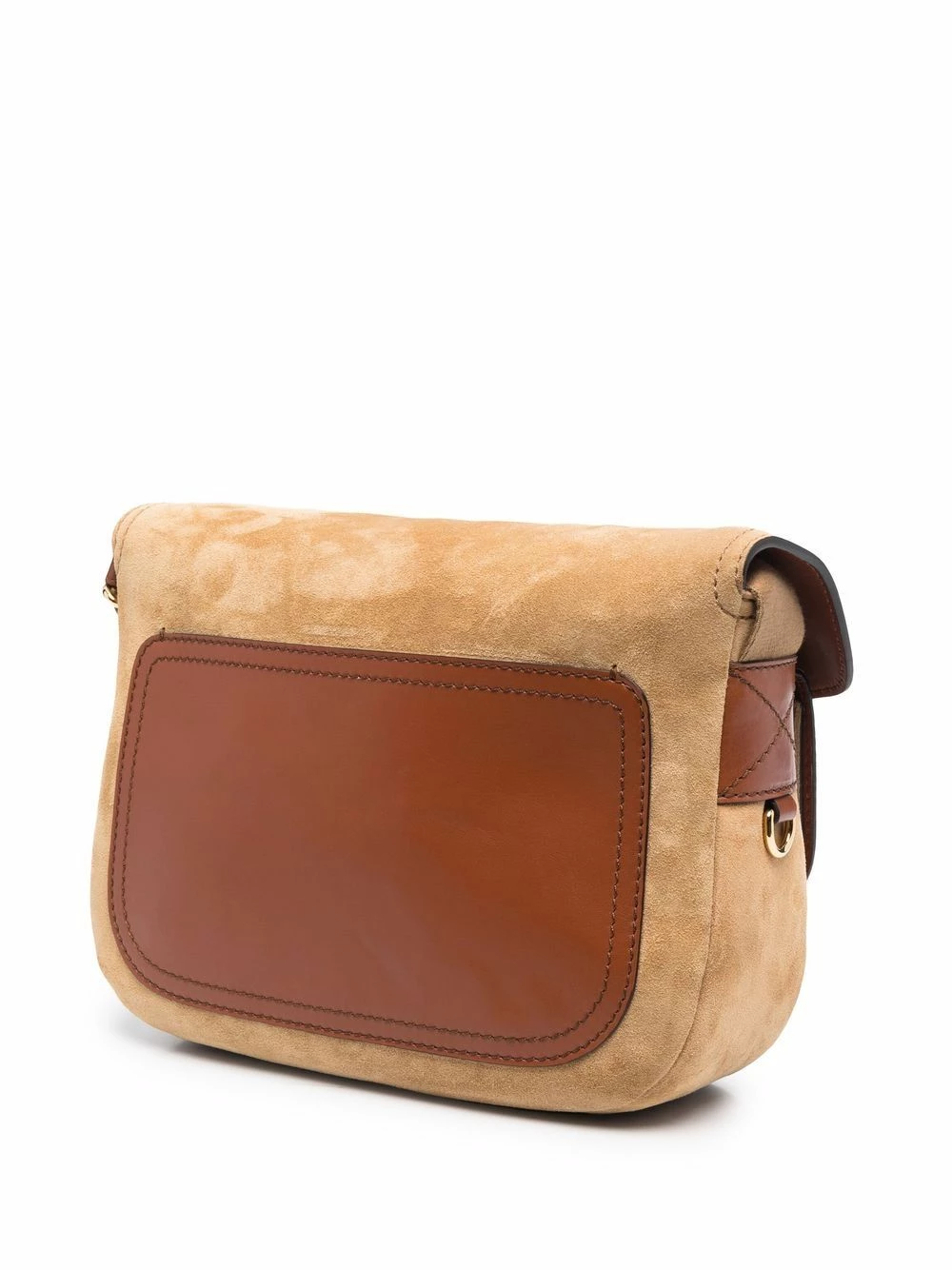 Attache porte-clés, design à empiècements, plaque logo dorée, finitions en métal doré, deux poches plaquées avant, rabat sur le dessus, fermeture à boucle, bretelle portée épaule unique, compartiment principal, pochette détachable. Couleur : tons neutres. Matière : cuir de veau.
