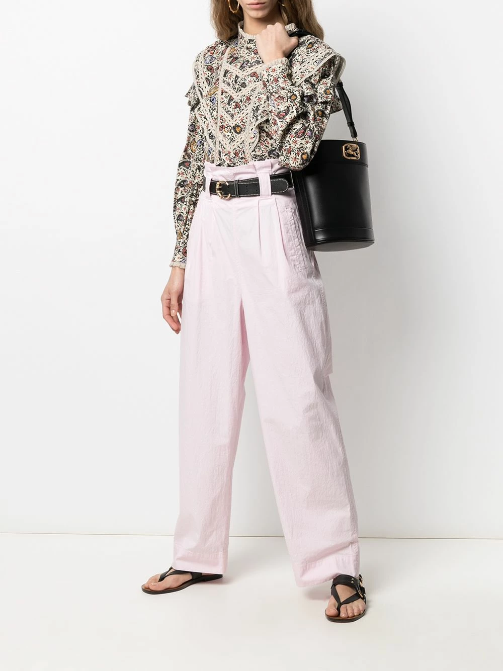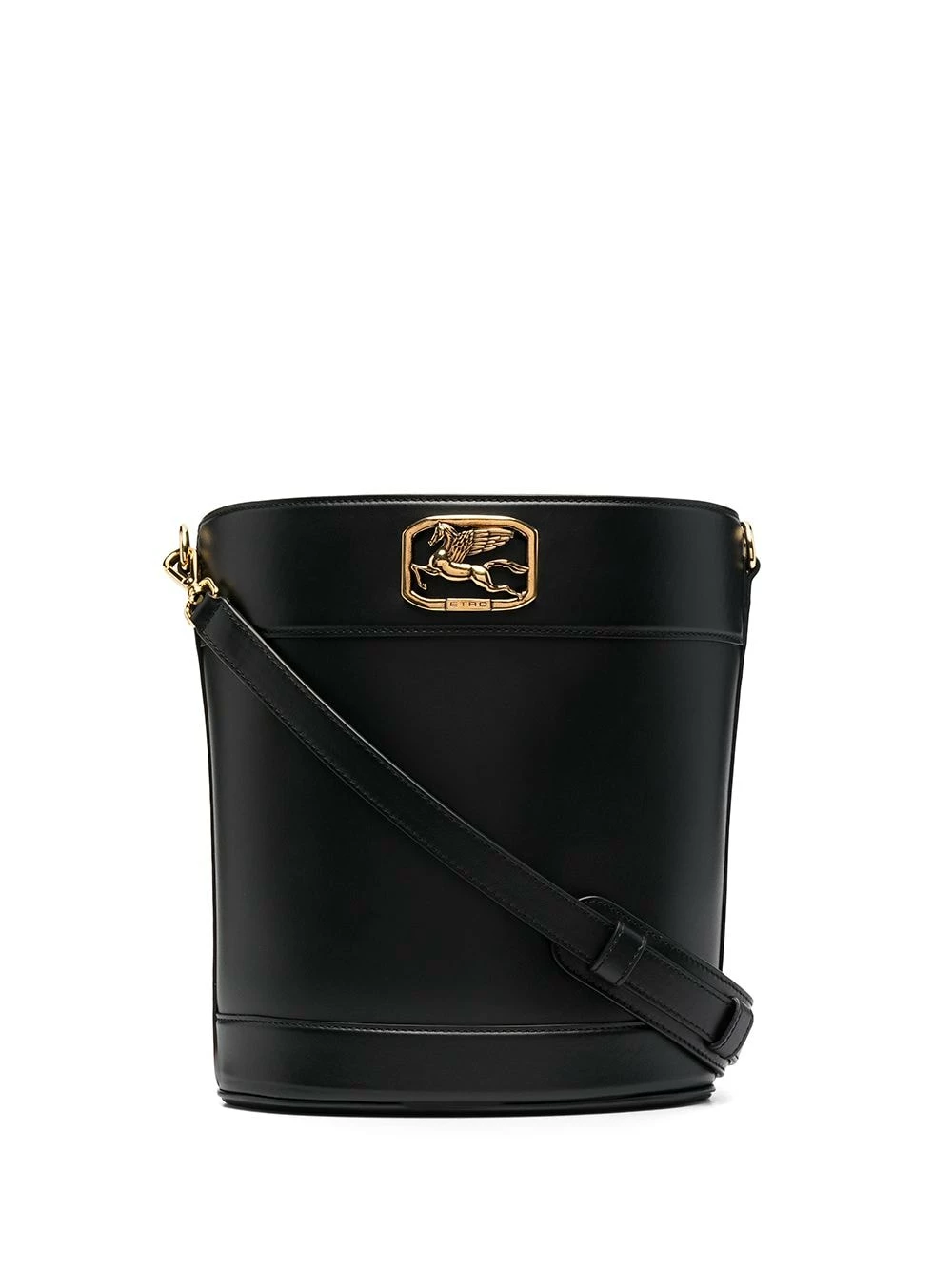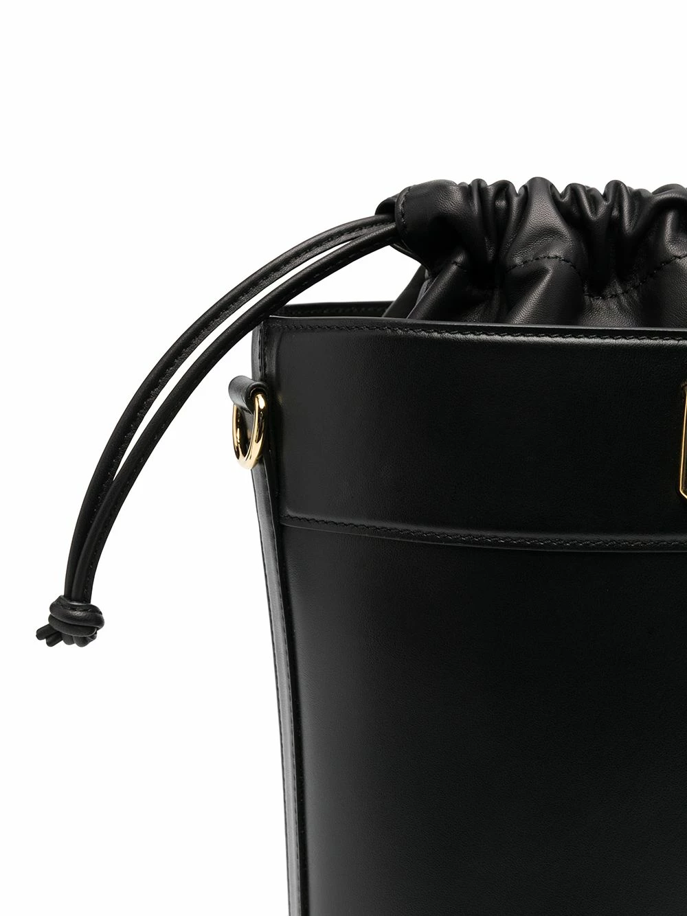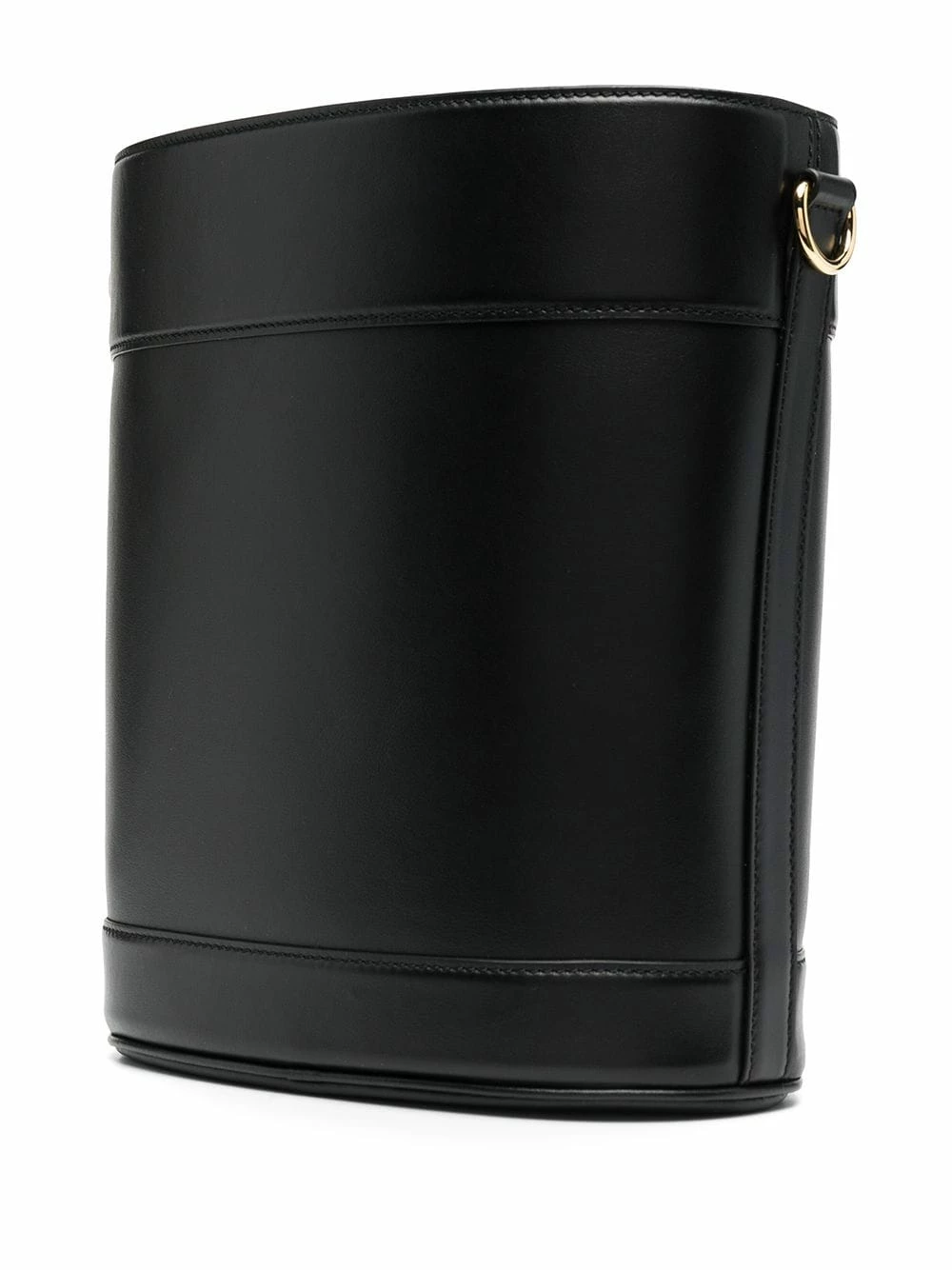 Plaque logo dorée, lien de resserrage, compartiment principal, poche intérieure zippée, bride portée épaule détachable et ajustable. Couleur : noir. Matière : cuir de veau.
