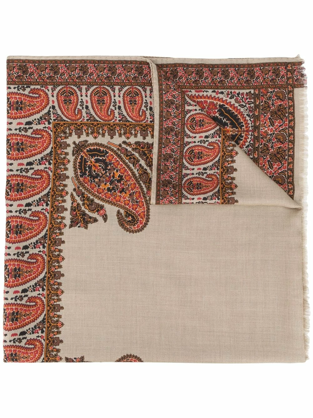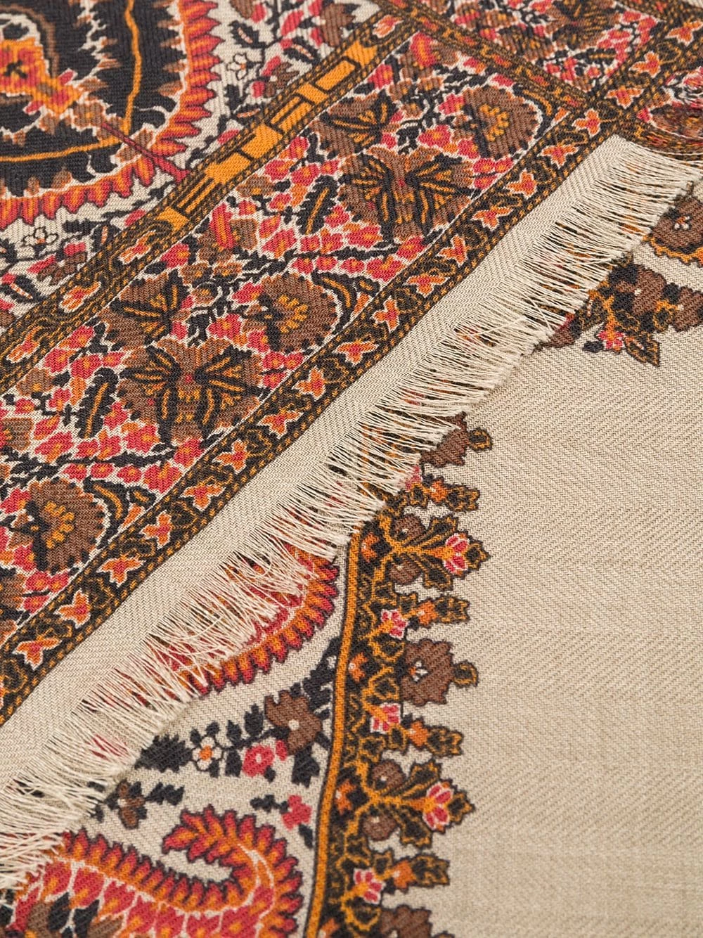 Motif cachemire, logo imprimé sur le côté, bordure à franges.