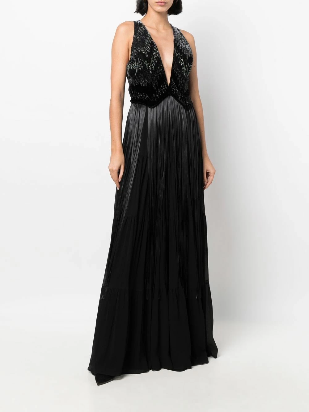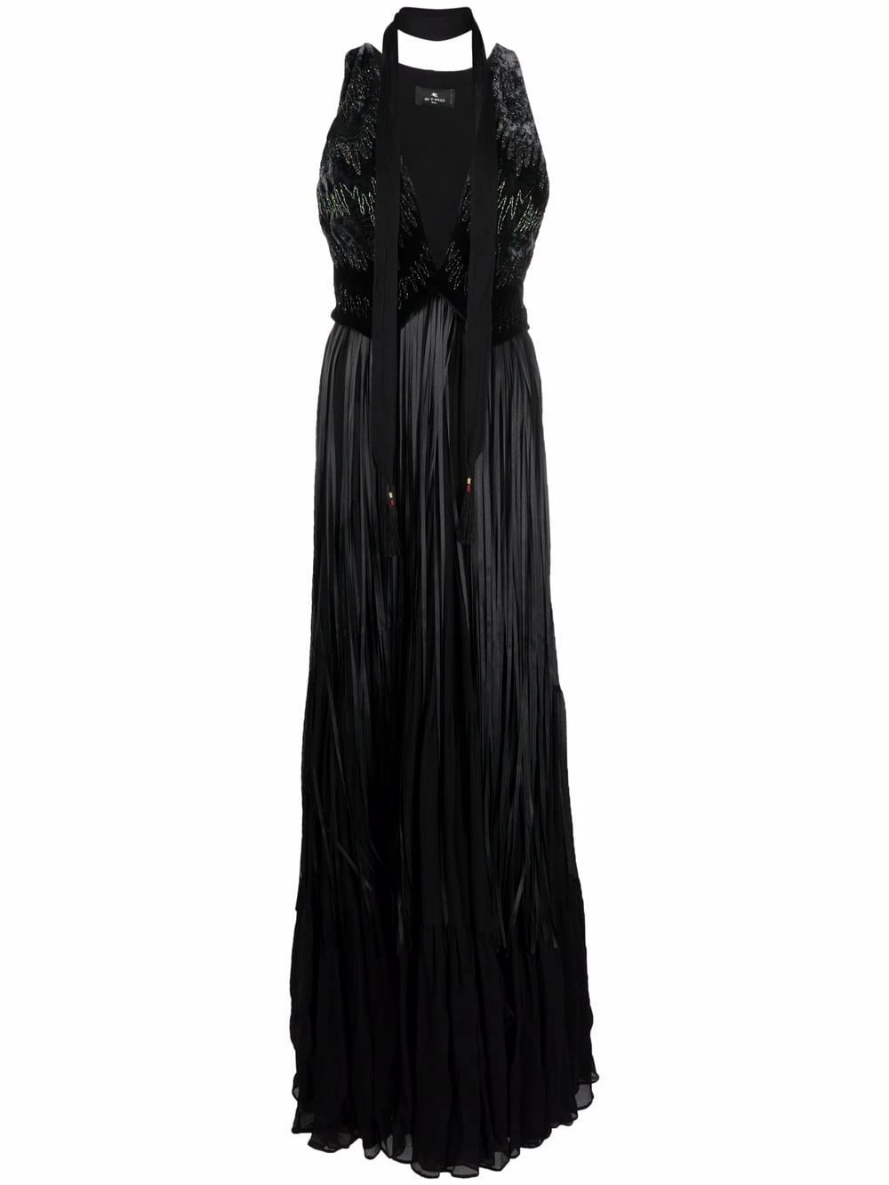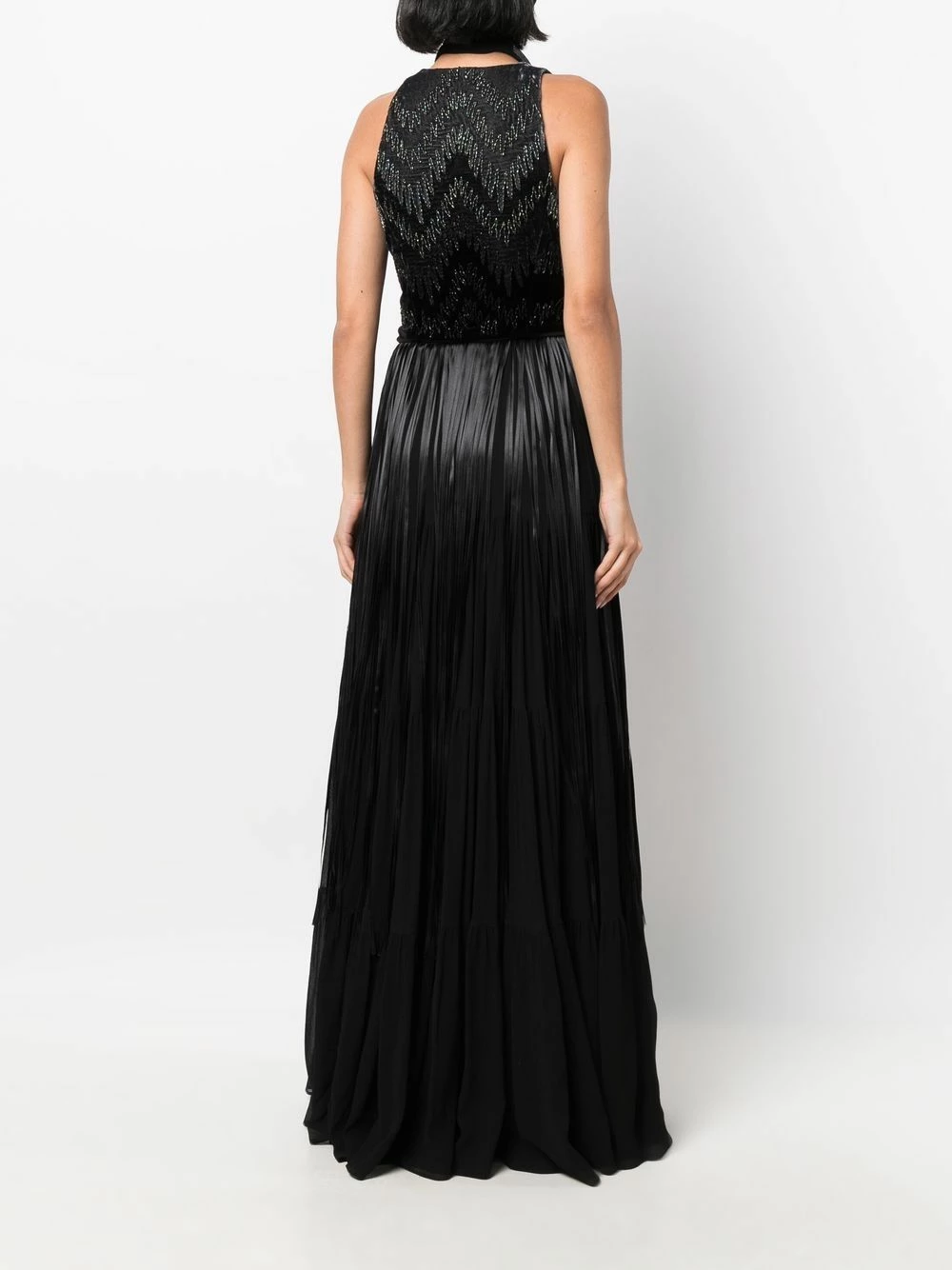 Ornements en perles brodées, col v, design sans manches, taille haute, jupe plissée. Couleur : noir. Matière : soie.