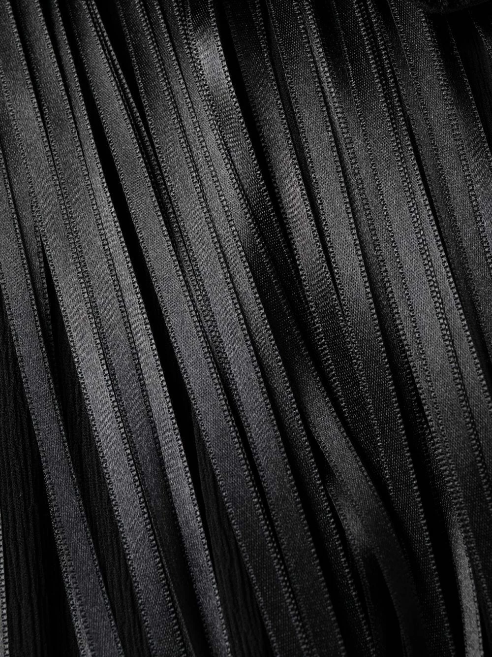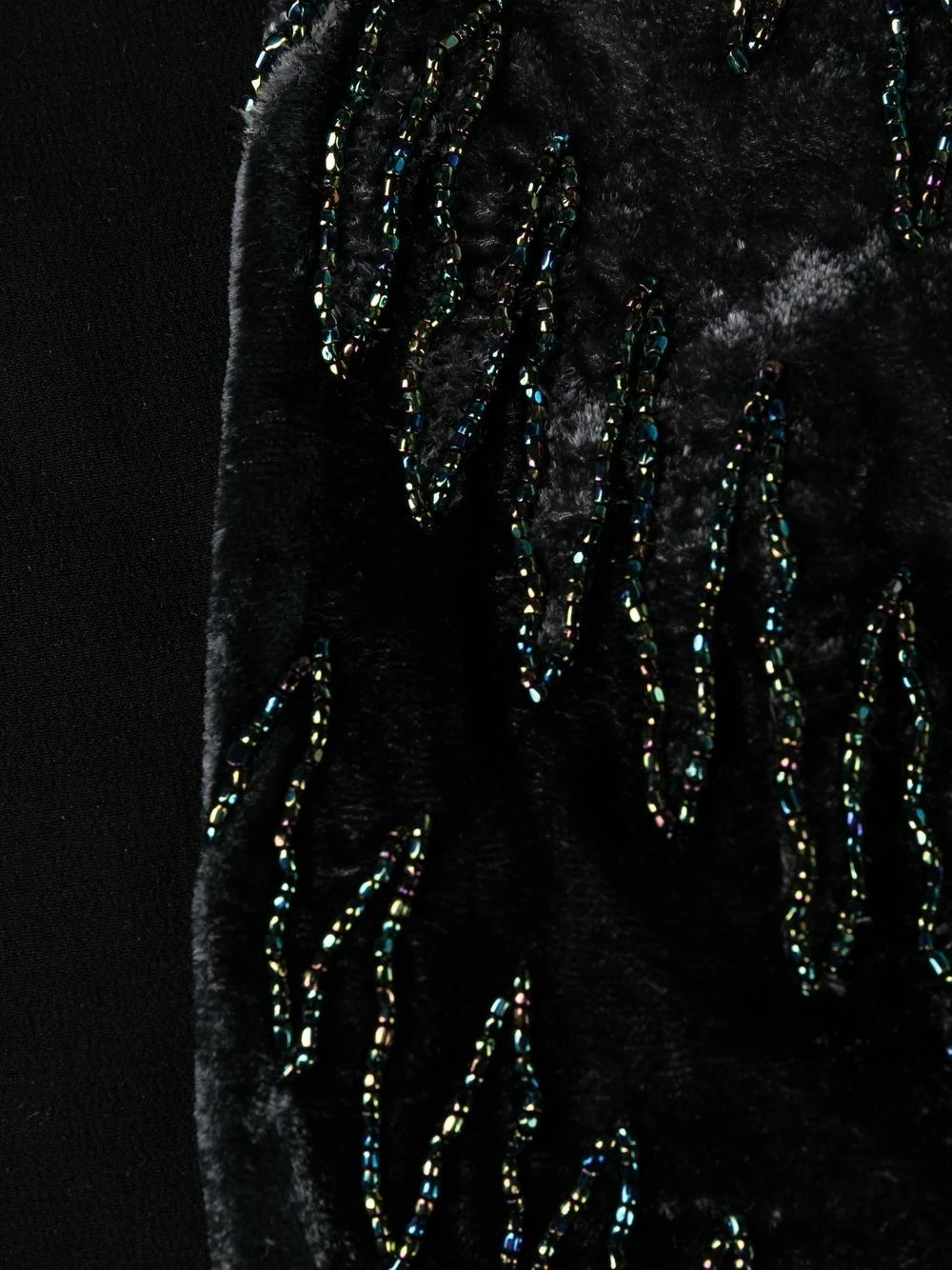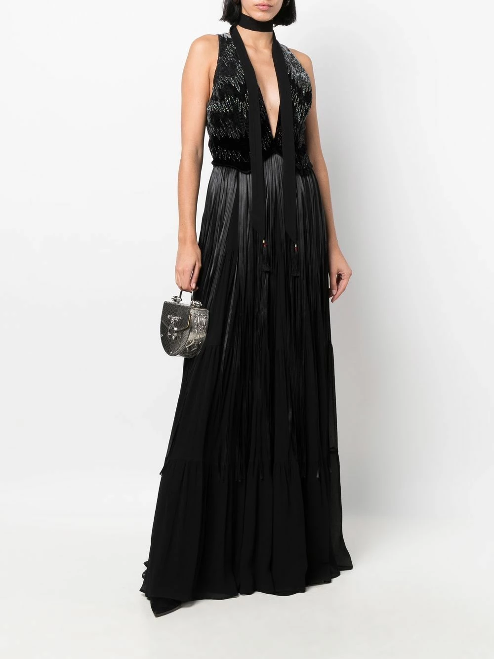 Ornements en perles brodées, col v, design sans manches, taille haute, jupe plissée. Couleur : noir. Matière : soie.