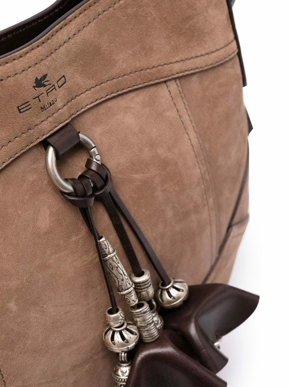 Détails de perles brodées, logo embossé sur le devant, coutures ton sur ton, compartiment principal, fermeture à boutons pression, anse classique. Matière : cuir de veau.