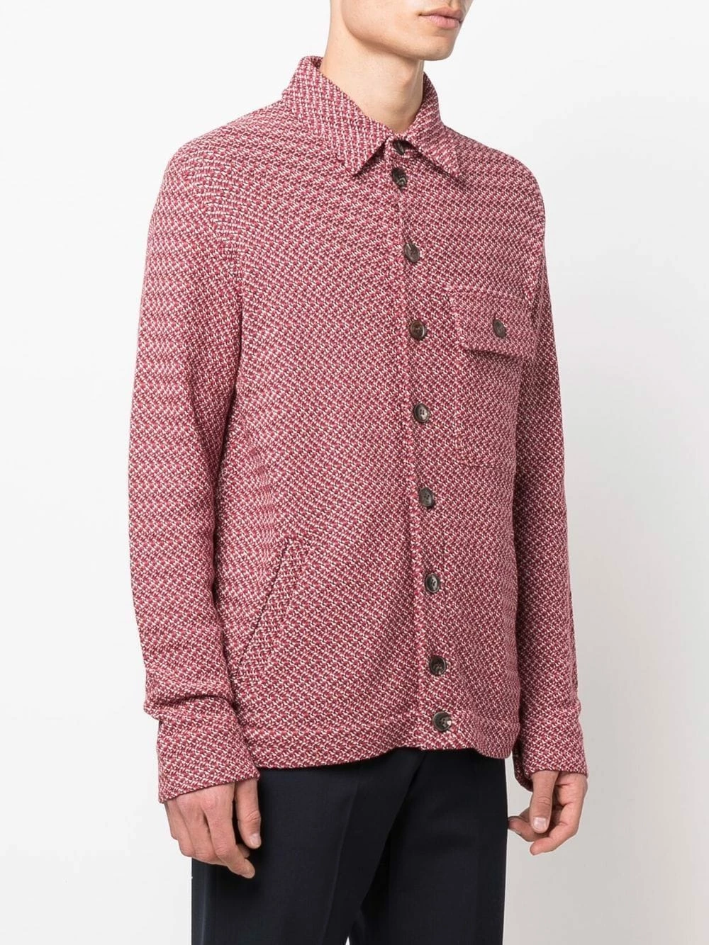 Jacquard à motifs, col classique, boutonnière sur le devant, manches longues, poche poitrine à rabat, ourlet droit. Couleur : rouge. Matière : coton.