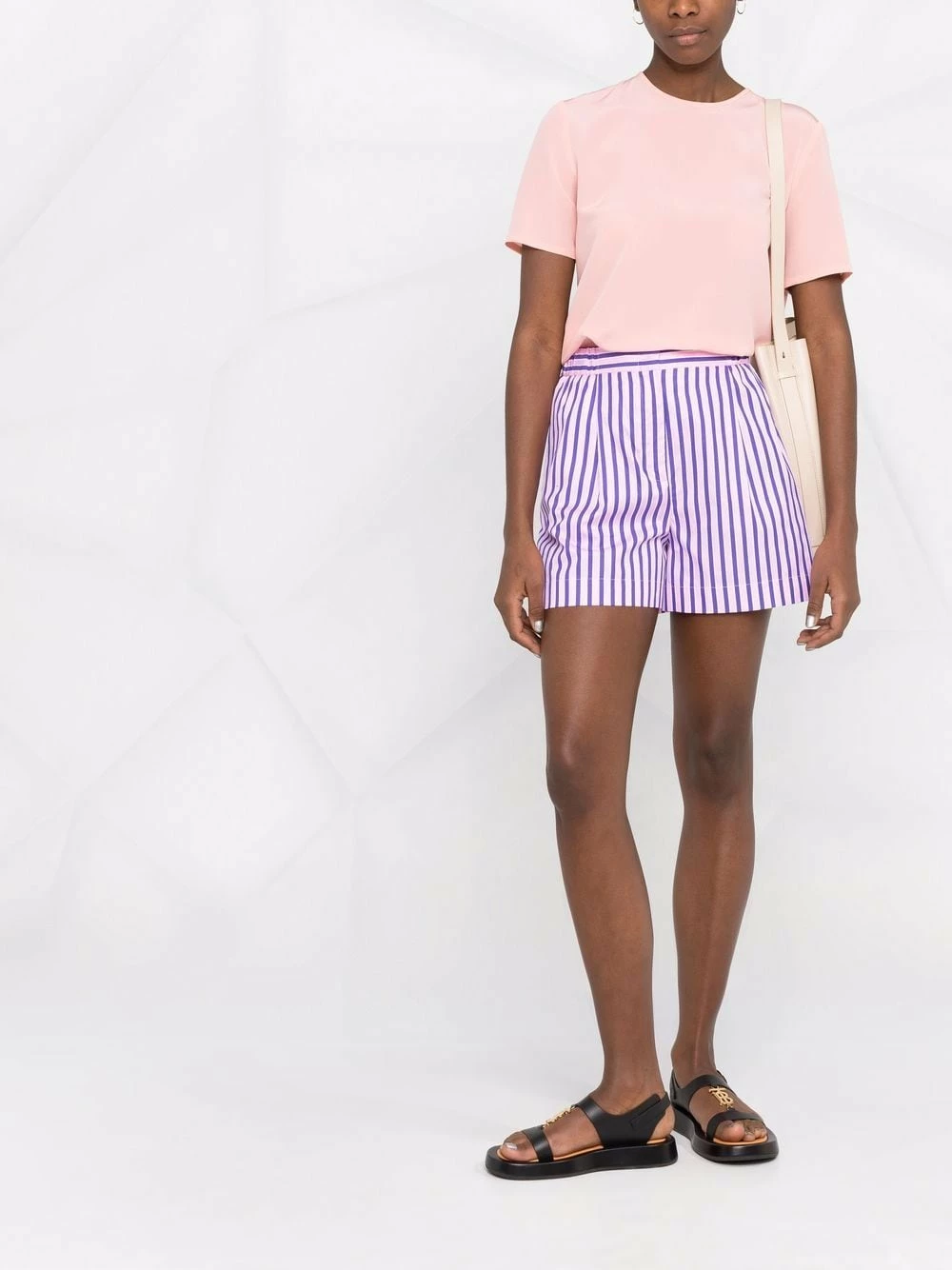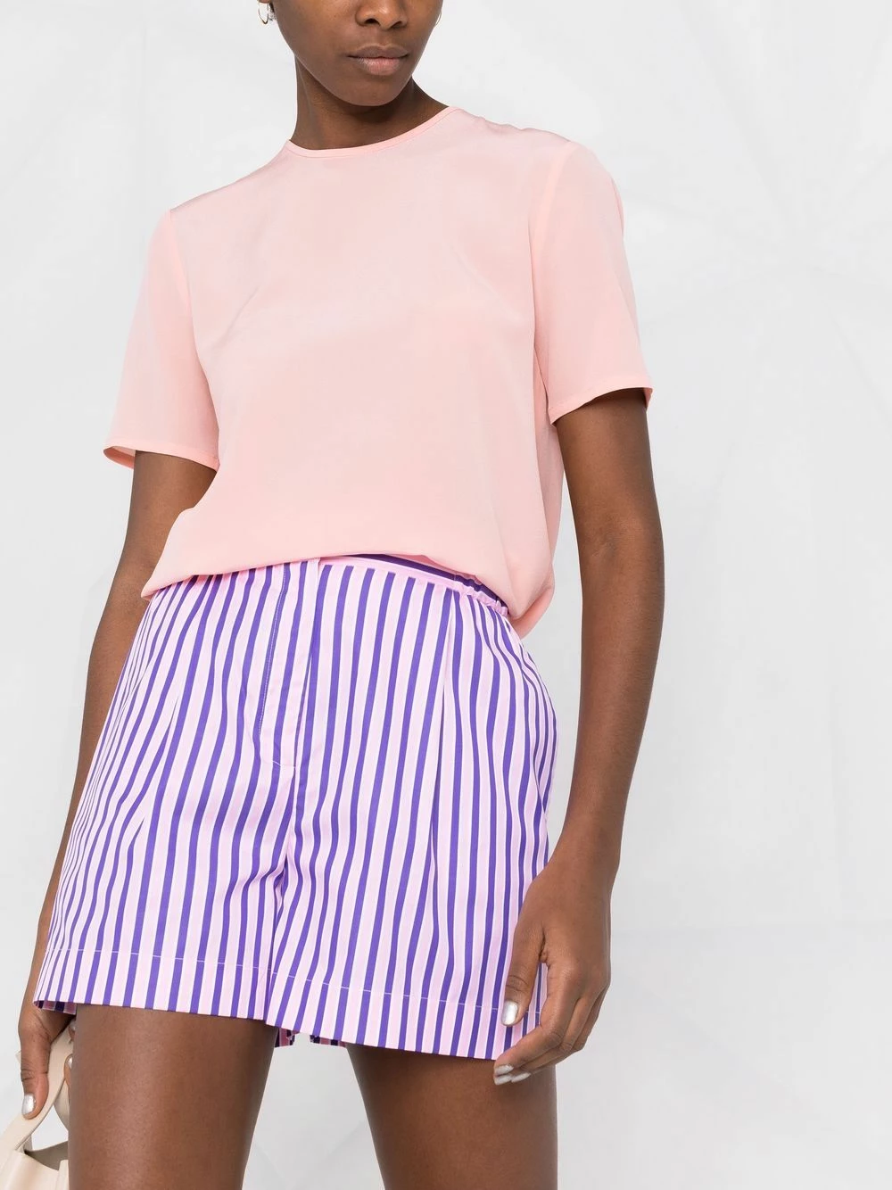 Encolure ronde, ourlet droit, manches courtes, boutonnière à l’arrière, ouverture goutte d’eau au dos. Couleur : rose. Matière : soie.