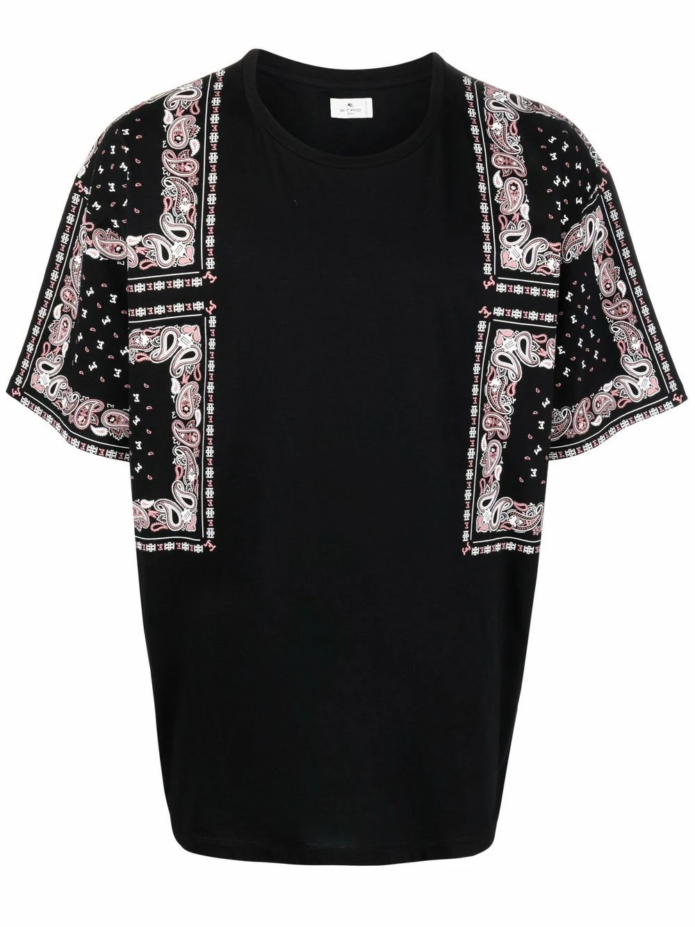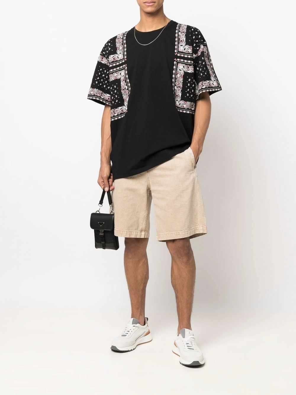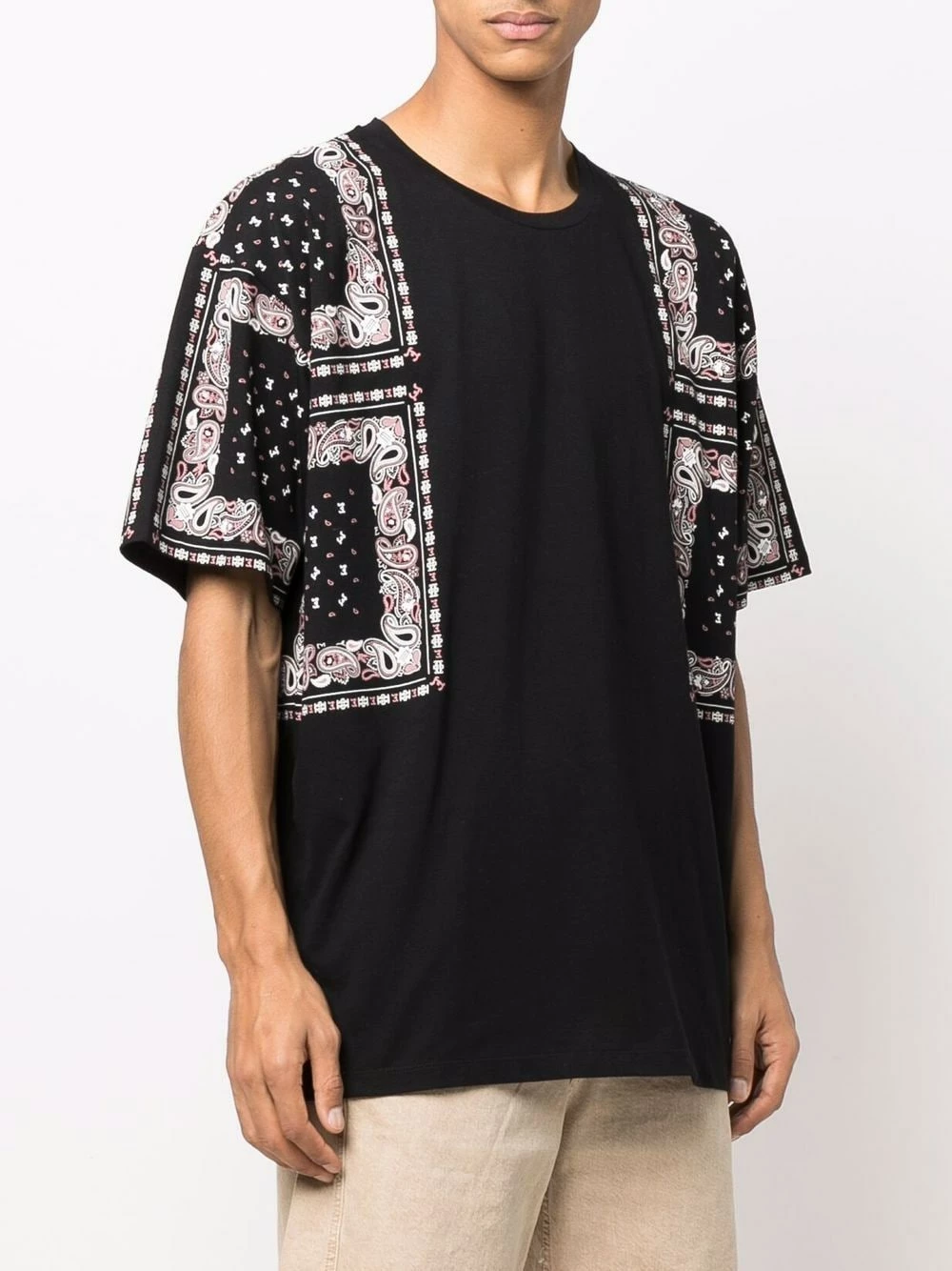Encolure ronde, imprimé bandana, motif cachemire, logo lettre, manches courtes, ourlet droit. Couleur : noir.