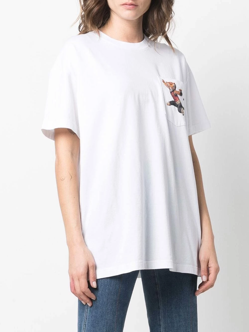 Imprimé graphique sur le devant, logo imprimé à l’arrière, encolure ronde, manches courtes, poche poitrine plaquée, ourlet droit. Couleur : blanc. Matière : coton.