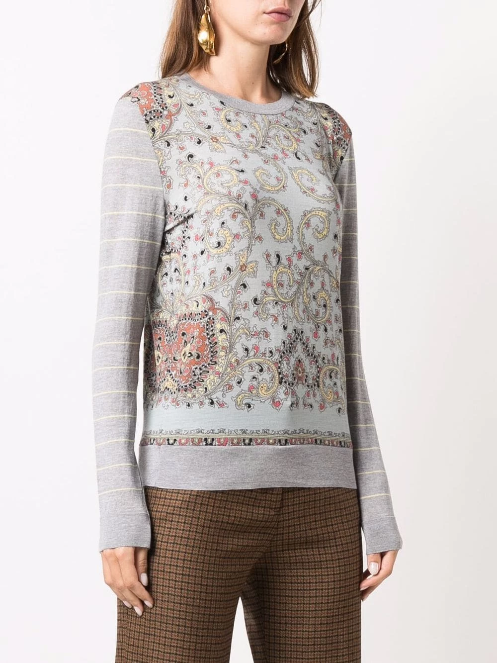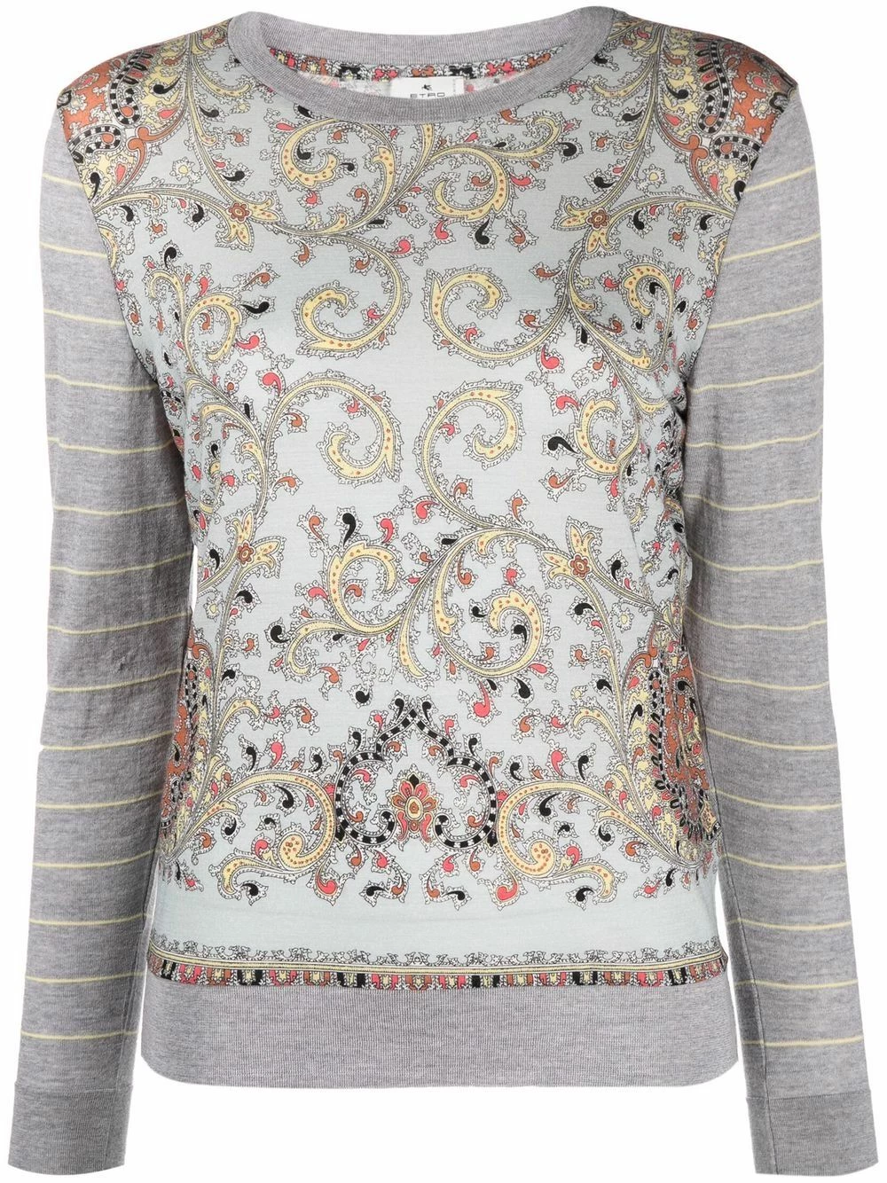 Motif cachemire, design tricoté, encolure ras du cou, manches longues. Couleur : gris.