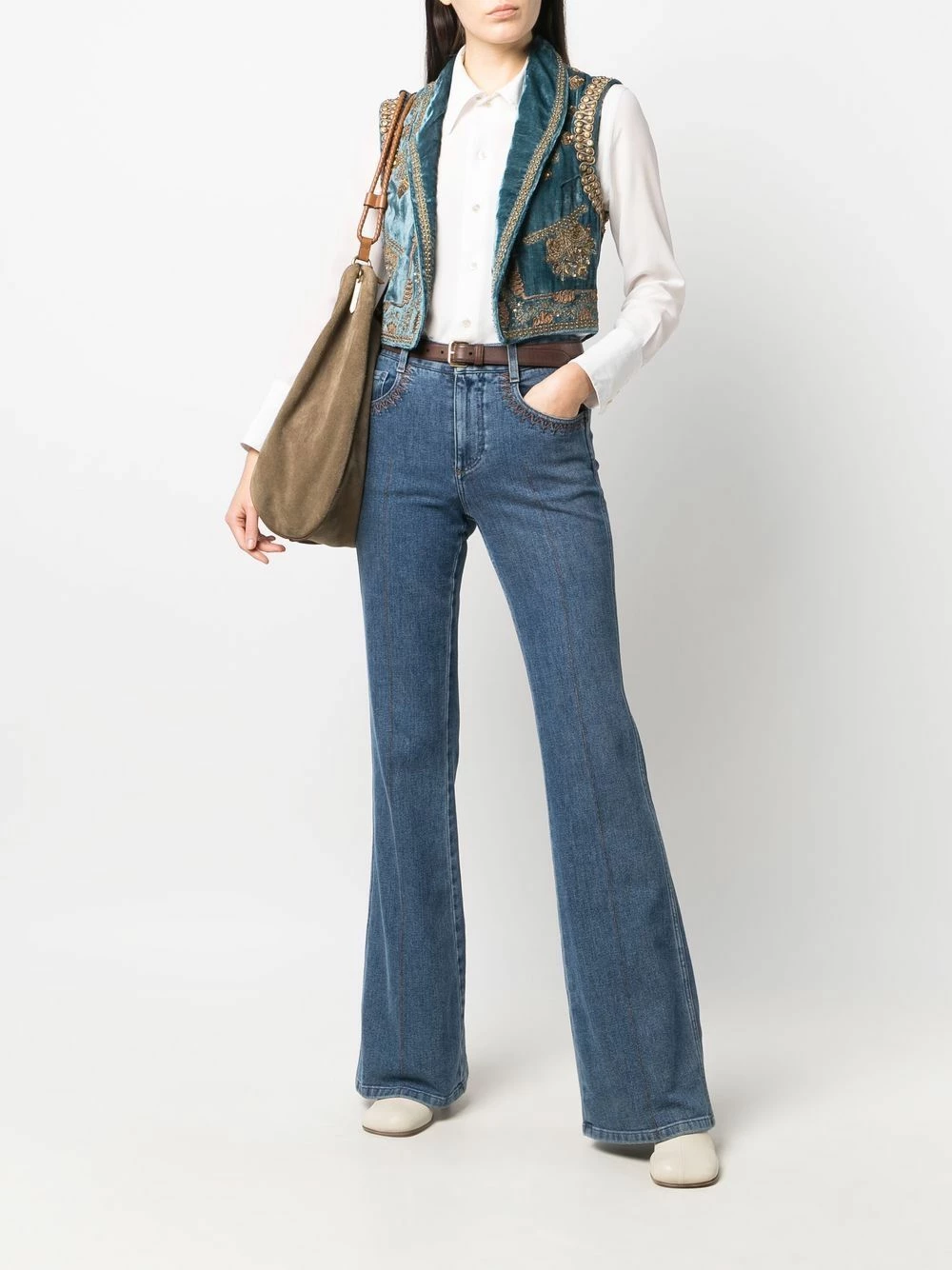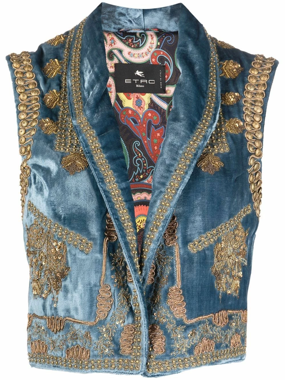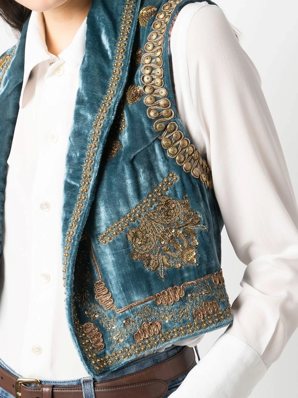 Effet velours, ornements en sequins, ornements en perles brodées, finitions tressées, col châle, design sans manches, motif cachemire.