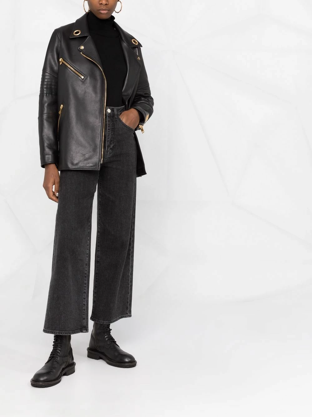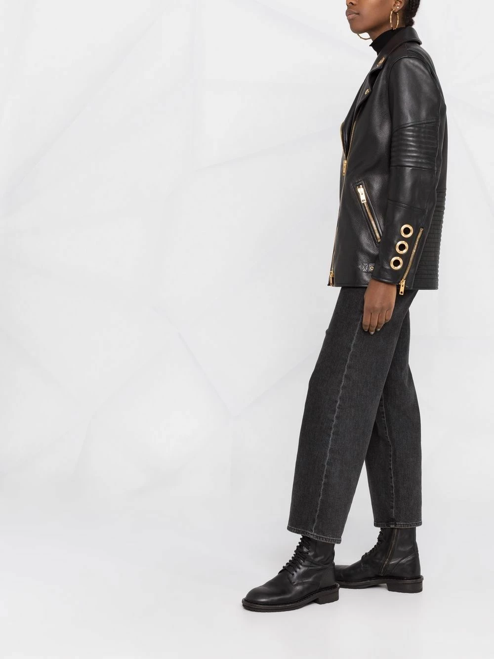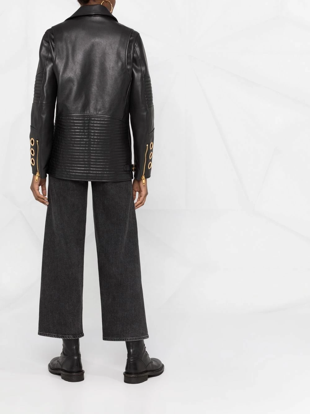 Col cranté, finitions en métal doré, fermeture zippée en biais, poches à fermeture zippée devant, manches longues, poignets zippés. Couleur : noir. Matière : cuir de veau.
