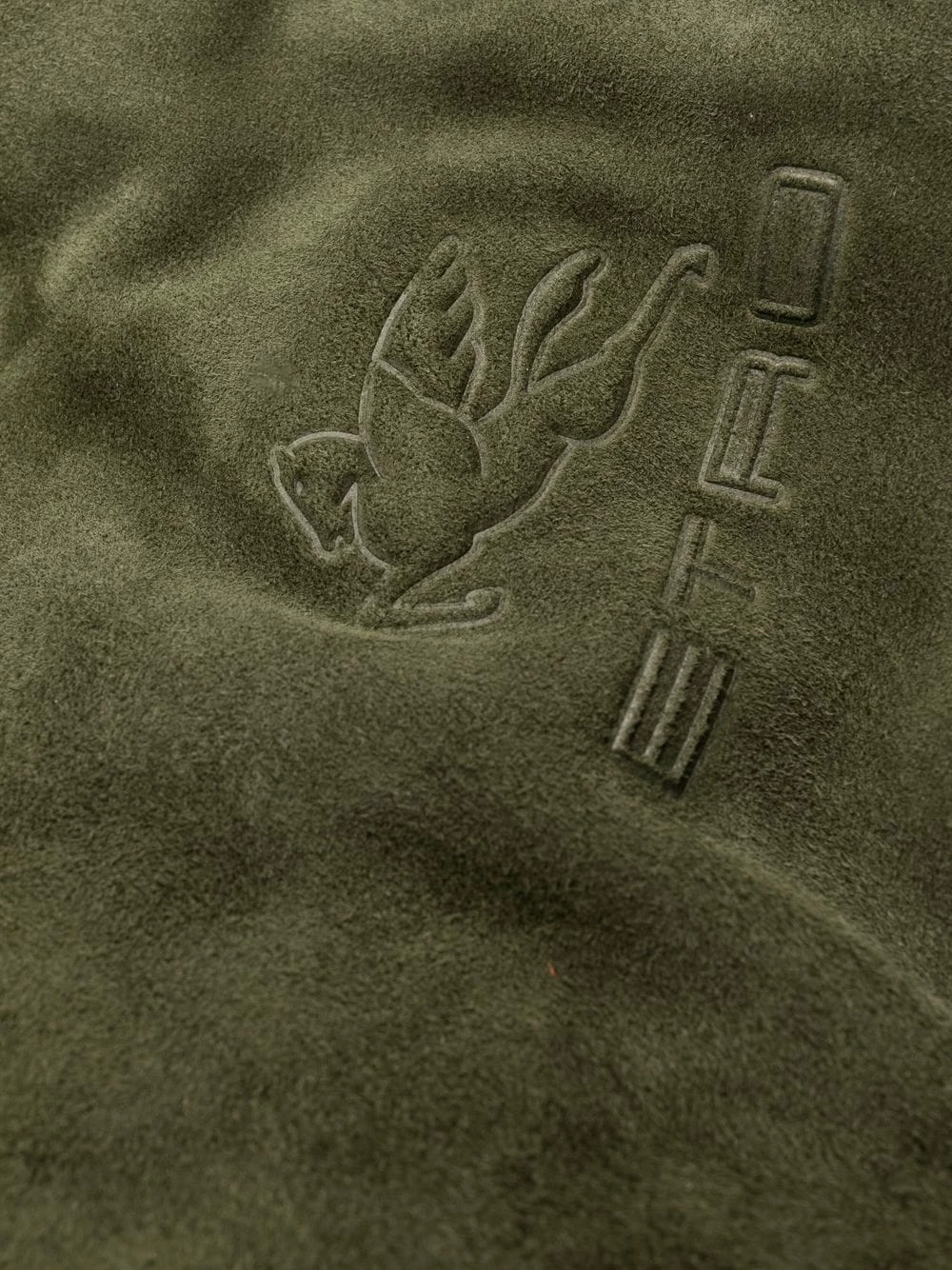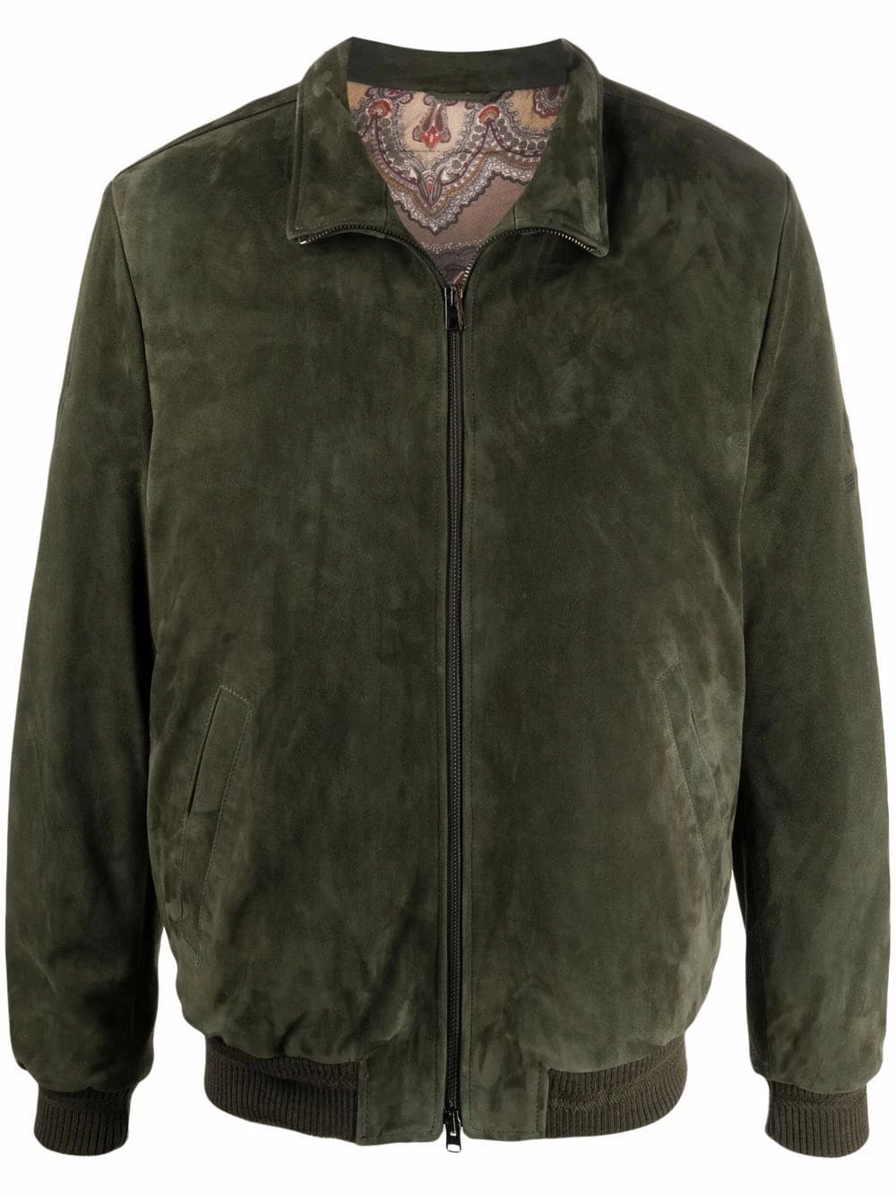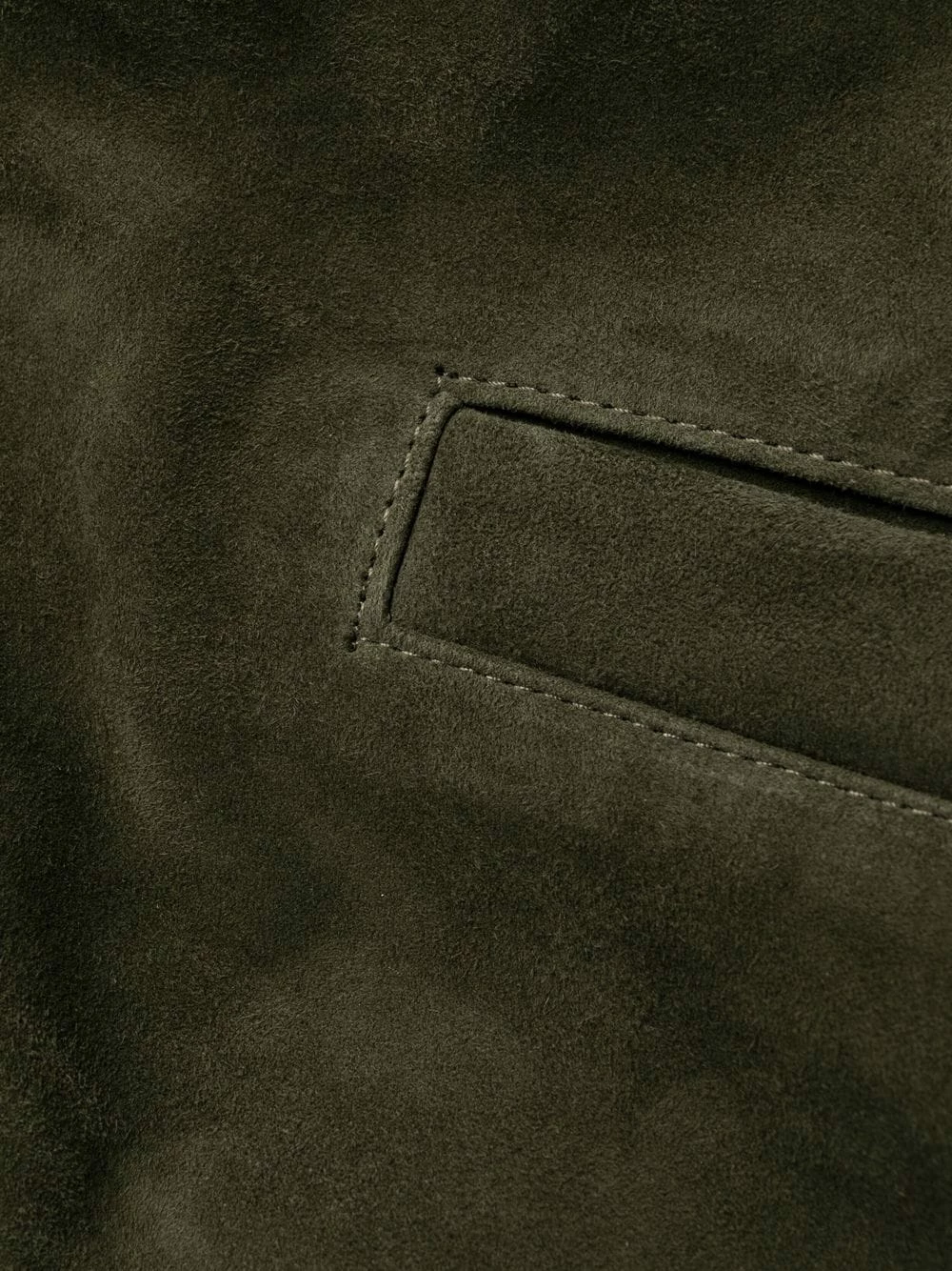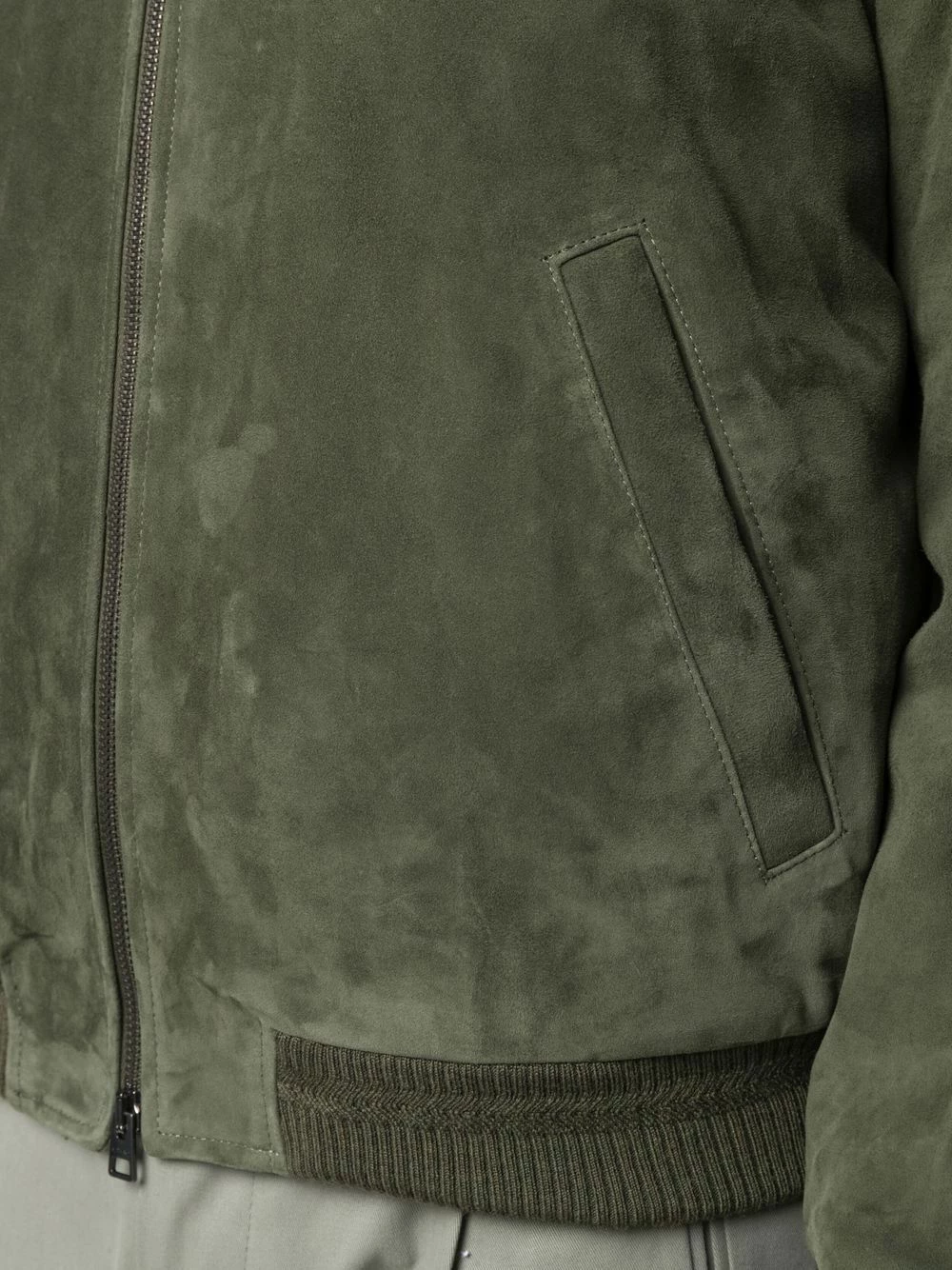Col montant, fermeture zippée à double sens sur le devant, ourlet nervuré, deux poches latérales fendues, manches longues, poignets nervurés. Couleur : vert. Matière : peau de chèvre.