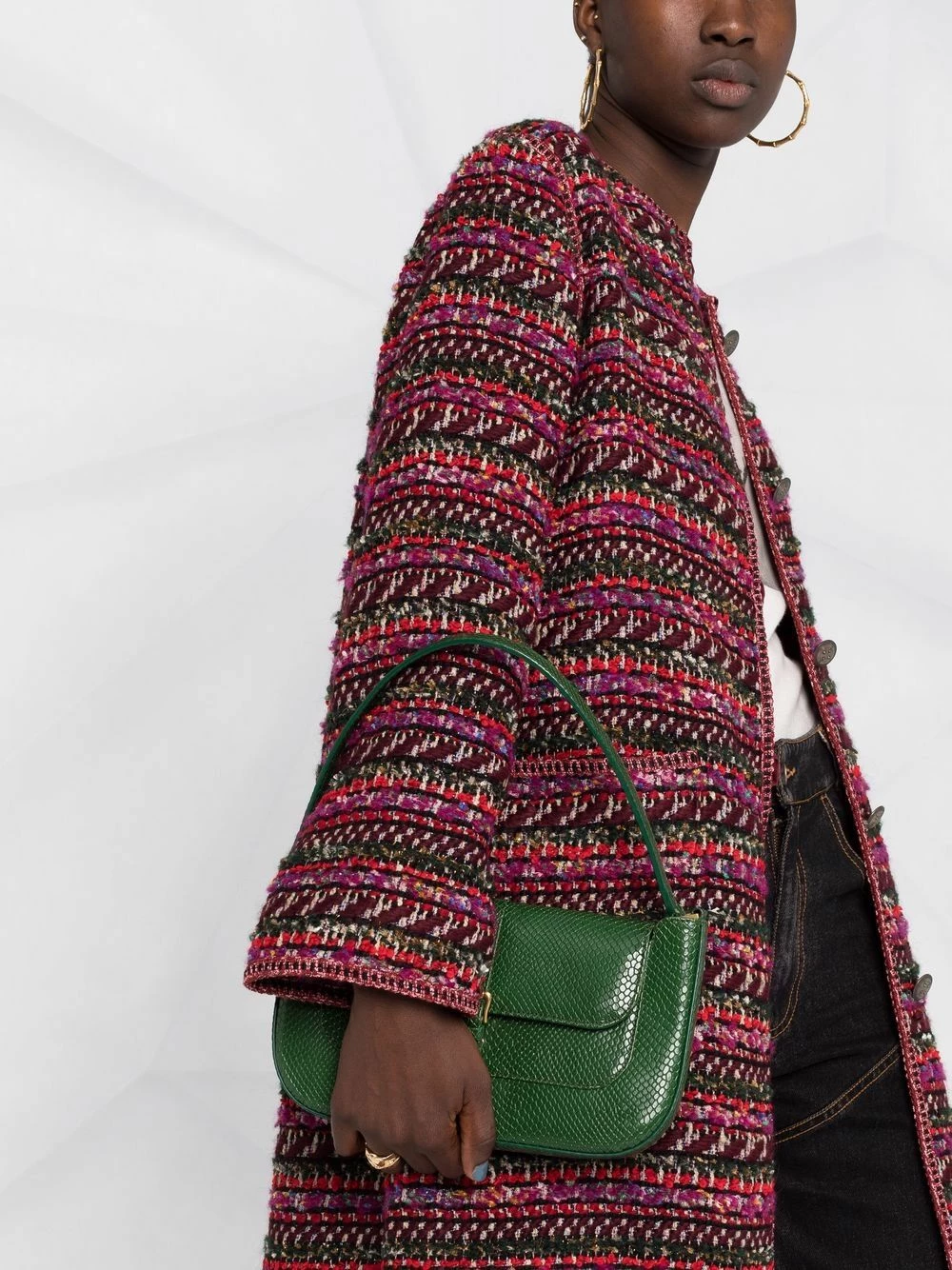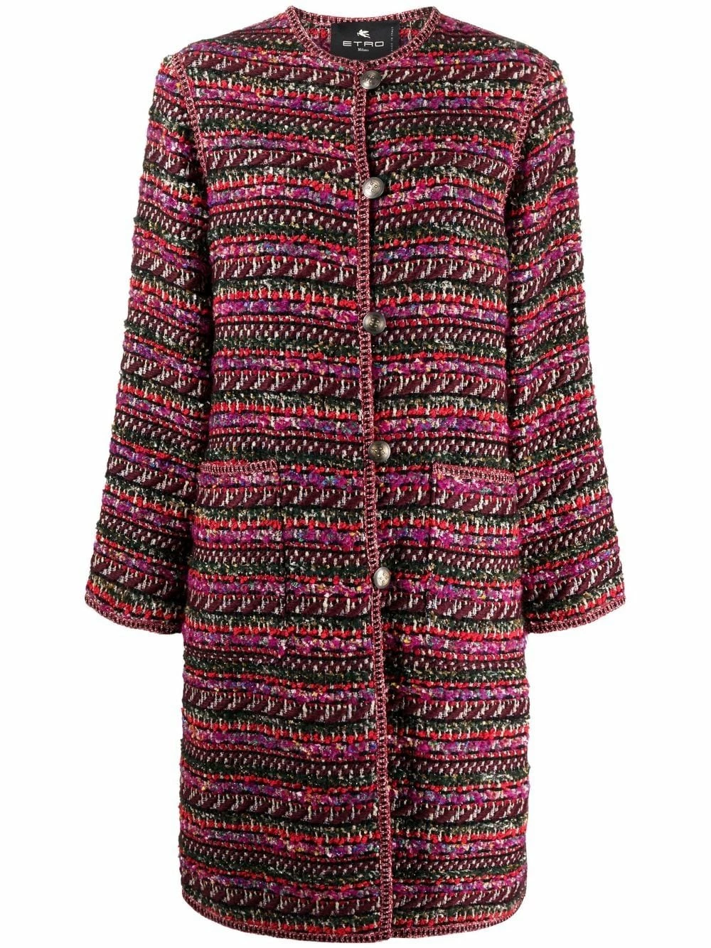 Tweed, deux poches latérales plaquées, boutonnière sur le devant, encolure ronde, manches longues, coupe longue, ourlet droit. Couleur : rouge.