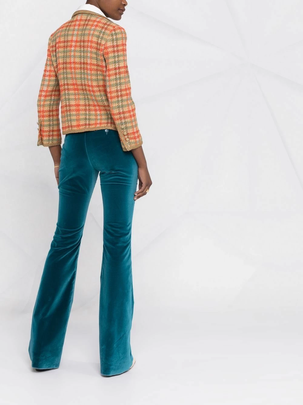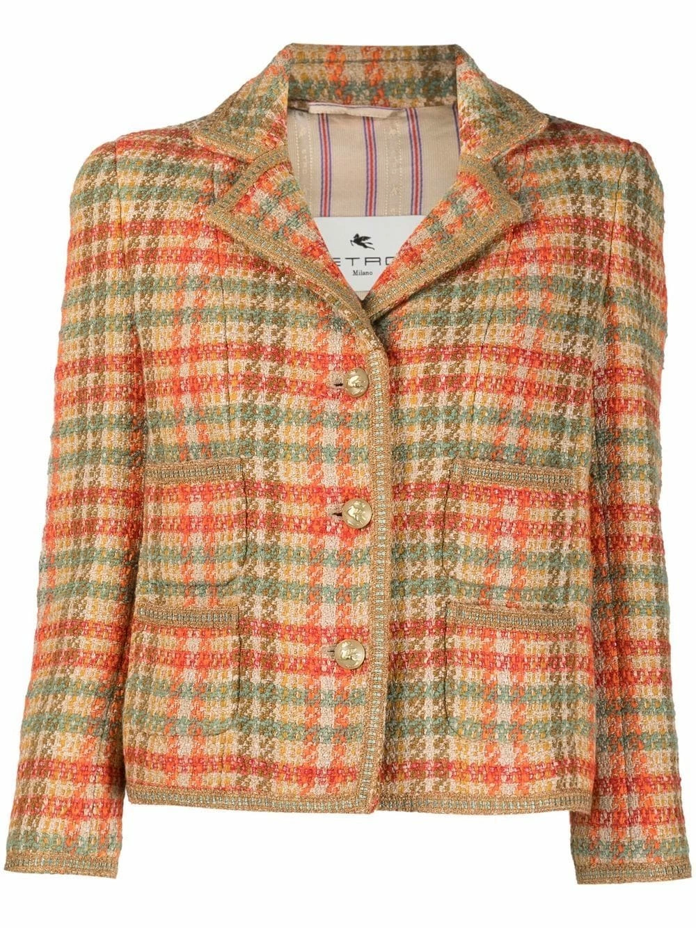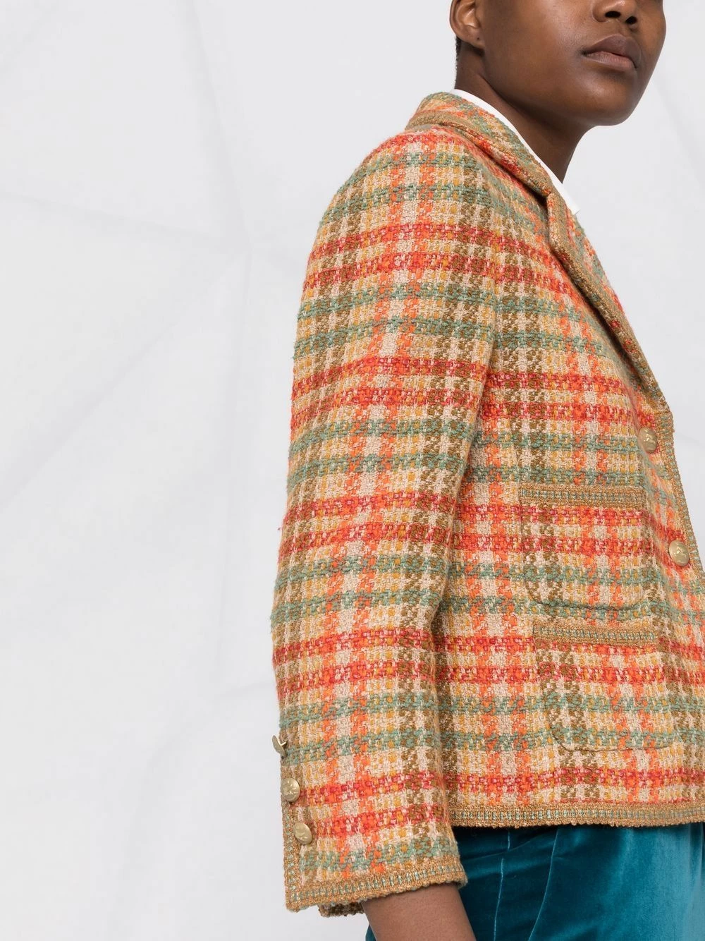 Tweed, carreaux, coupe courte, revers crantés, boutonnière sur le devant, deux poches plaquées avant, manches trois-quarts, manches à poignets boutonnés, ourlet droit.