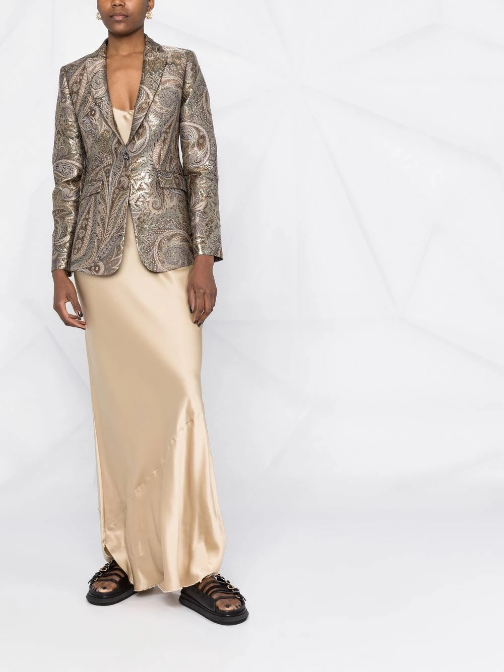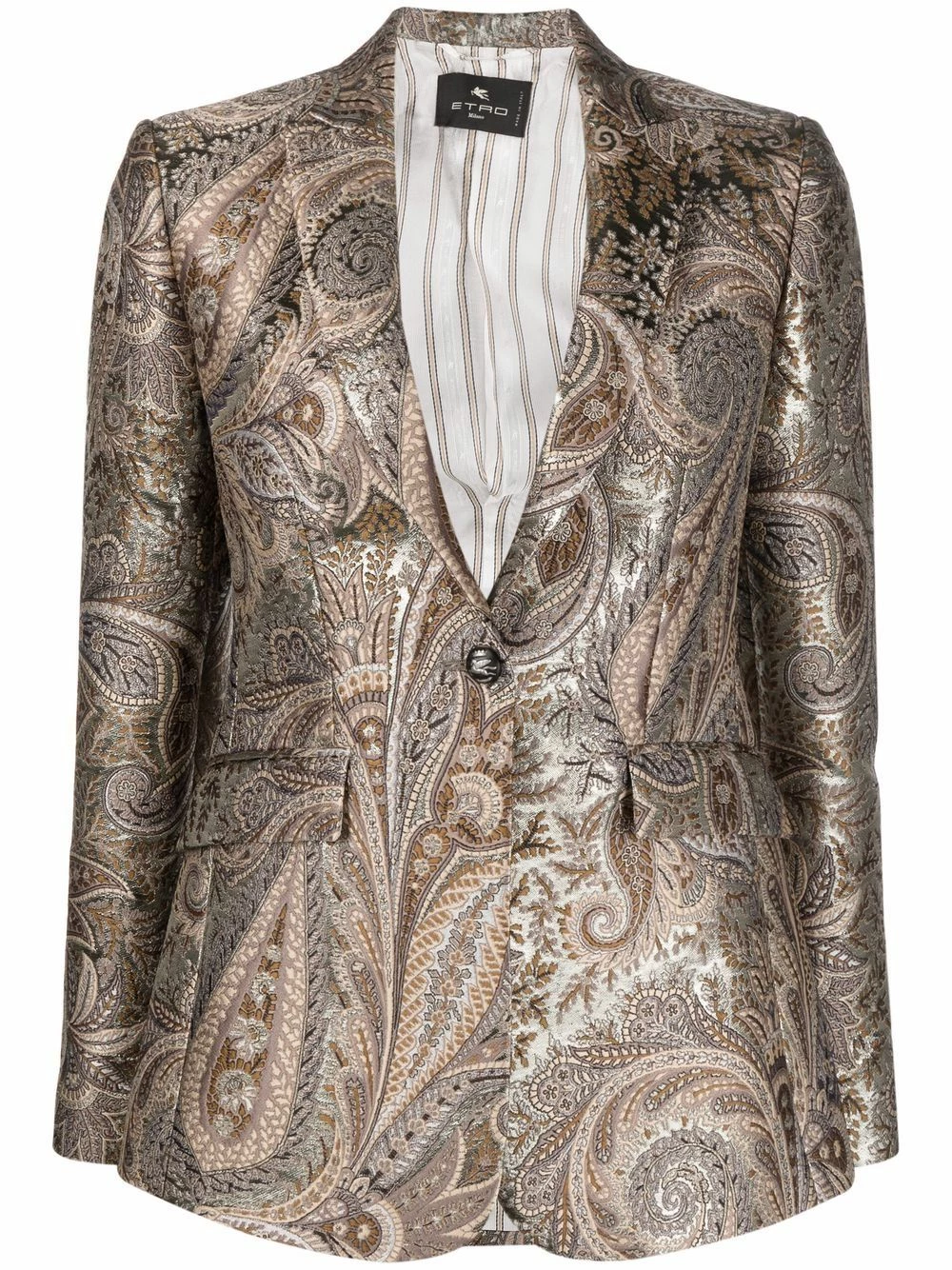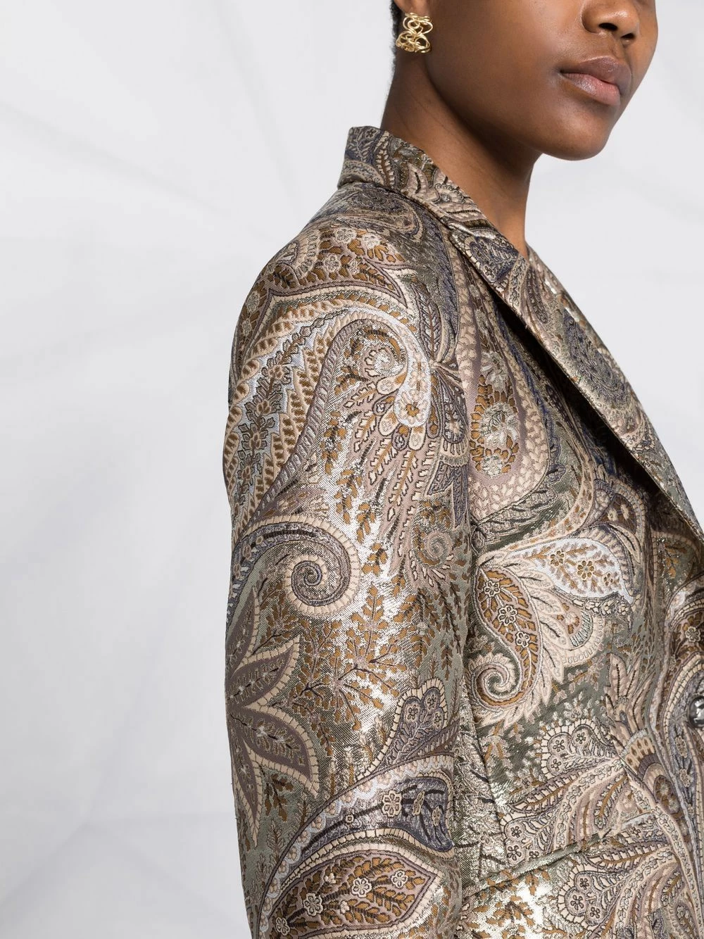 Effet métallisé, jacquard à motifs, motif cachemire, revers pointus, boutonnière sur le devant, manches longues, deux poches à rabat sur le devant.