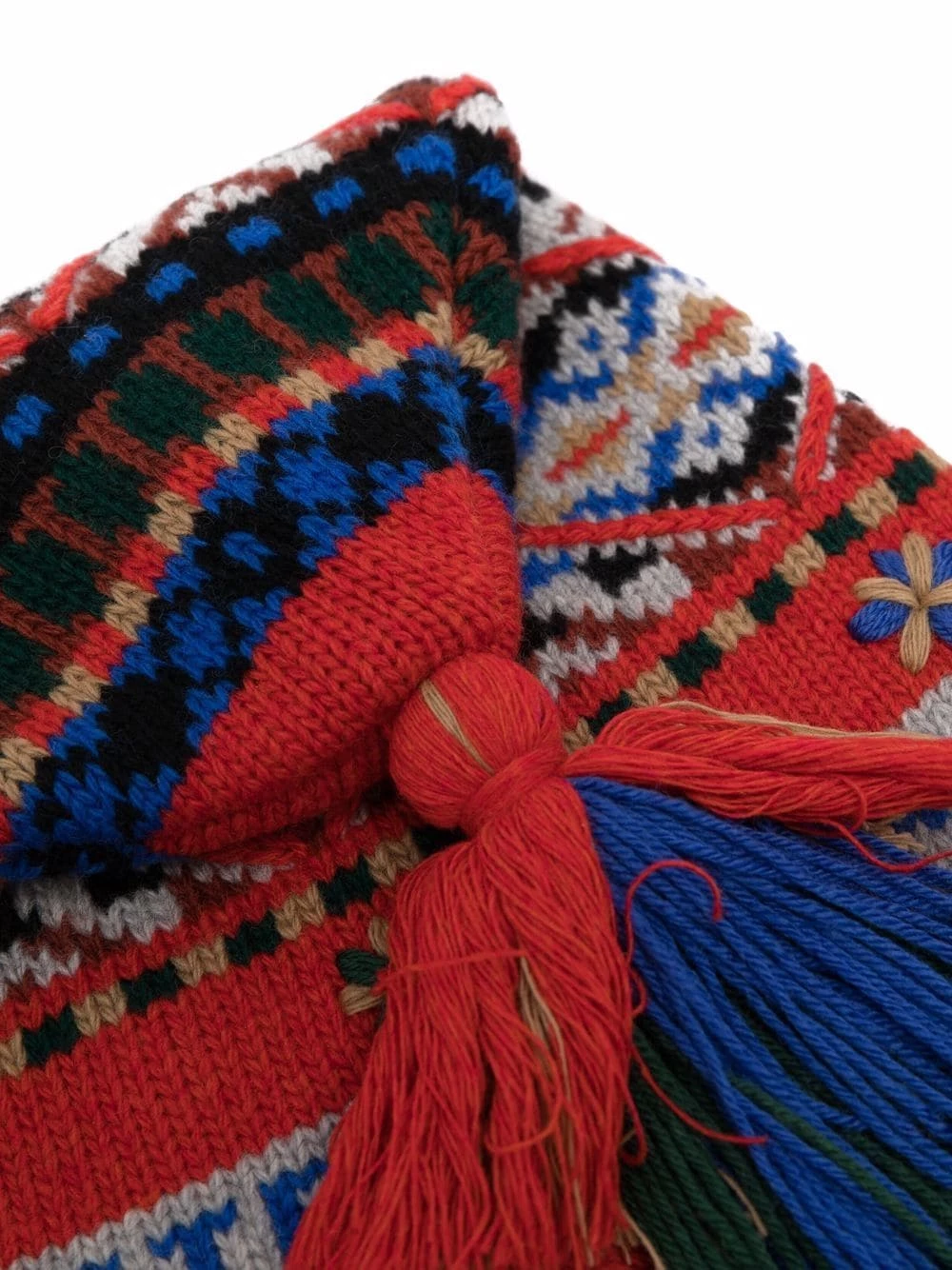 Motif géométrique, détail de pompon, design en maille, bords finis. Matière : laine.