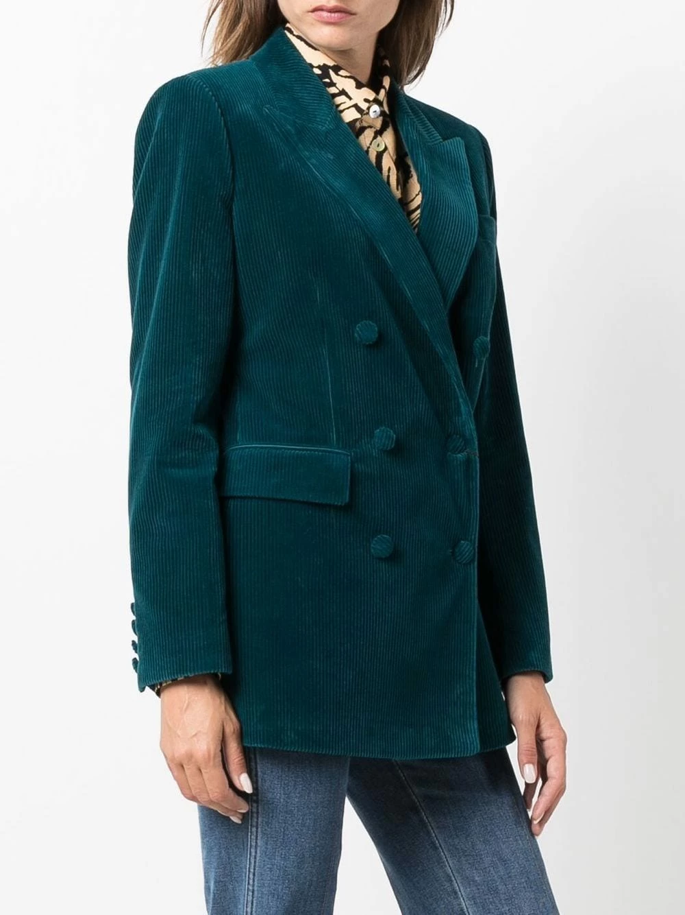 Velours côtelé, revers classiques, boutonnière croisée, manches longues, poche passepoilée sur la poitrine, deux poches à rabat sur le devant. Matière : coton.