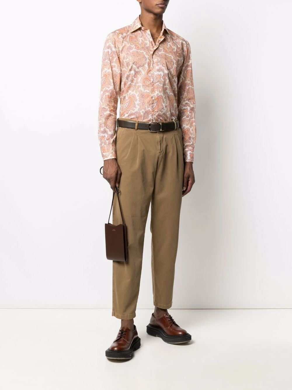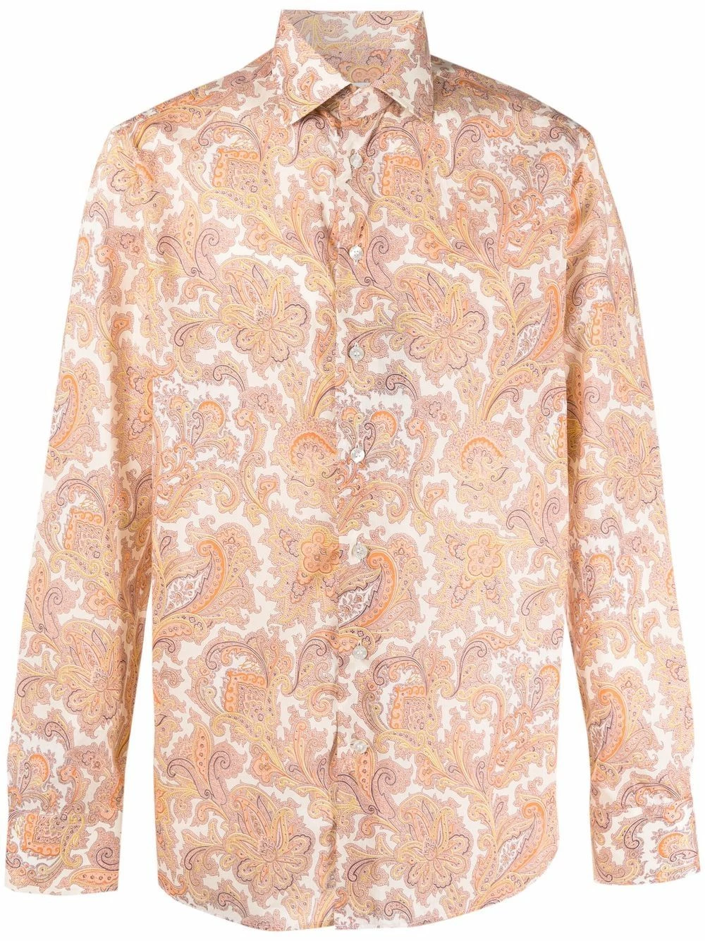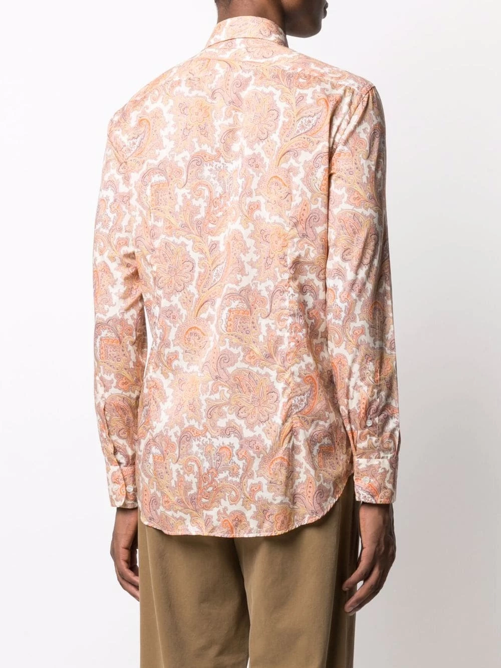Motif cachemire, col classique, boutonnière sur le devant, manches longues, ourlet droit. Couleur : orange. Matière : coton.