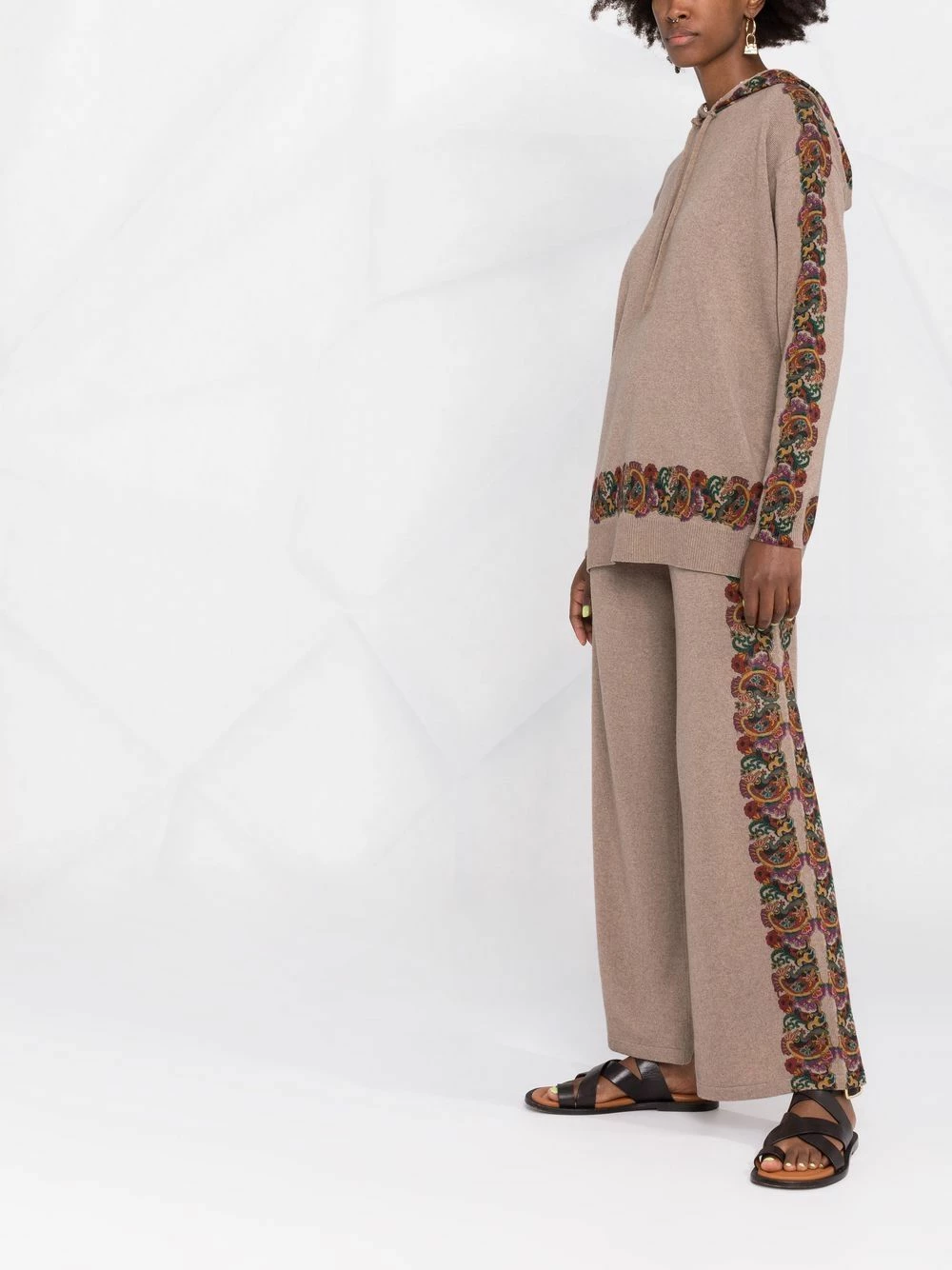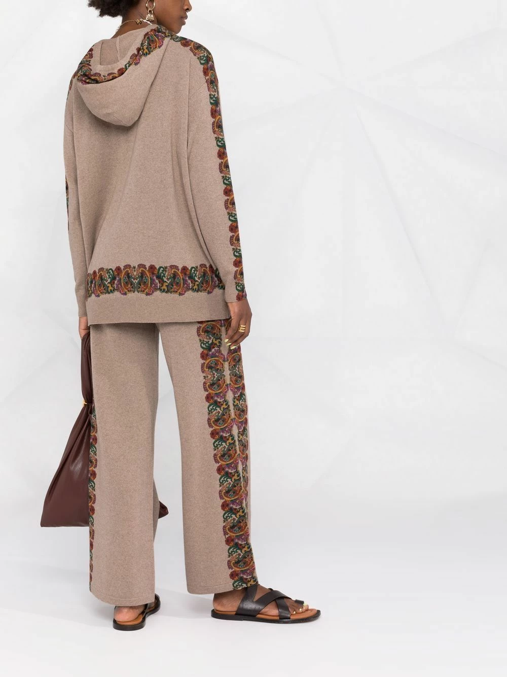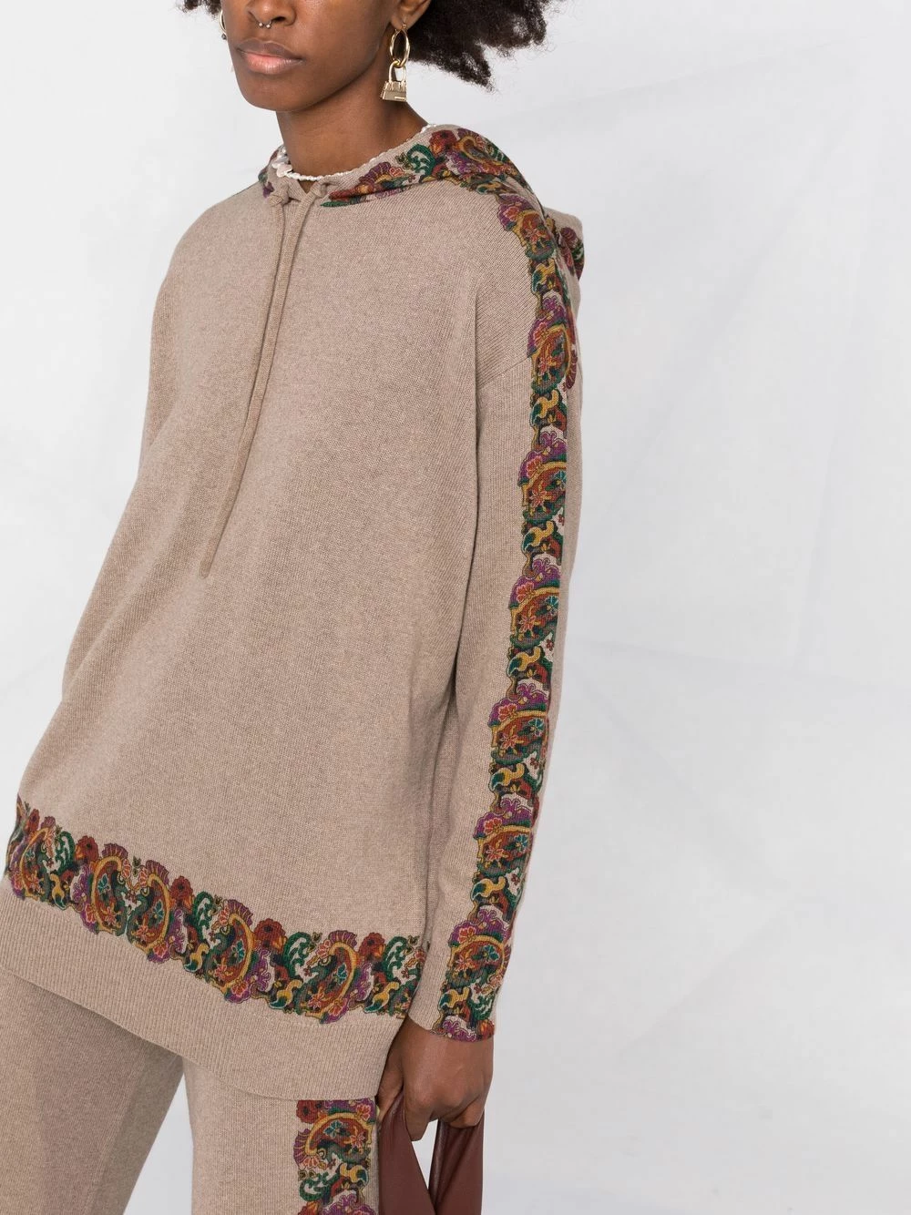 Maille fine, motif cachemire, capuche à lien de resserrage, encolure ronde, manches longues, ourlet droit. Couleur : marron.