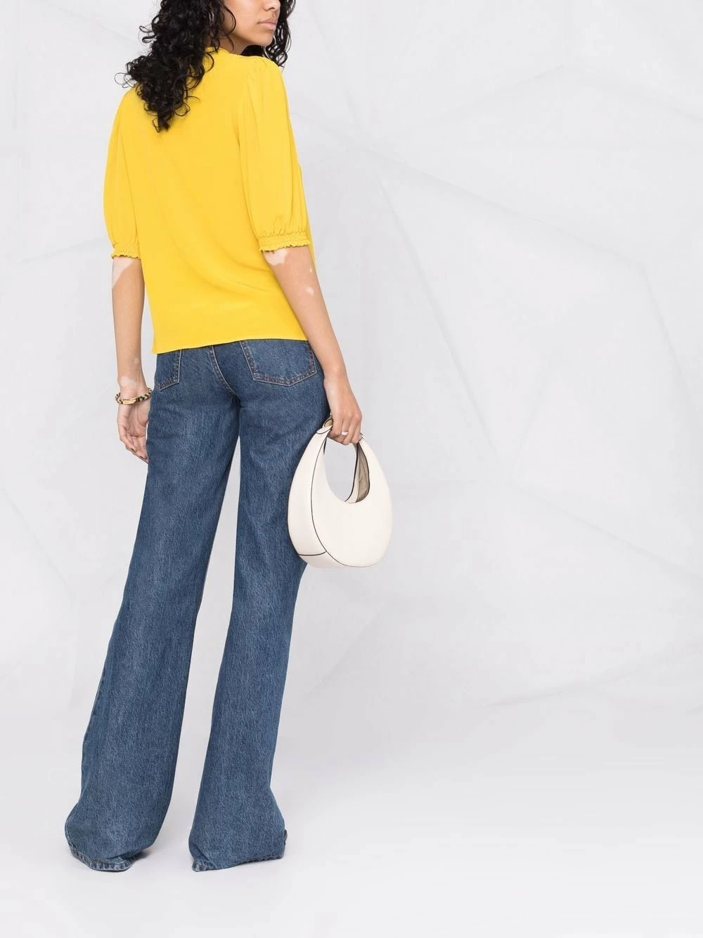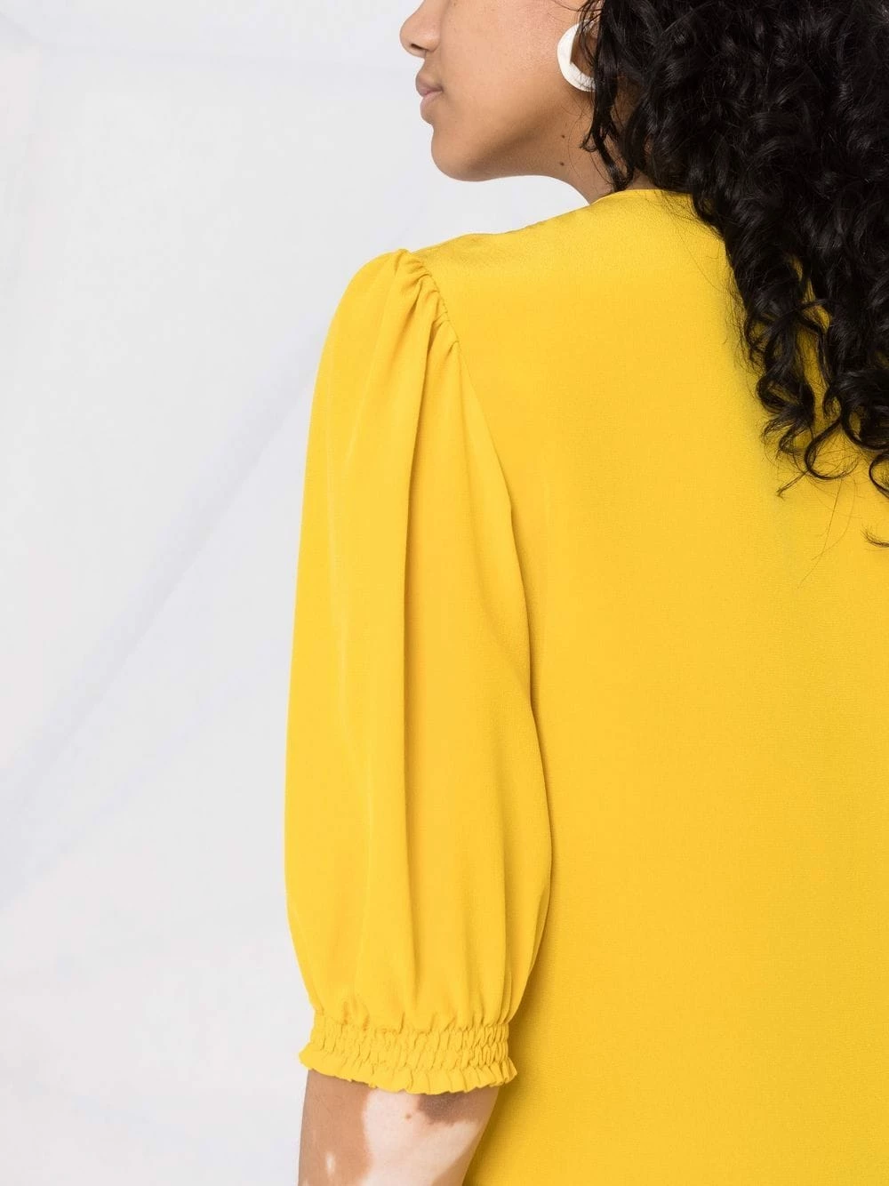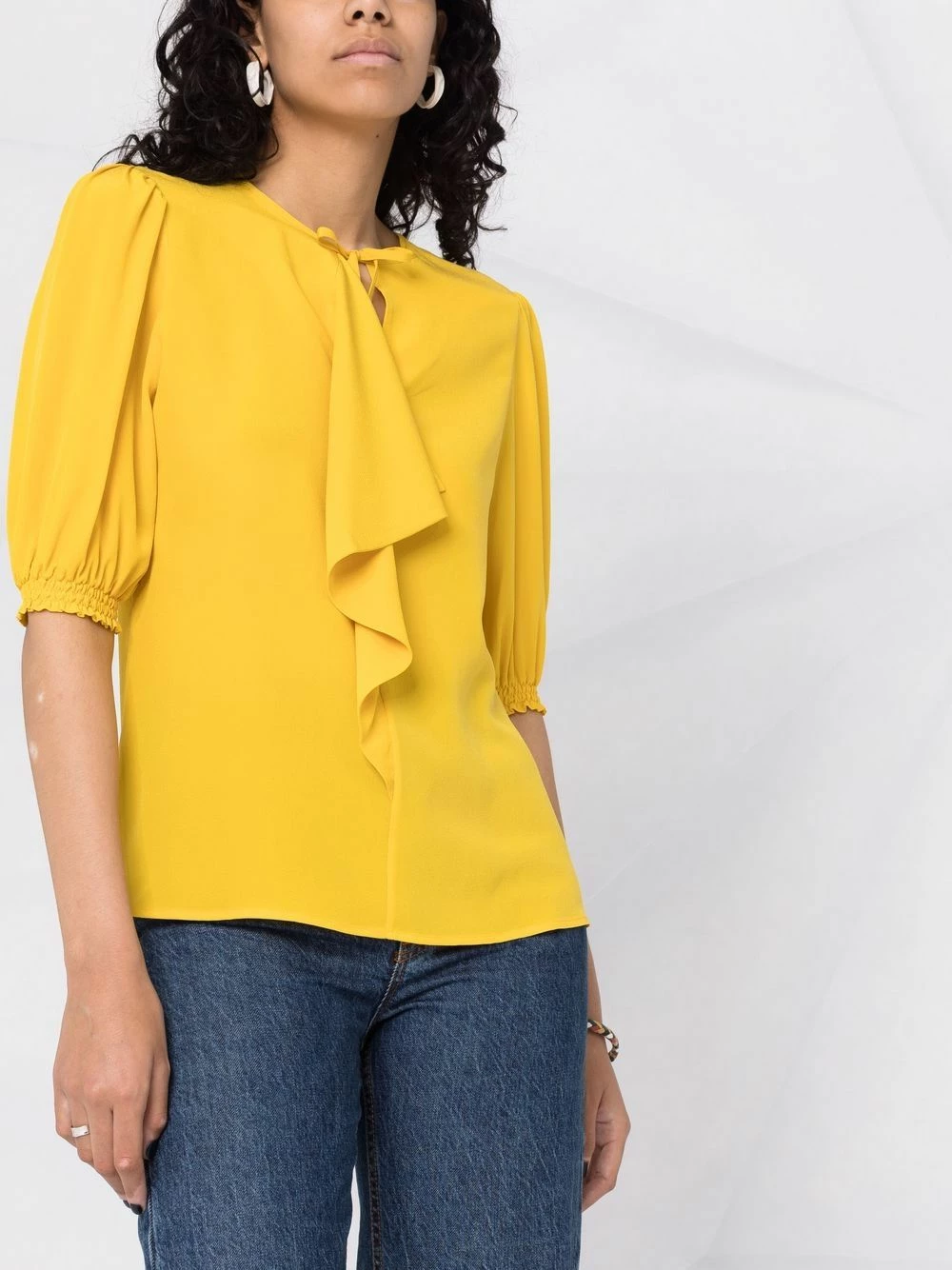 Col lavallière, encolure ronde, manches courtes, ourlet incurvé. Matière : soie.
