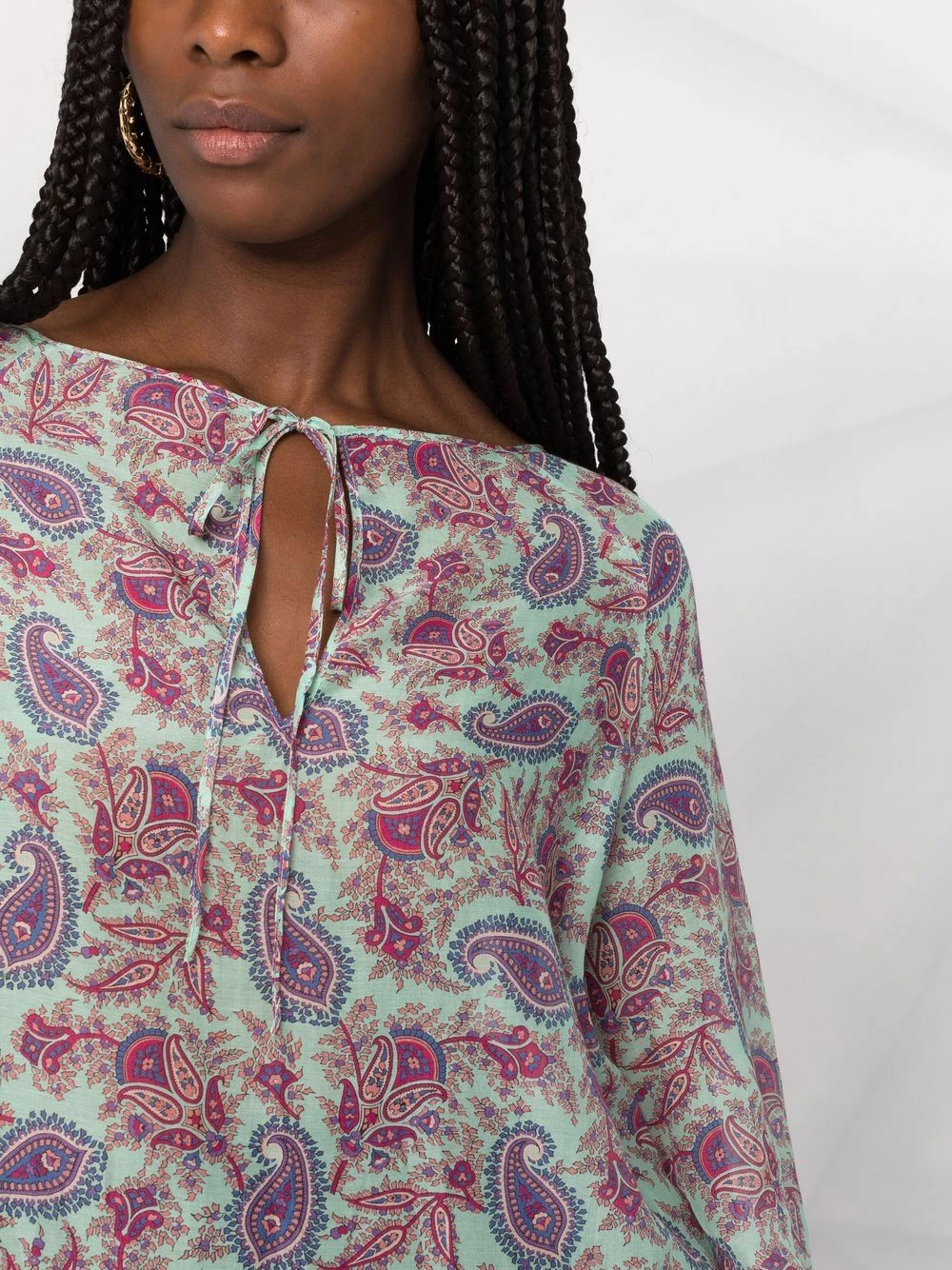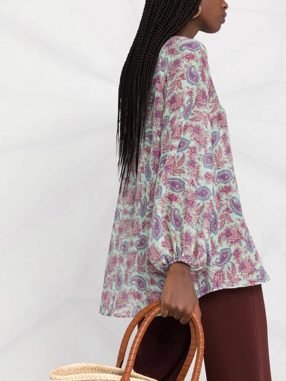 Motif cachemire, col à ouverture goutte d’eau, col v, manches longues, ourlet droit.