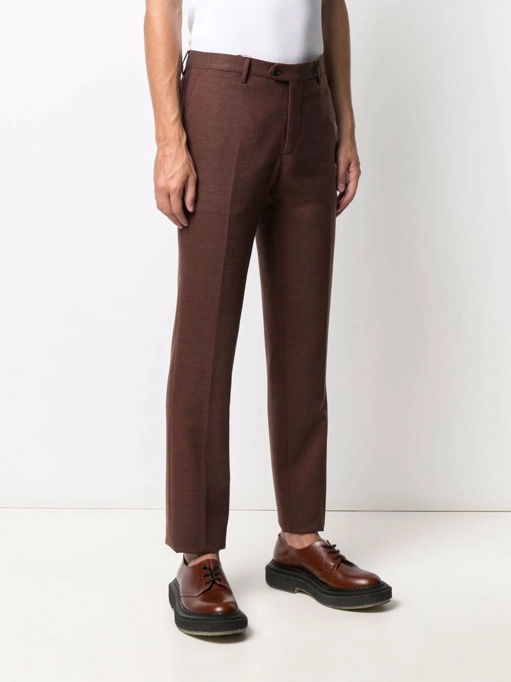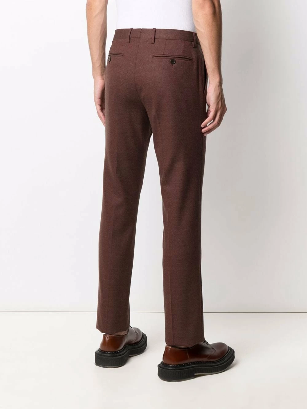 Coupe cintrée, passants de ceinture, plis marqués, fermeture à braguette dissimulée et bouton, poches latérales fendues, deux poches passepoilées boutonnées à l’arrière.