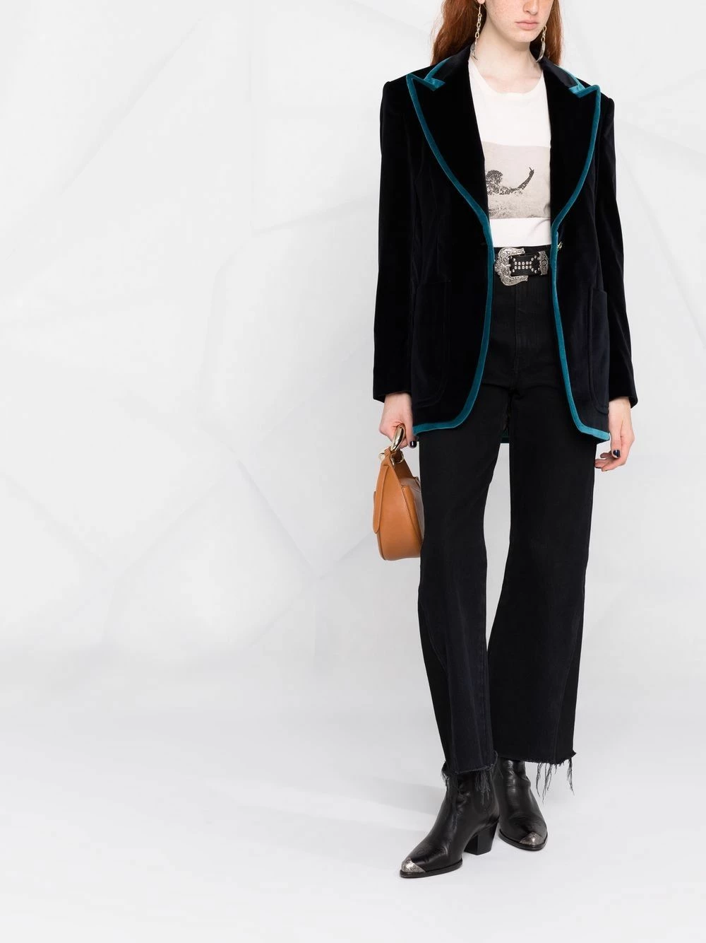 Bordure contrastante, larges revers pointus, boutonnière sur le devant, manches longues, poignets boutonnés, poche poitrine passepoilée, deux poches plaquées avant, ourlet droit.