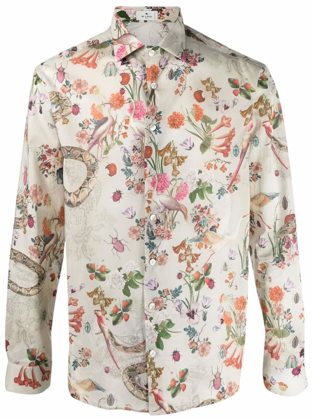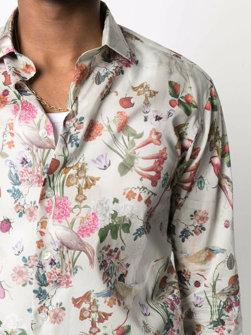 Motif de fleurs, col classique, boutonnière sur le devant, manches longues, poignets boutonnés. Matière : coton.