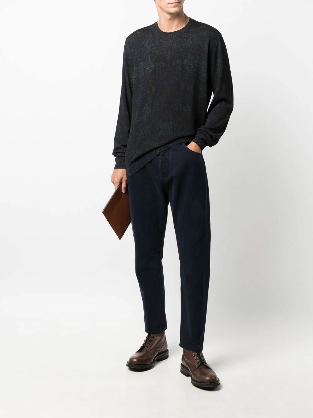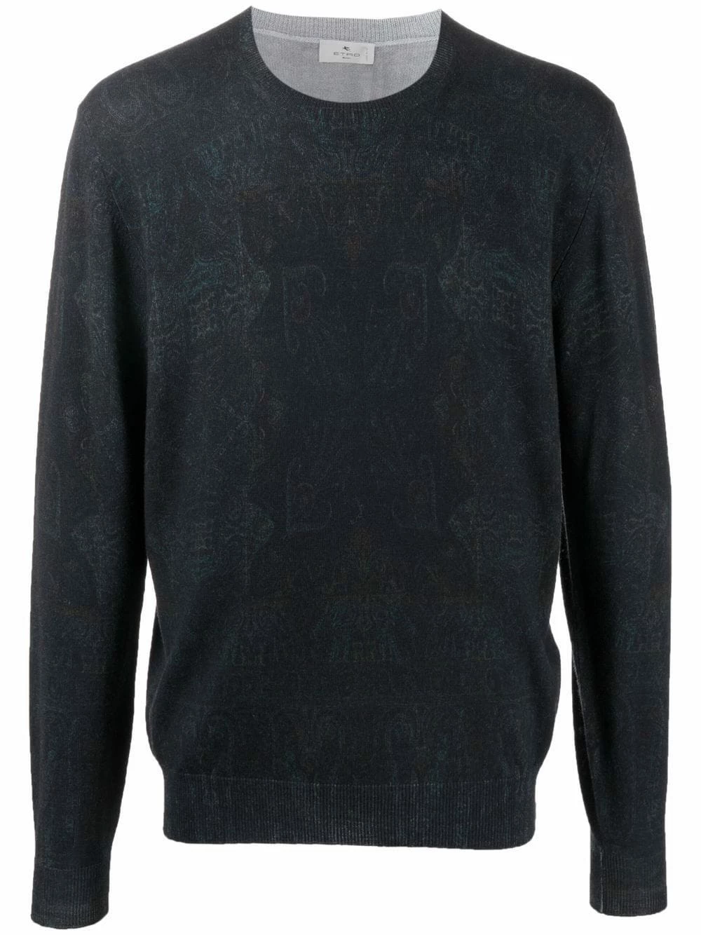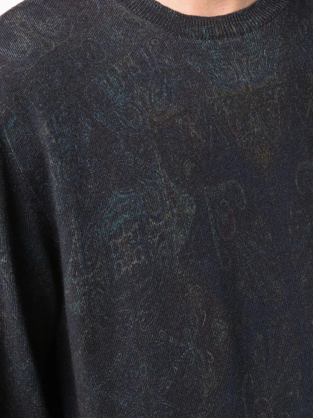 Effet usé, motif cachemire, encolure ras du cou, manches longues, ourlet droit. Couleur : noir. Matière : laine vierge.