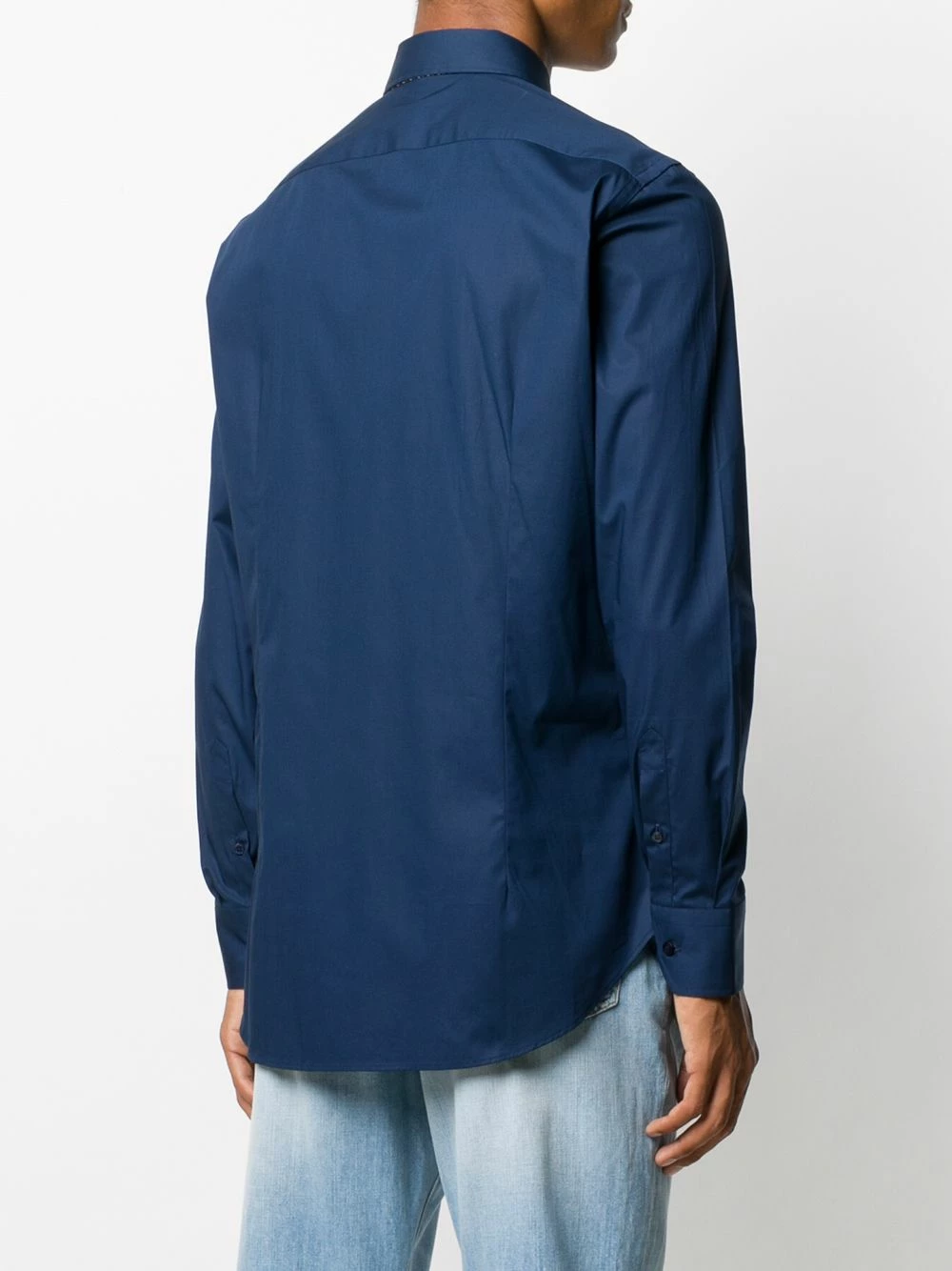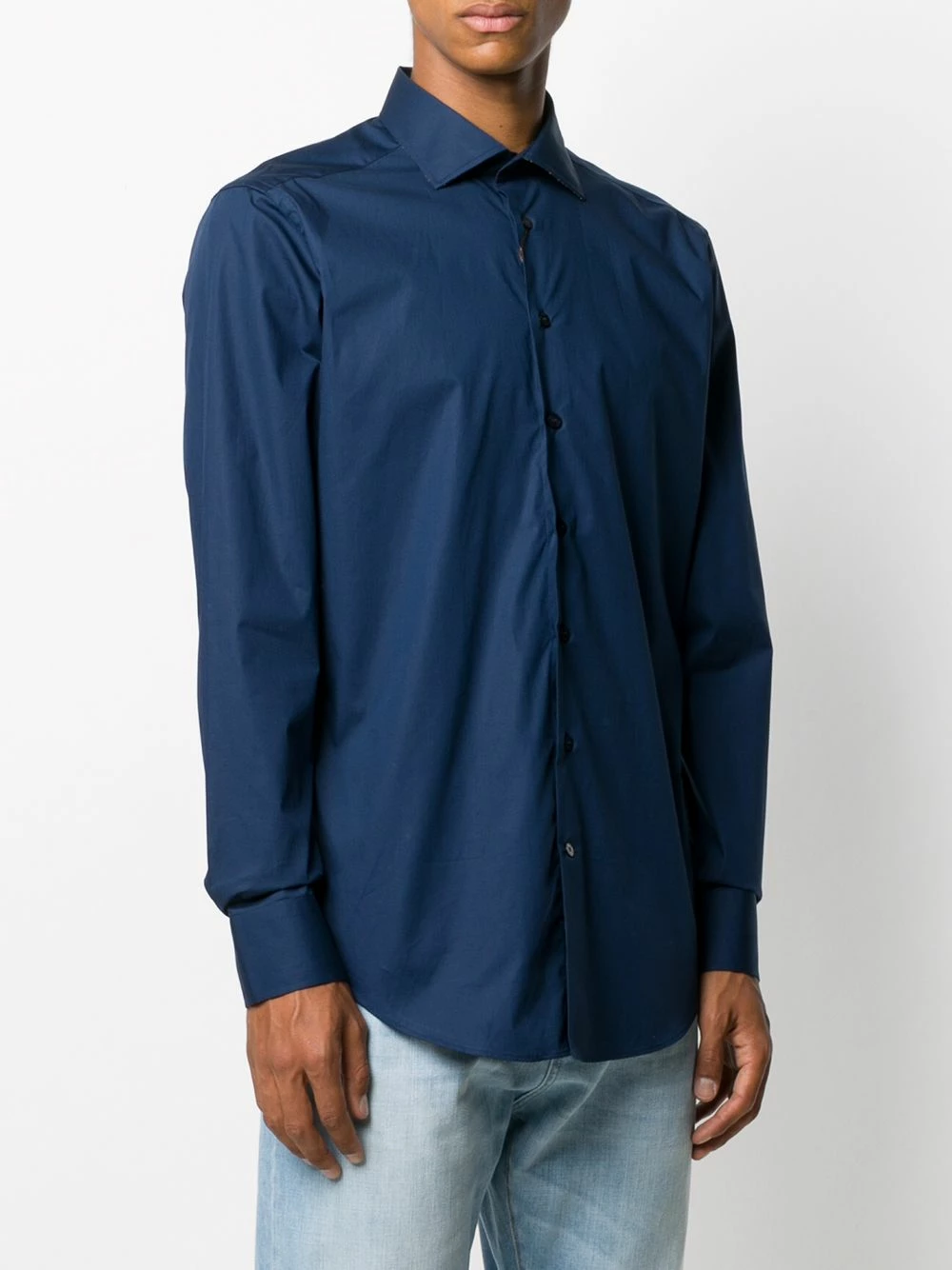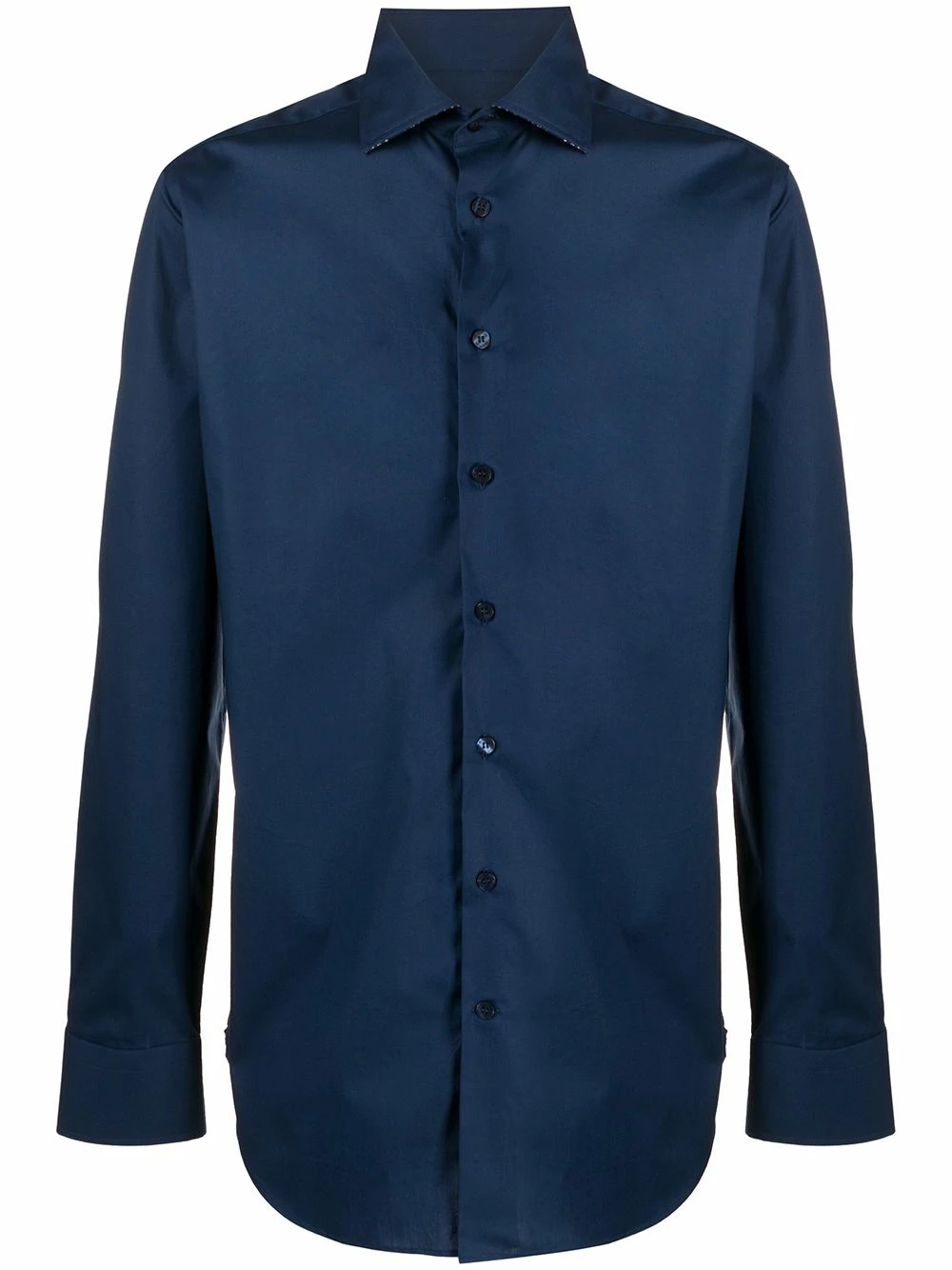 Col à découpe, patte de boutonnage sur le devant, manches longues, ourlet incurvé. Couleur : bleu.