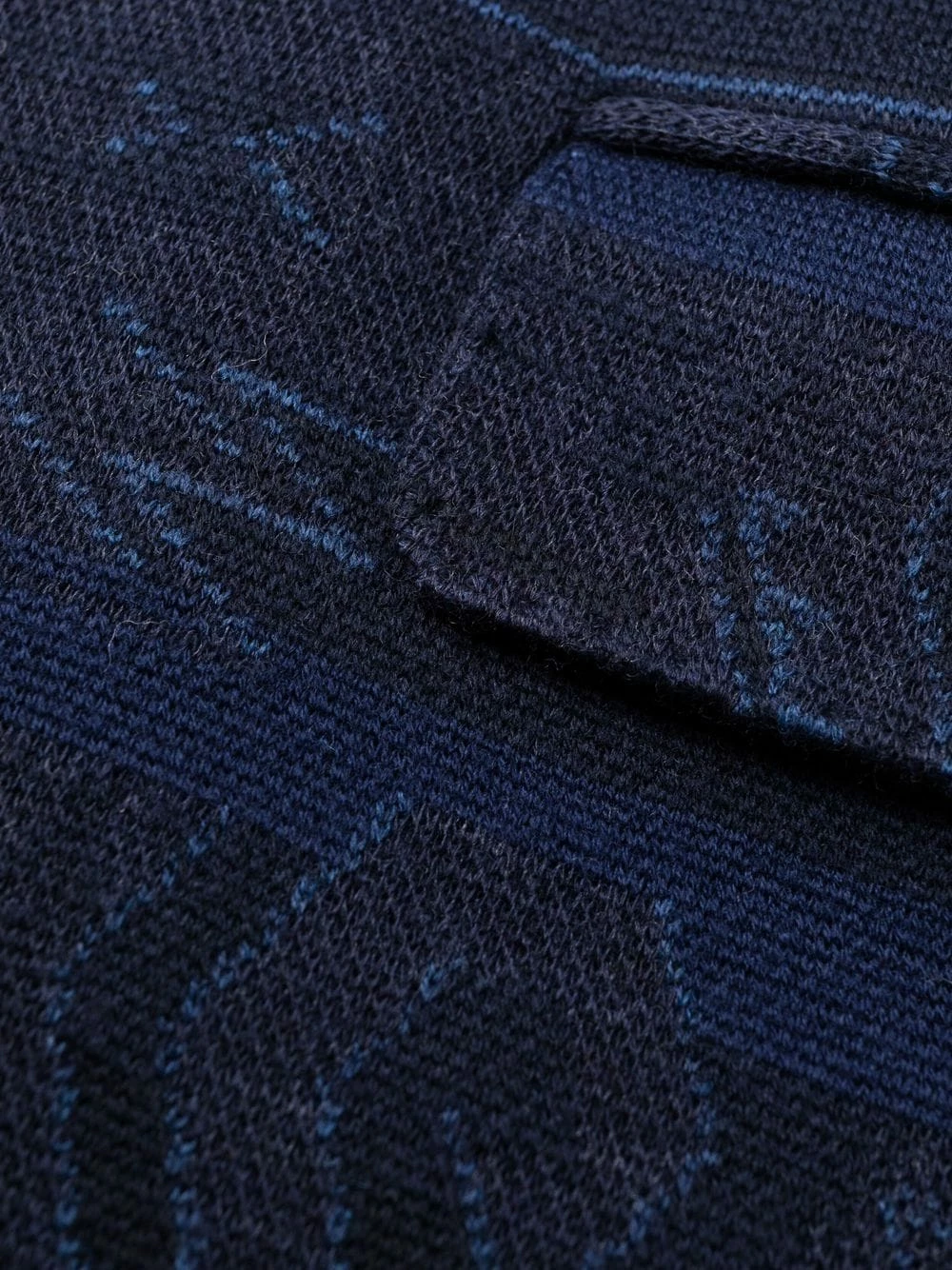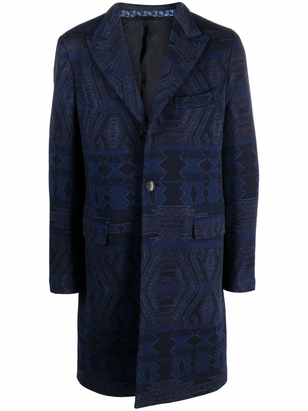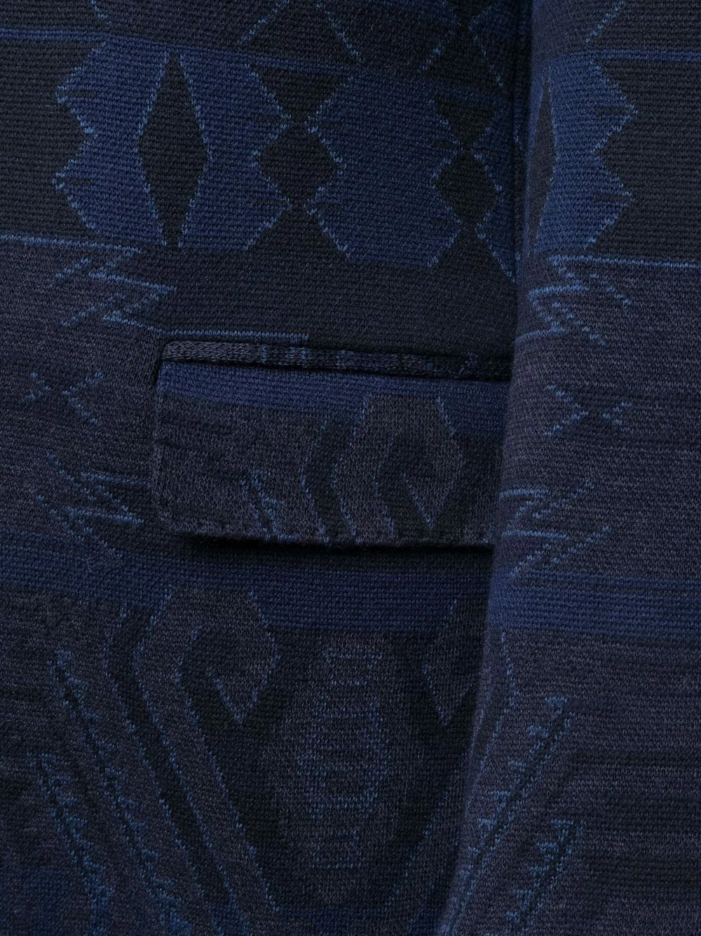 Jacquard à motifs, revers pointus, poche passepoilée sur la poitrine, deux poches à rabat sur le devant, manches longues, poignets boutonnés, fente à l’arrière, ourlet droit, coupe mi-longue.