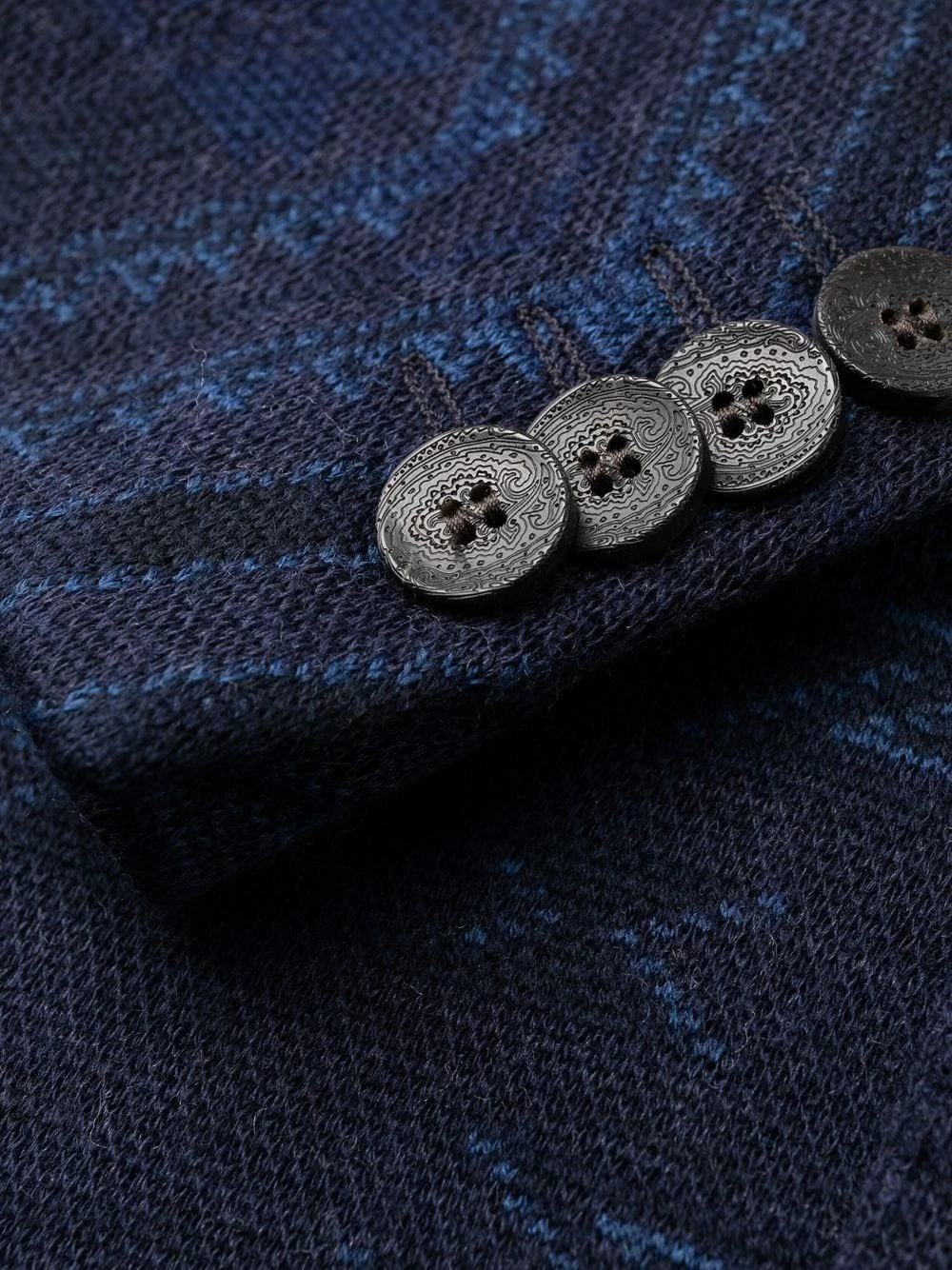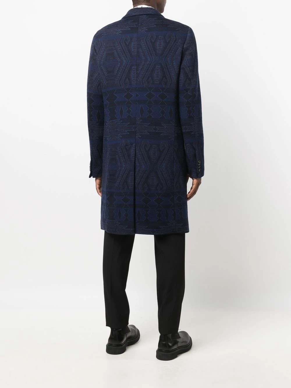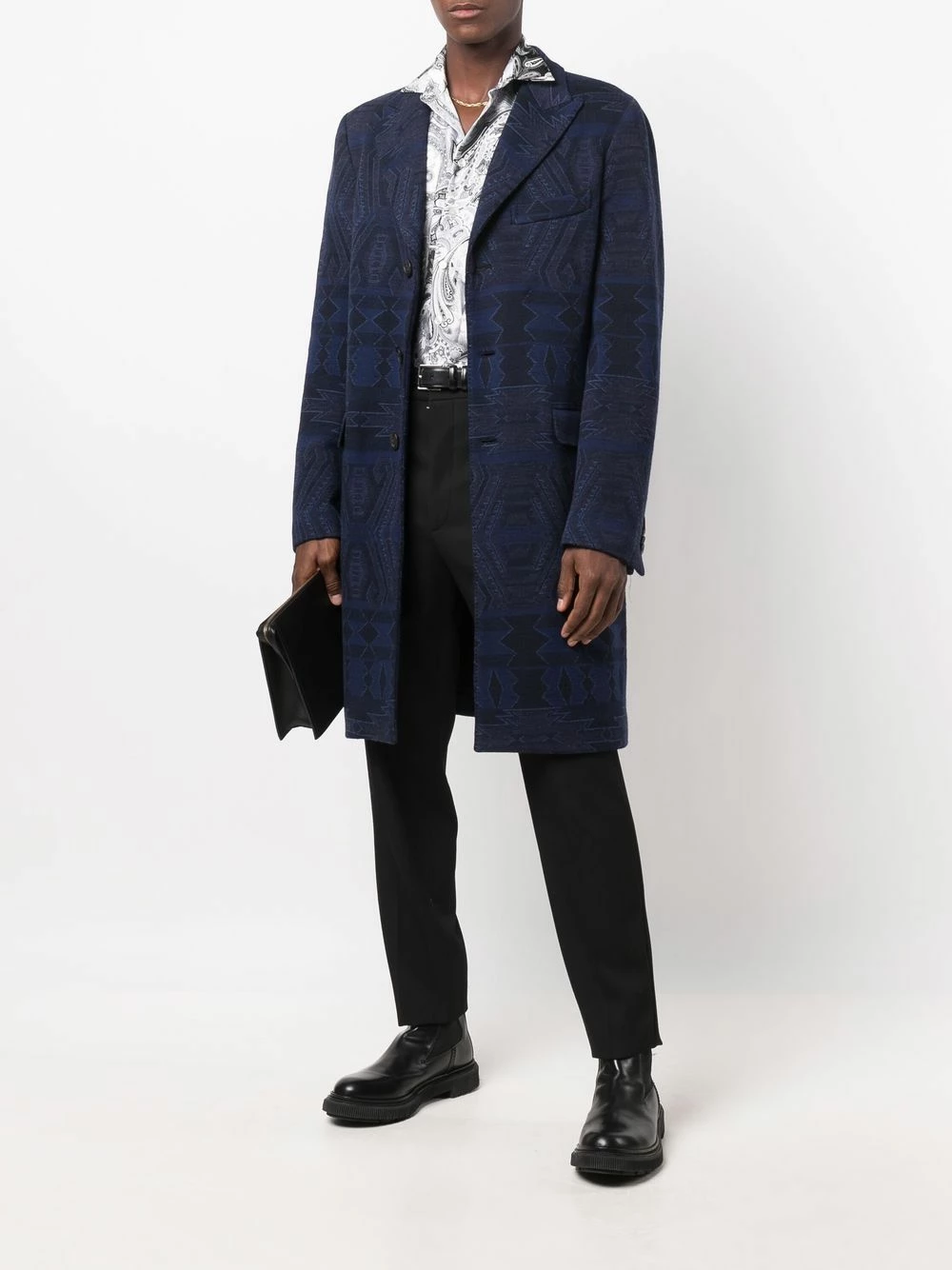 Jacquard à motifs, revers pointus, poche passepoilée sur la poitrine, deux poches à rabat sur le devant, manches longues, poignets boutonnés, fente à l’arrière, ourlet droit, coupe mi-longue.