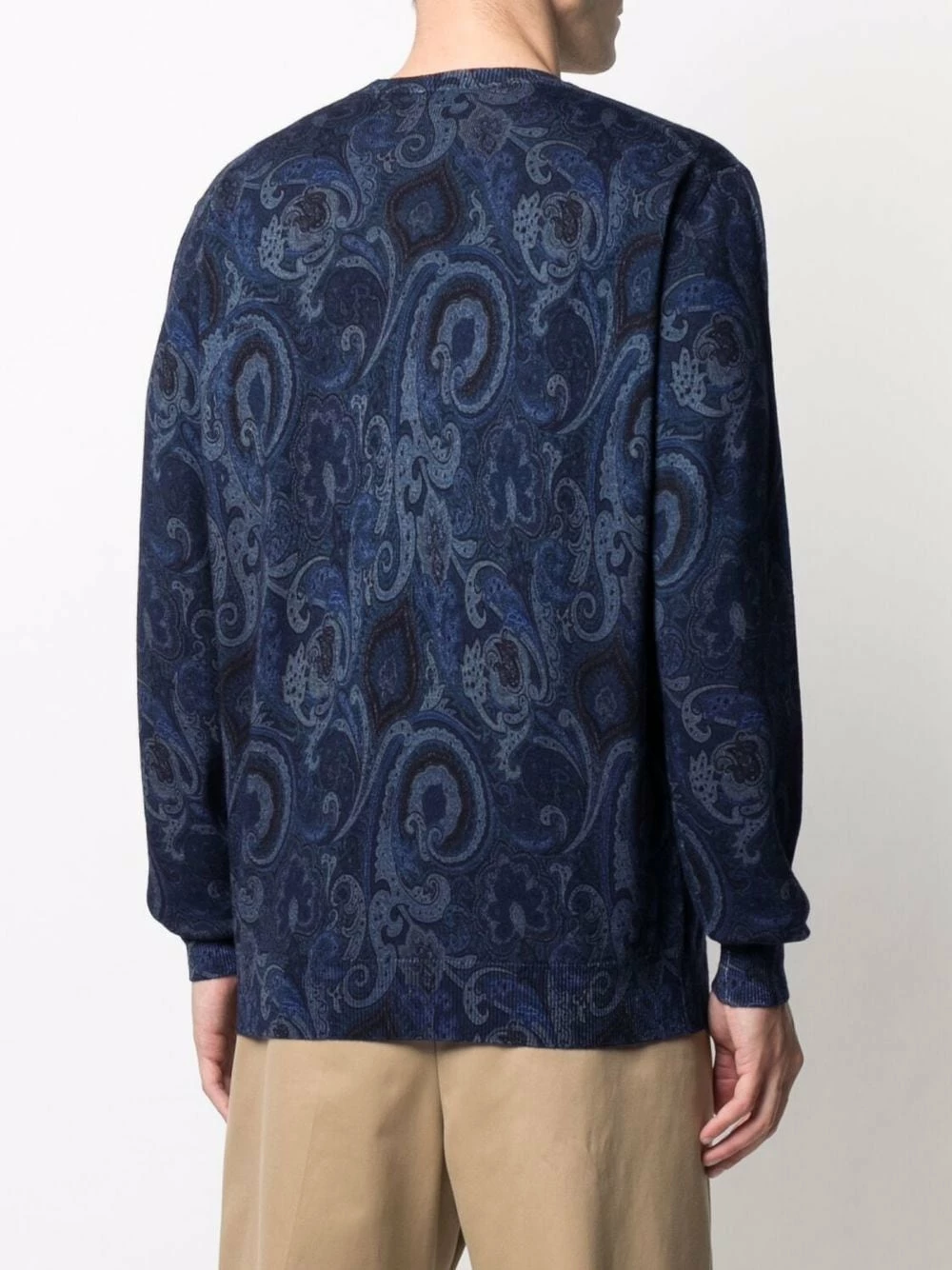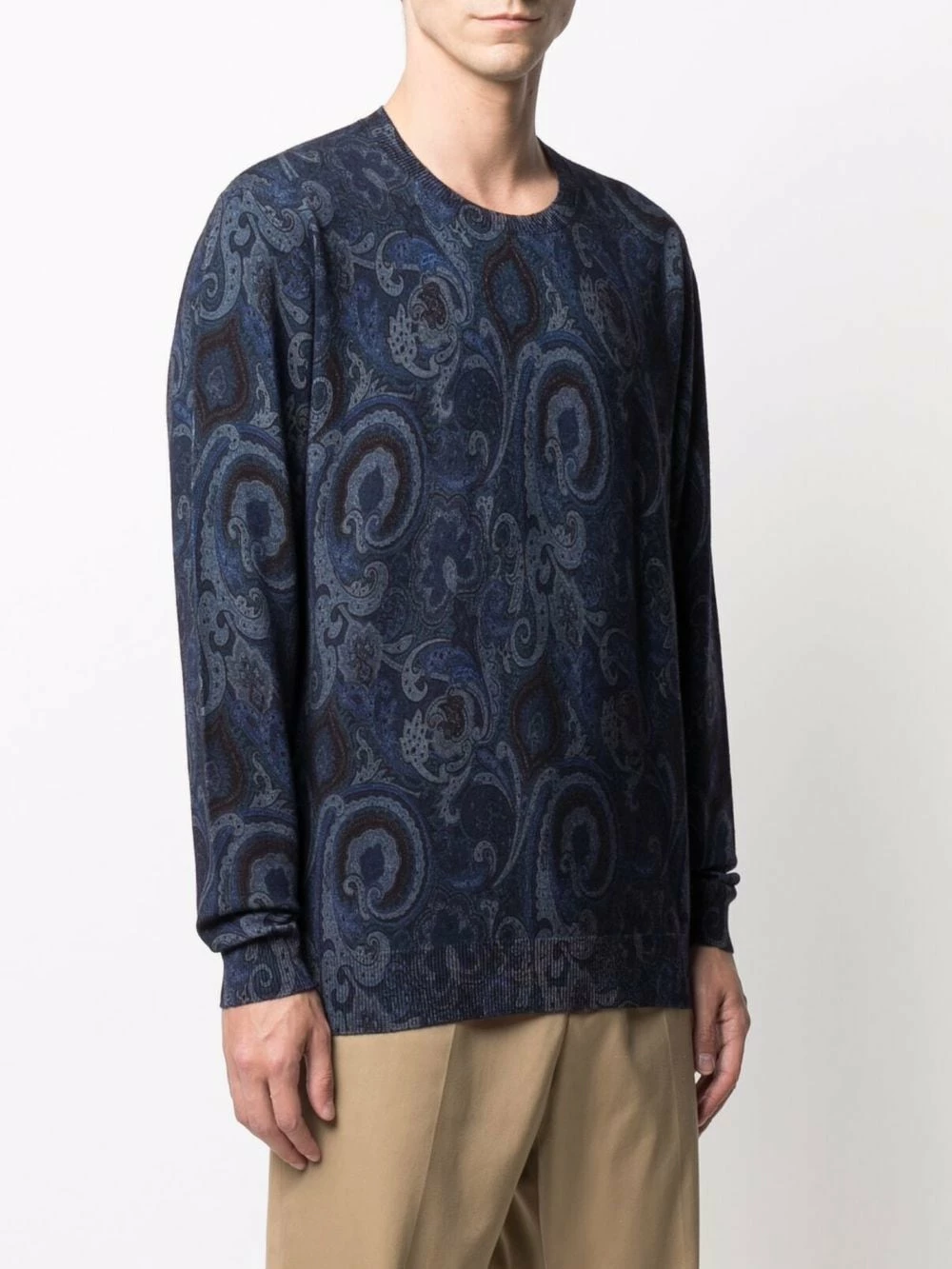 Motif cachemire, design tricoté, manches longues, encolure ronde. Couleur : bleu. Matière : laine vierge.